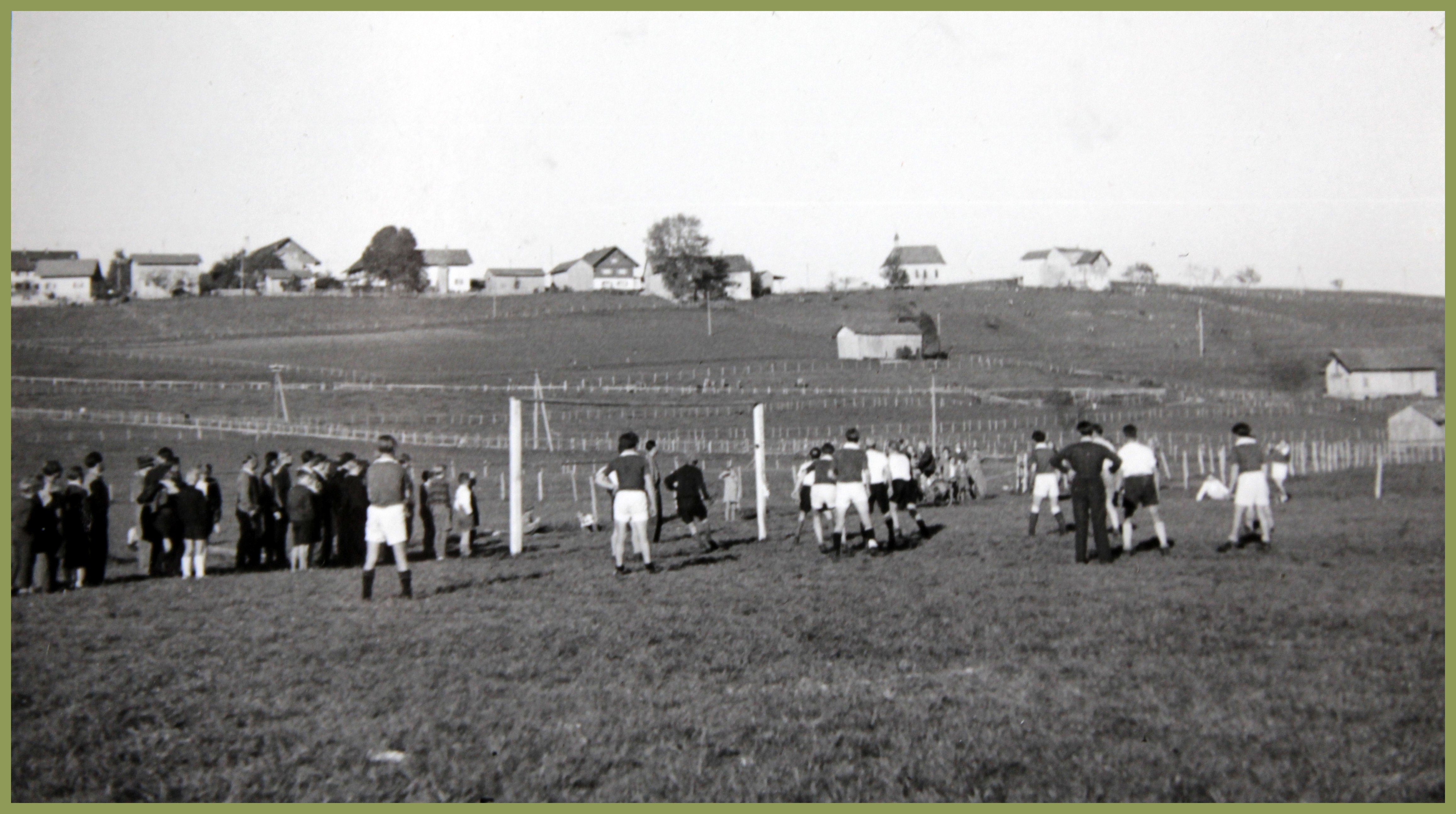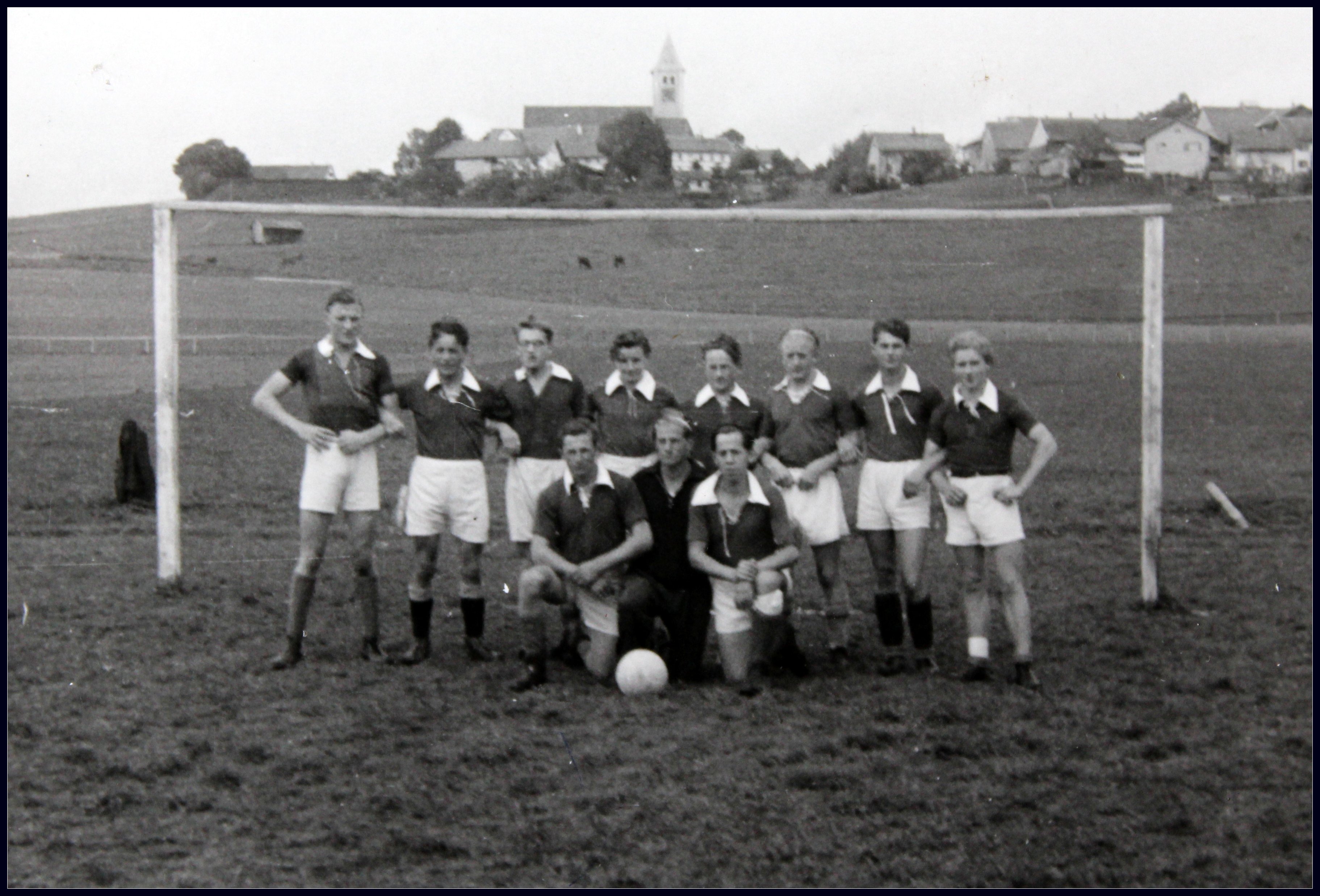 - 1950 Fußballmannschaft des TSV Altusried. Hemd oder Unterhemd sind das Trikot. Von links nach rechts: Kellner Luis, Hartmann Franz, Bösele Hermann, Graf Hans, Geißelmann Anton, Wolfgang Xaver. Kniend: Gruber Franz, Klaffke Helmut mit Schlägerkappe und Hartmann Rudi.