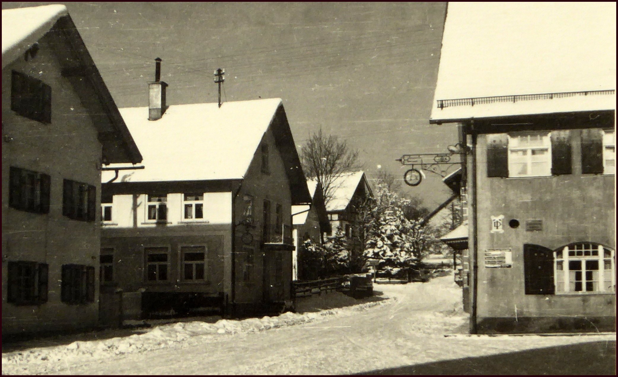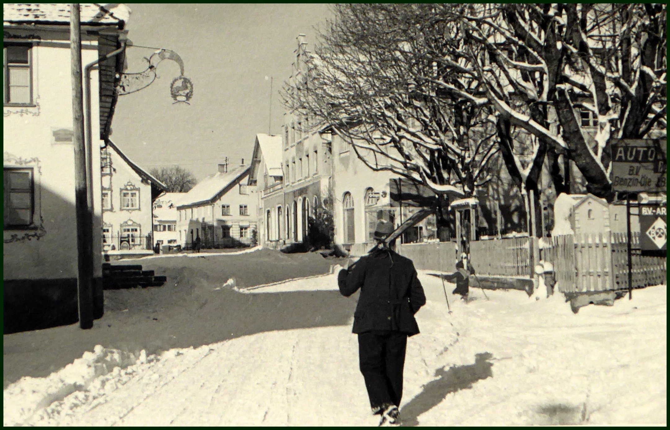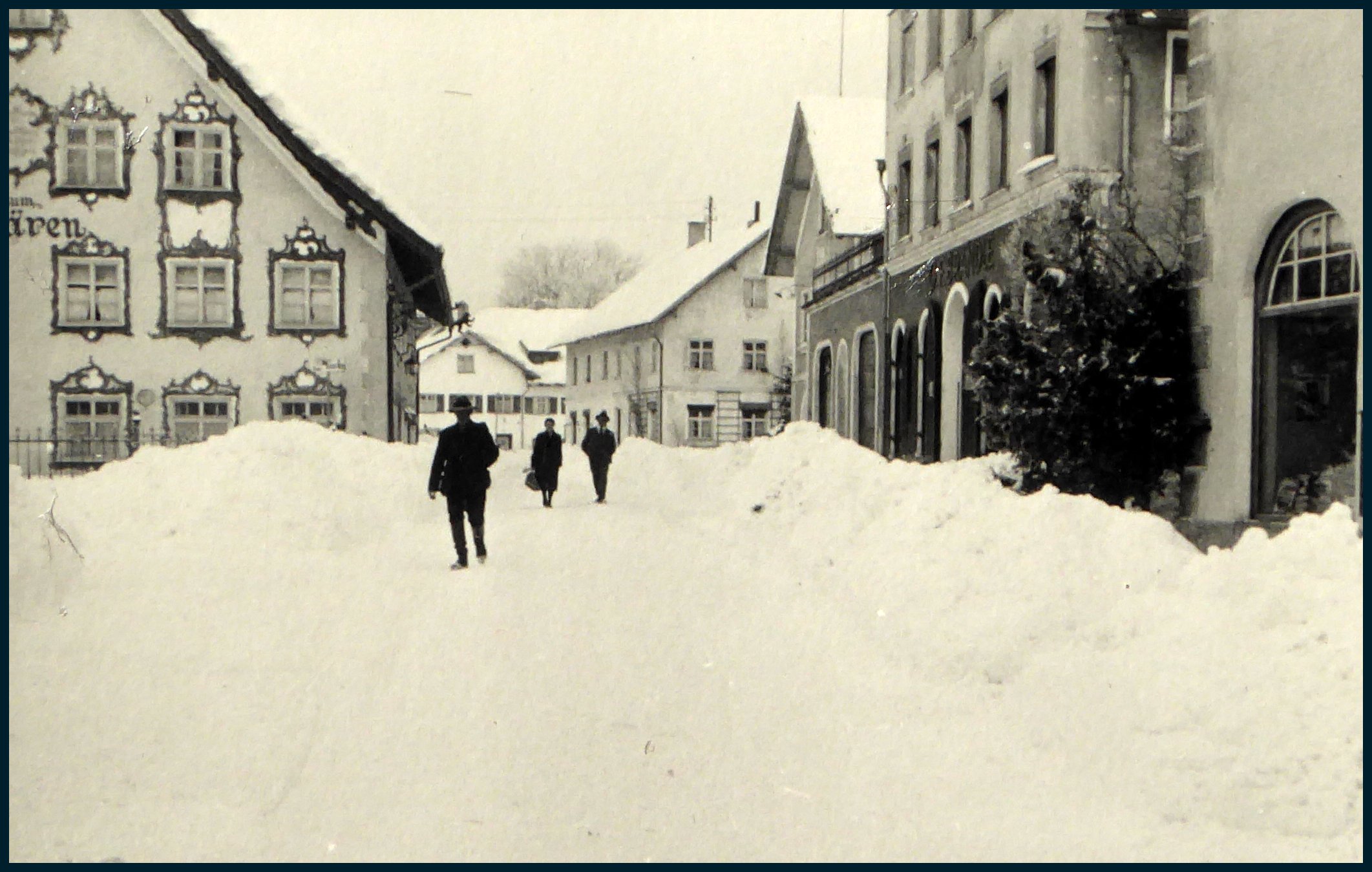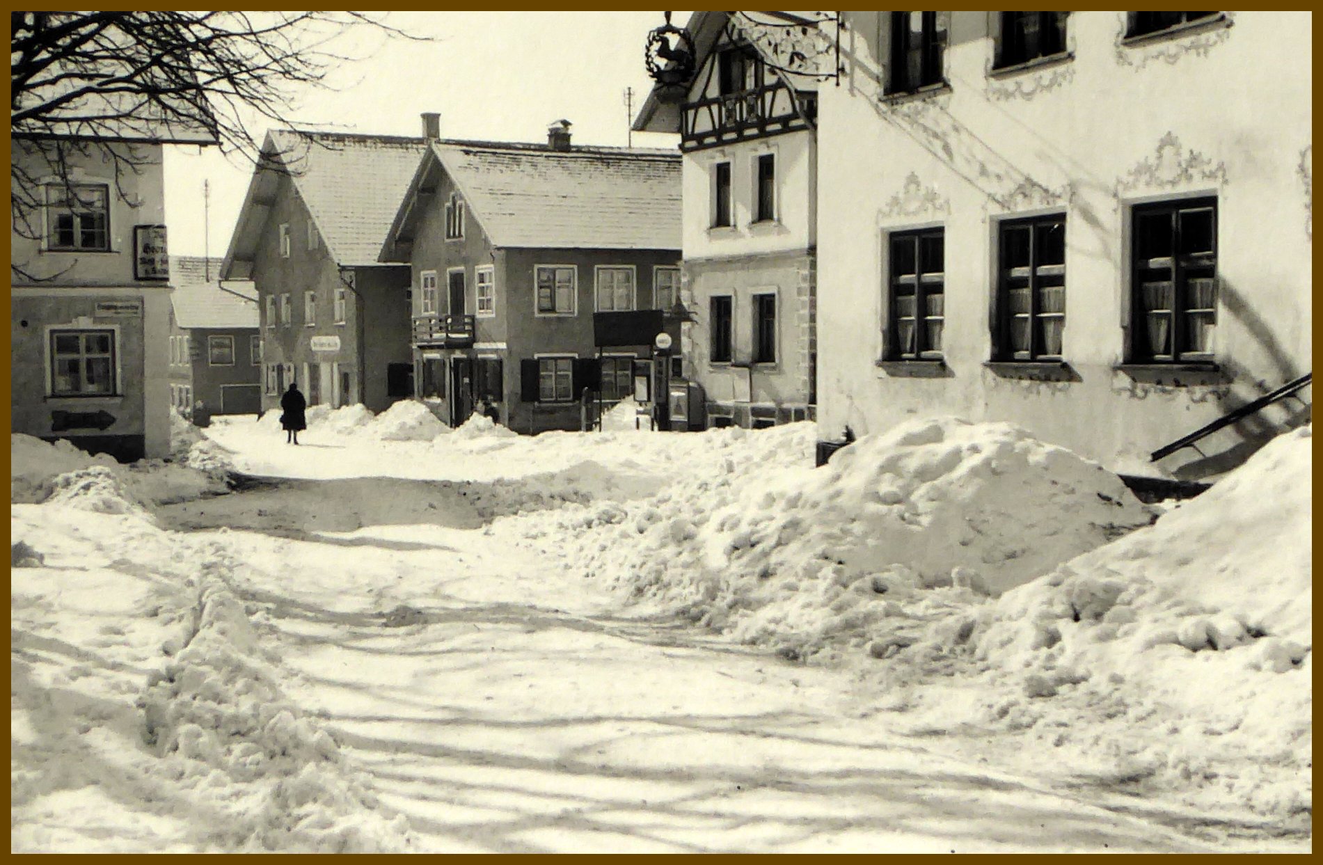 Auch Strom- und Telefonmasten mit den weißen Isolatoren prägten früher das Ortsbild. Maler aus dem Oberbayrischem umrandeten in den Dreißigerjahren die Fenster des Bären im Barockstil.