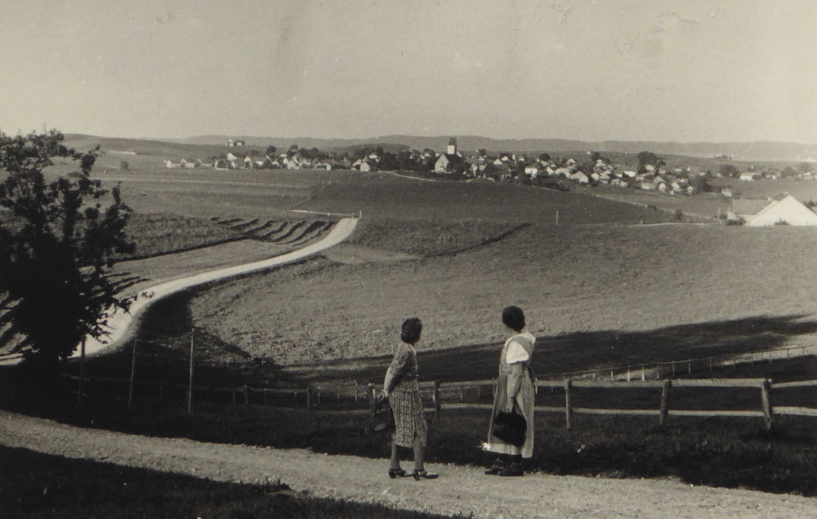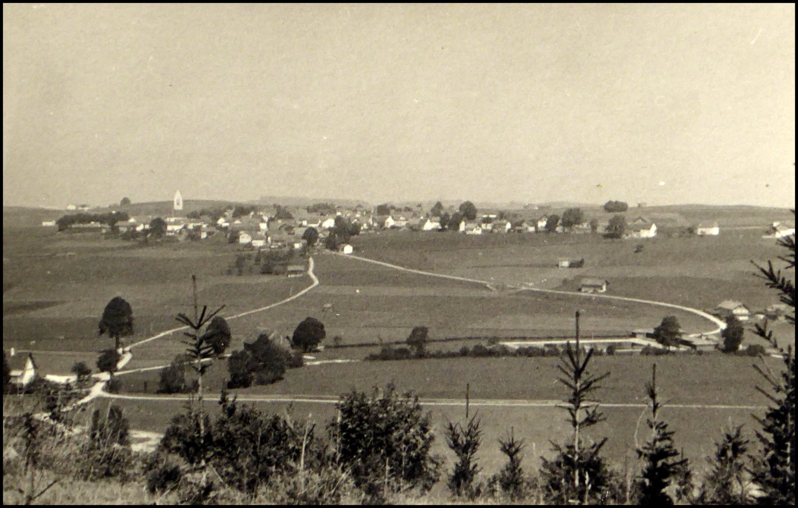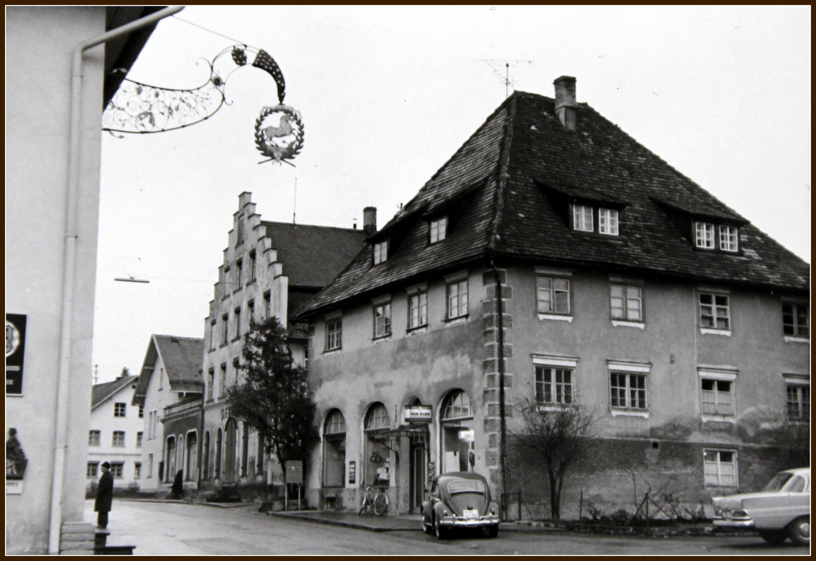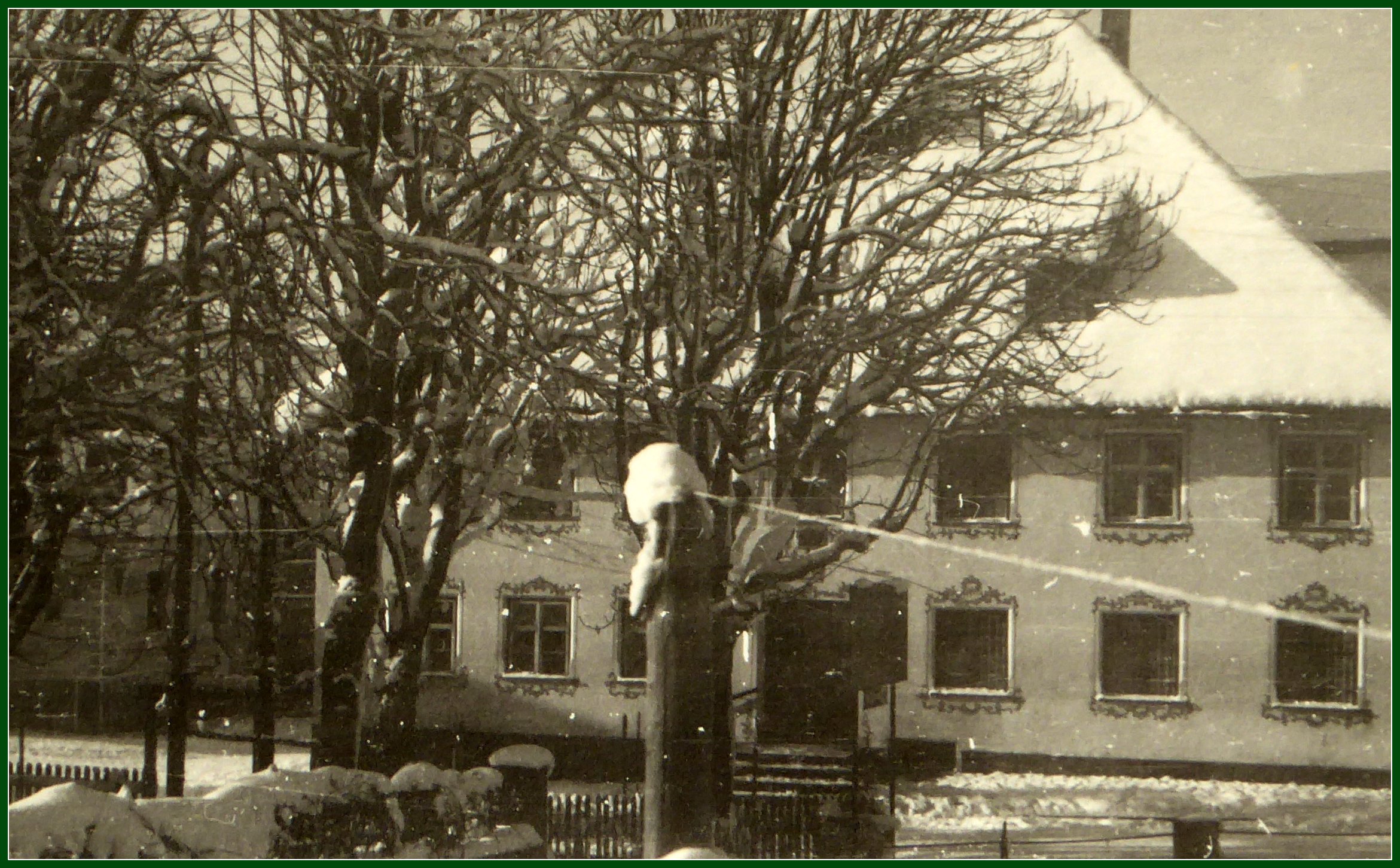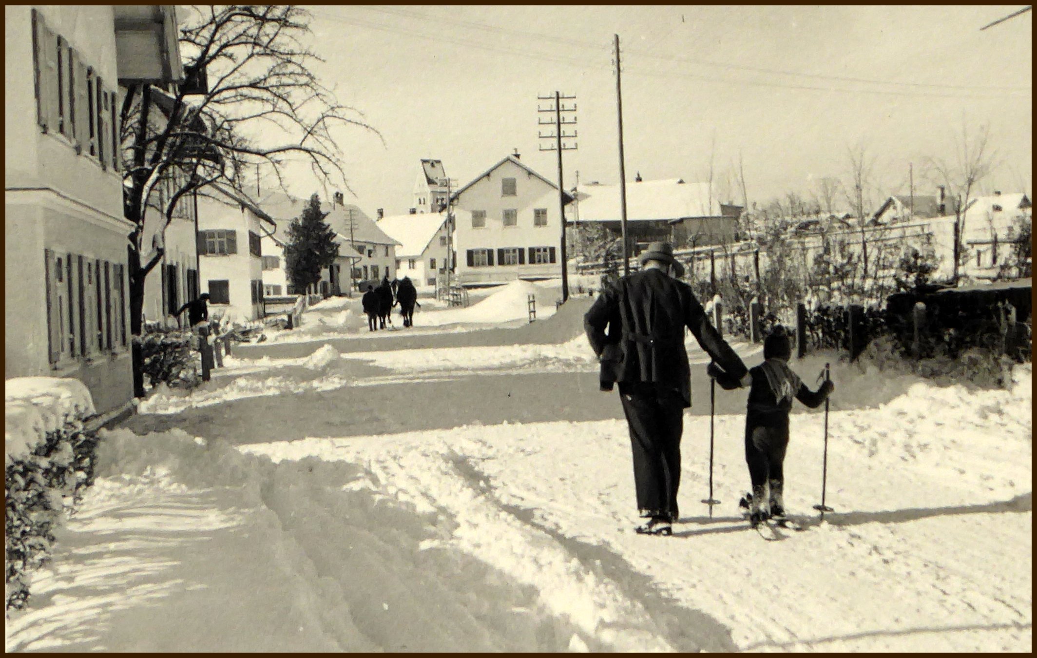 Auch Strom- und Telefonmasten mit den weißen Isolatoren prägten früher das Ortsbild. Maler aus dem Oberbayrischem umrandeten in den Dreißigerjahren die Fenster des Bären im Barockstil.