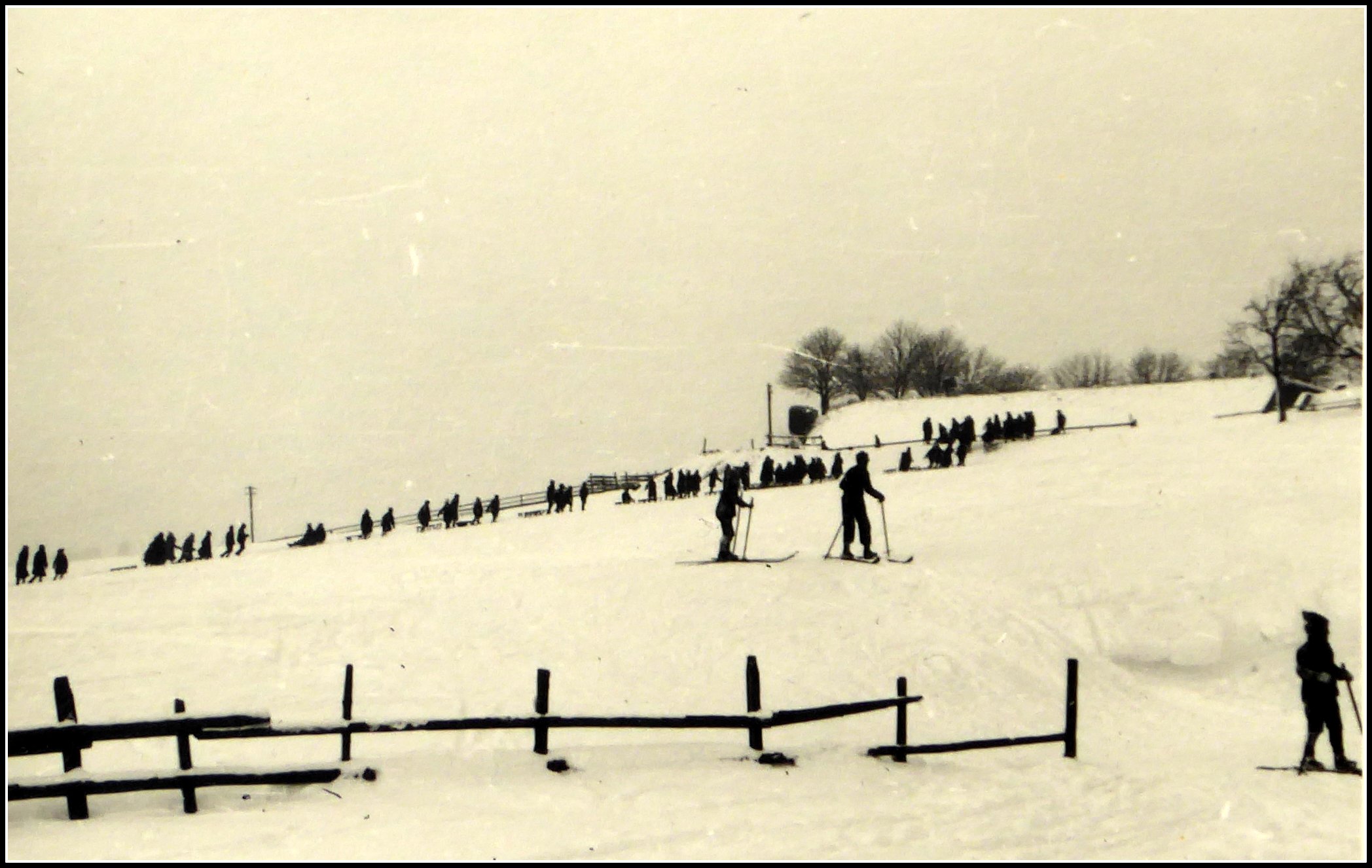 Skiabfahrtslauf des TSV Altusried, anno 1950. Im Hintergrund das Illertal.Ganz links mit der Nummer 7 Ohneberg Max, in der Mitte Würzner Franz Abteilungsleiter mit der Nummer 20.
