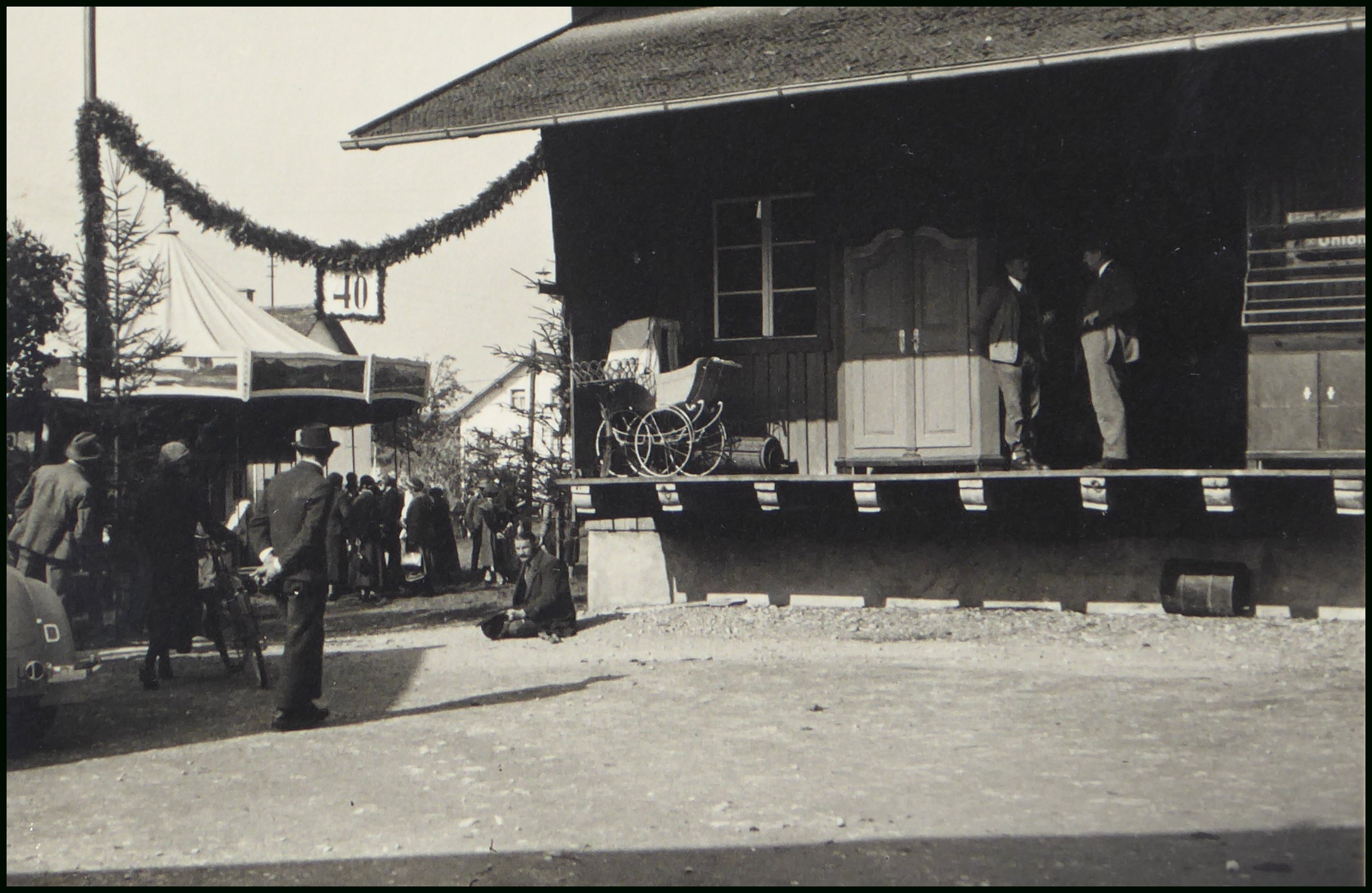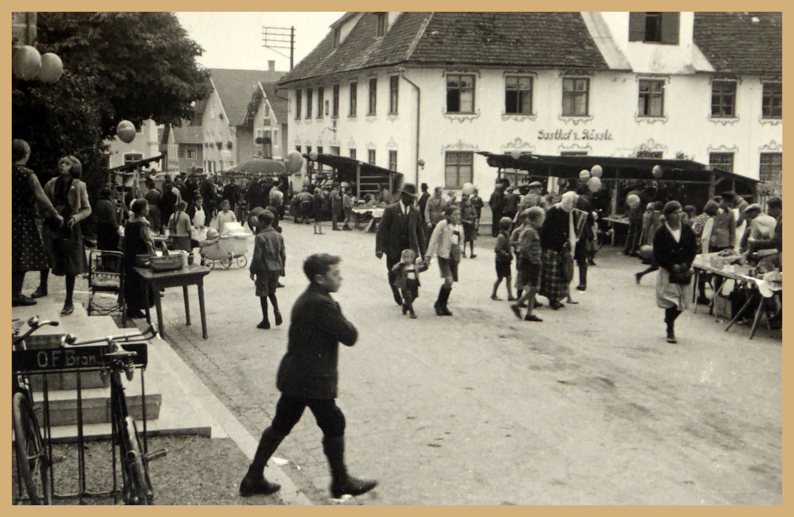 Jahrmarkt in Altusried. Das Warenangebot war in der Kriegszeit nicht sehr reichhaltig. Mittelpunkt des Marktgeschehens war der Platz vor dem Kaufhaus Brändle.