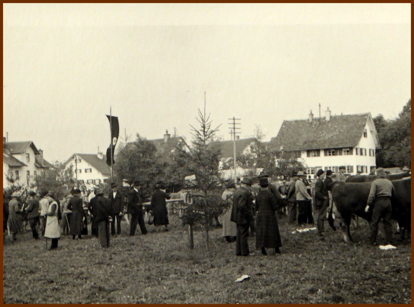 - Rinderschau auf der Wiese. Die Hitlerfahne flattert im Wind.