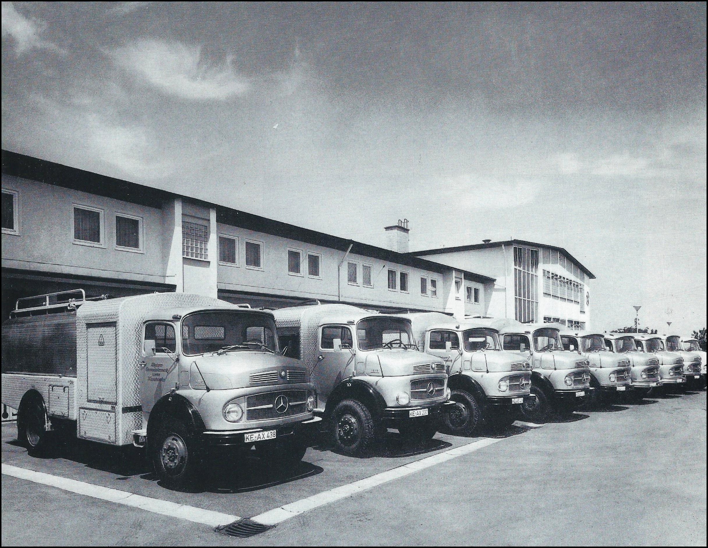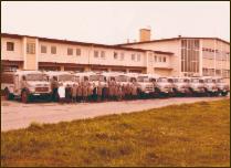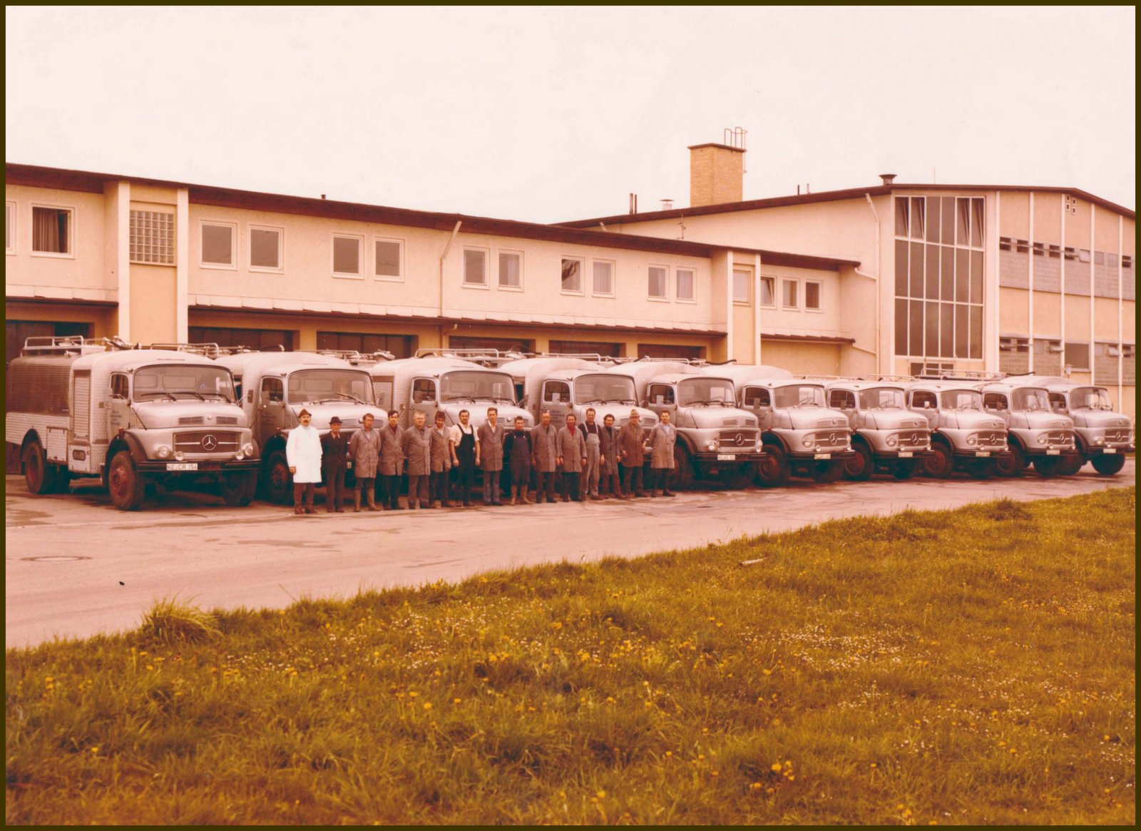 Dreizehn Milchsammler - Fahrer von links nach rechts: Xaver Mayr,Geschäftsführer, Müller Georg, Mielke Hermann, Schwarzmann Hans, Wagner Meinrad, Hoch Xaver, Herz Hermann, Gringmuth Winfried, Heinle Xaver, Gromer Ludwig, Prinz Josef, Kiechle Hans, Briechle Jakob, Weizenegger Otto, Heinle Hans