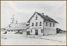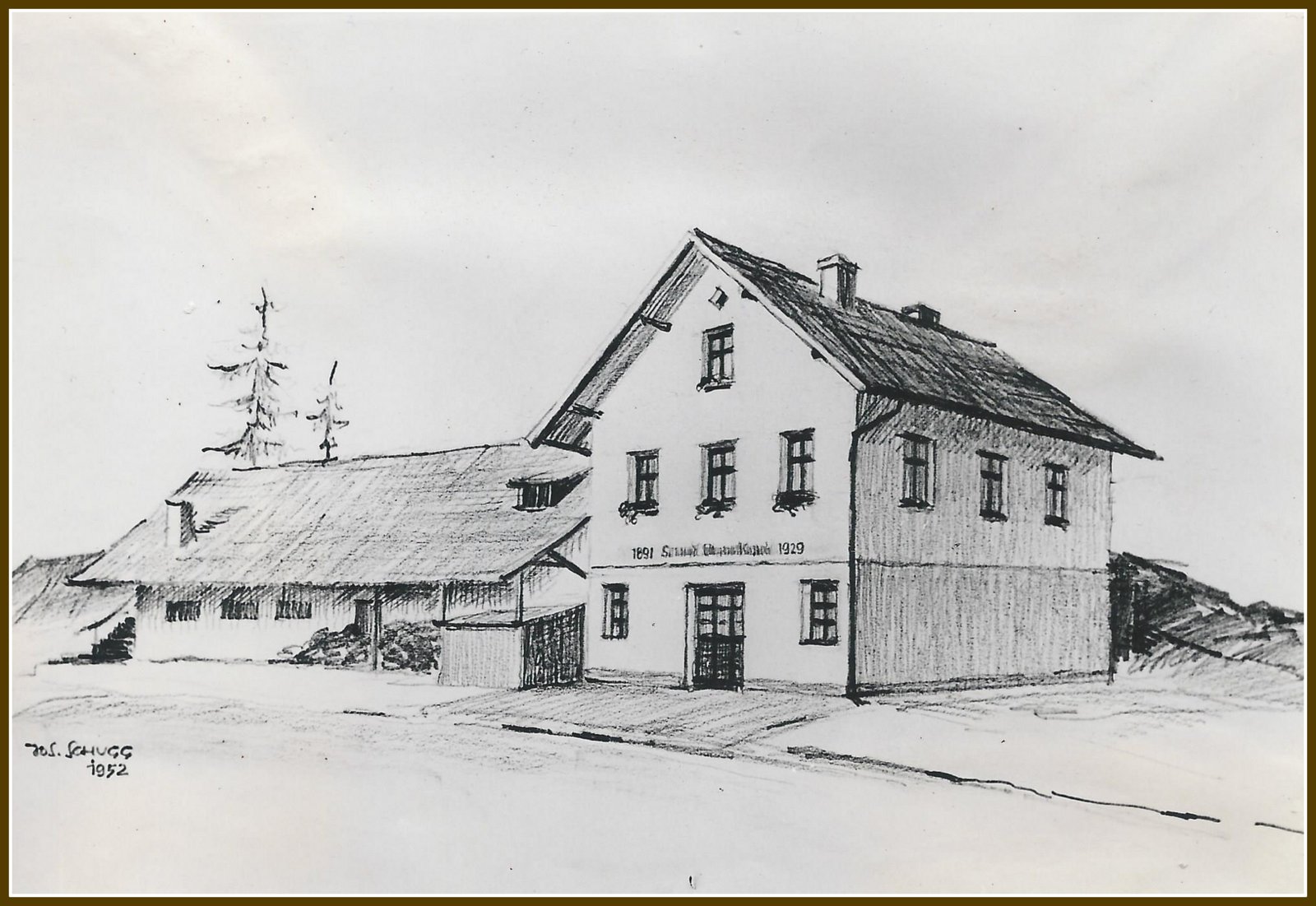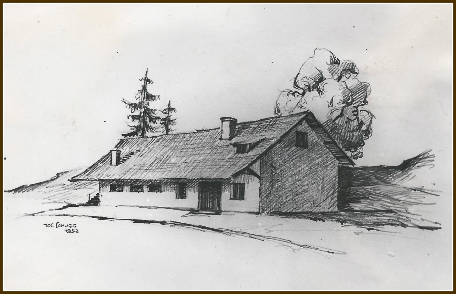 Leider ist uns kein Foto aus den Anfängen überliefert. Deshalb zeichnete Kunstmaler Joseph Schugg die Sennerei so wie sie sich 1891 und 1908 dem Auge boten.