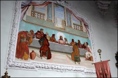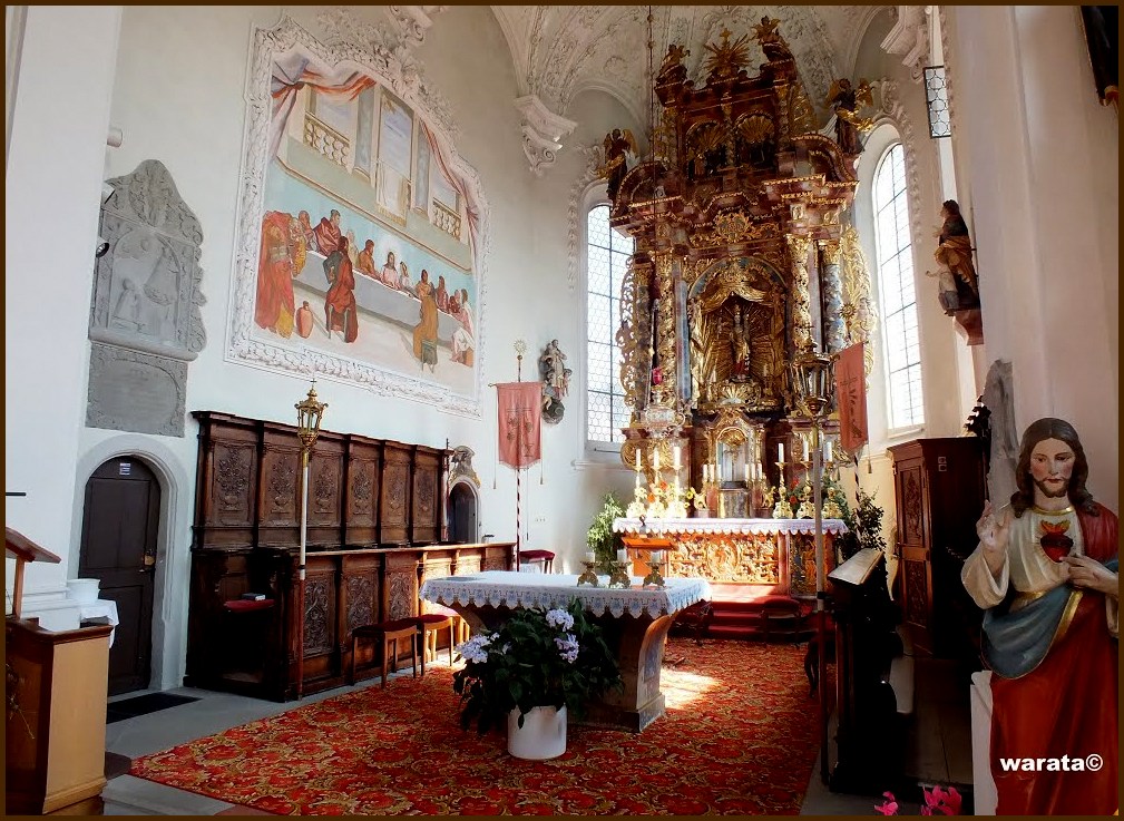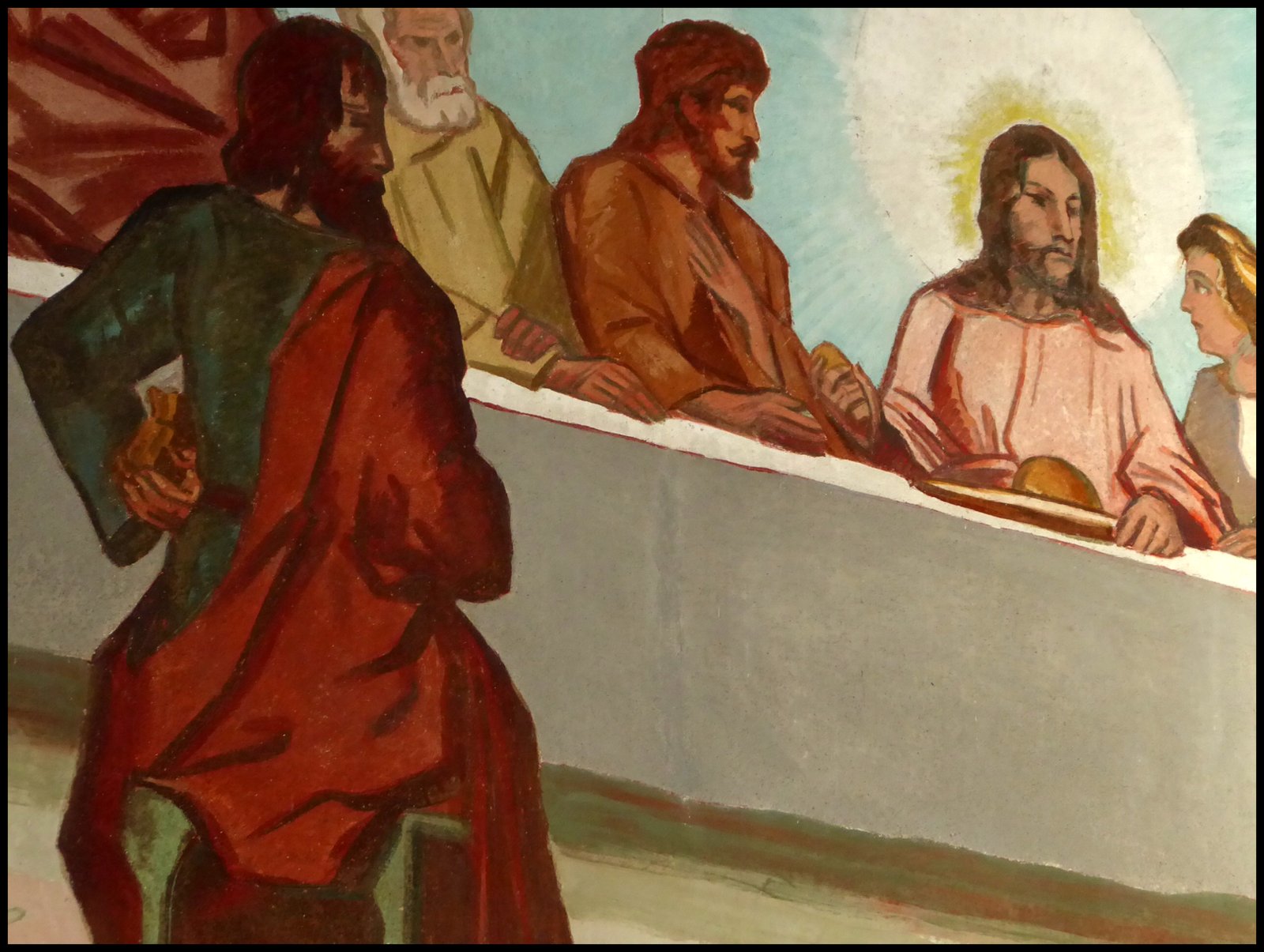 Im Chorraum hat J. Hengge auf der linken Seite im großen Format, 5 m auf 3 m, das Abendmahl gemalt. Die zwölf Apostel von rechts nach links: Bartholomäus, Jakob, Andreas, Judas Petrus, Johannes, Thomas, Jakob d. ältere, Phillip, Mathäus, Thadäus, Simon. Judas sitzt mit dem Rücken zum Beobachter und hält den Beutel mit den Siberlingen verborgen. Die Schar der Jünger ist aufgeregt. Denn Jesus hat soeben gesagt. Einer von euch wird mich verraten.