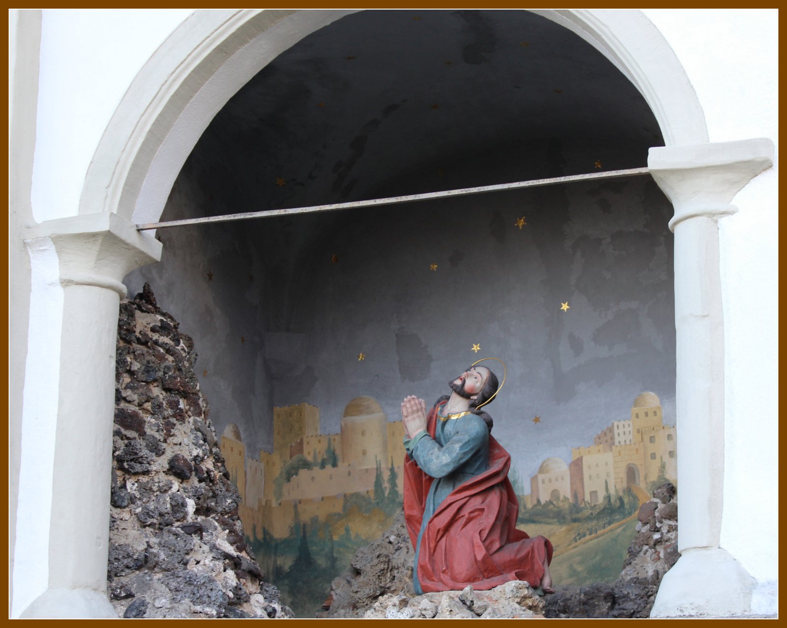 - Auf der Nordseite der Kirche sind zwei Nischen in der Mauer eingefügt. Die erste zeigt die Ölbergszene. Jesus bittet: Herr lass den Kelch an mir vorüber gehen. Im Hintergrund die Stadt Jerusalem. Am Nachthimmel die Sterne.