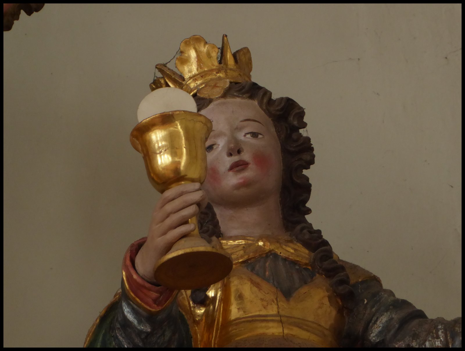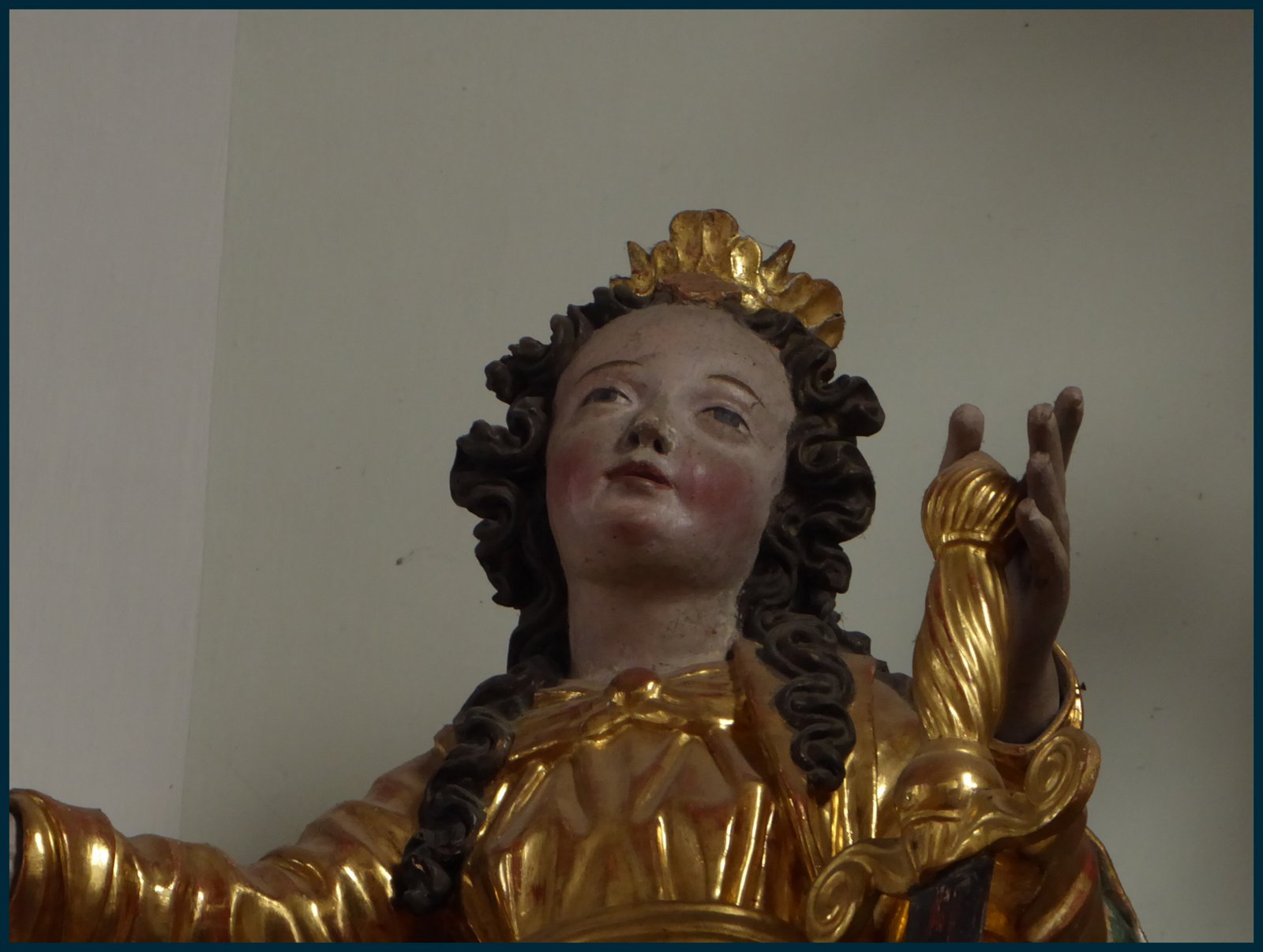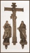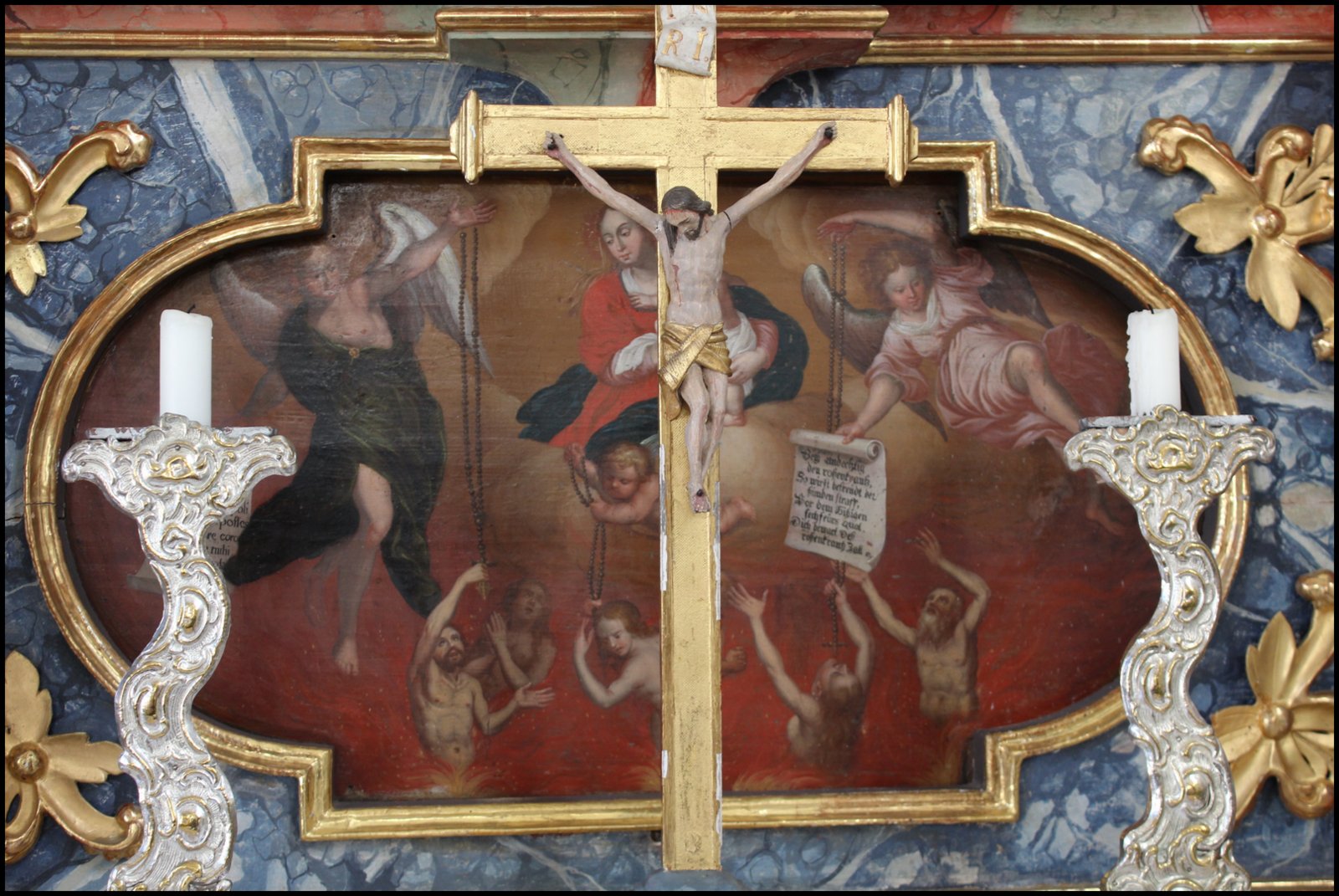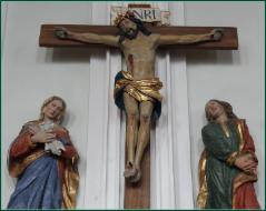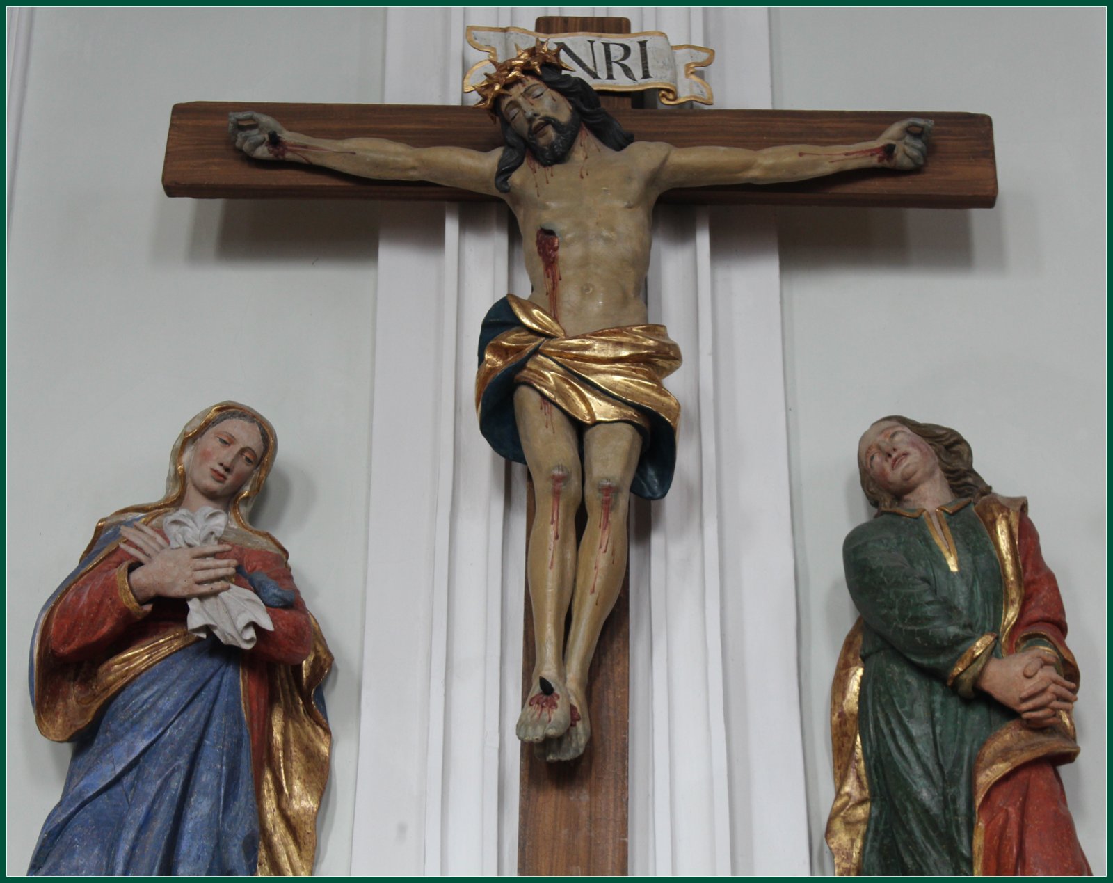 Eine alte Postkarte bestätigt, dass früher im Chorbogen ein Gekreuzigter hing. Zu beiden Seiten standen auf Konsolen Maria und Johannes. Sie befinden sich jetzt an der nördlichen Wand des Kirchenschiffes. Bewegend ist wie Maria das Tränentuch vor die Augen hält.