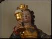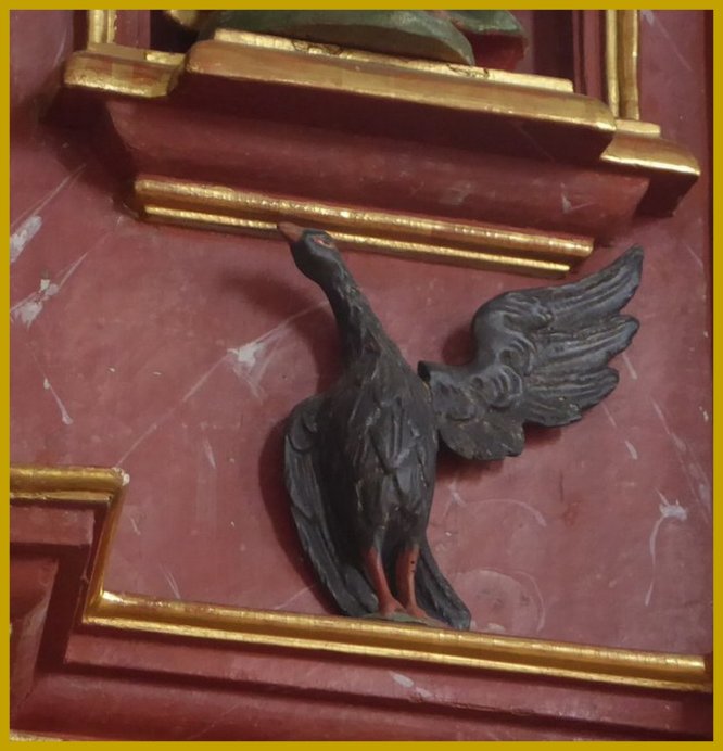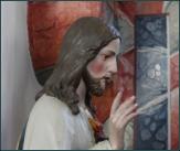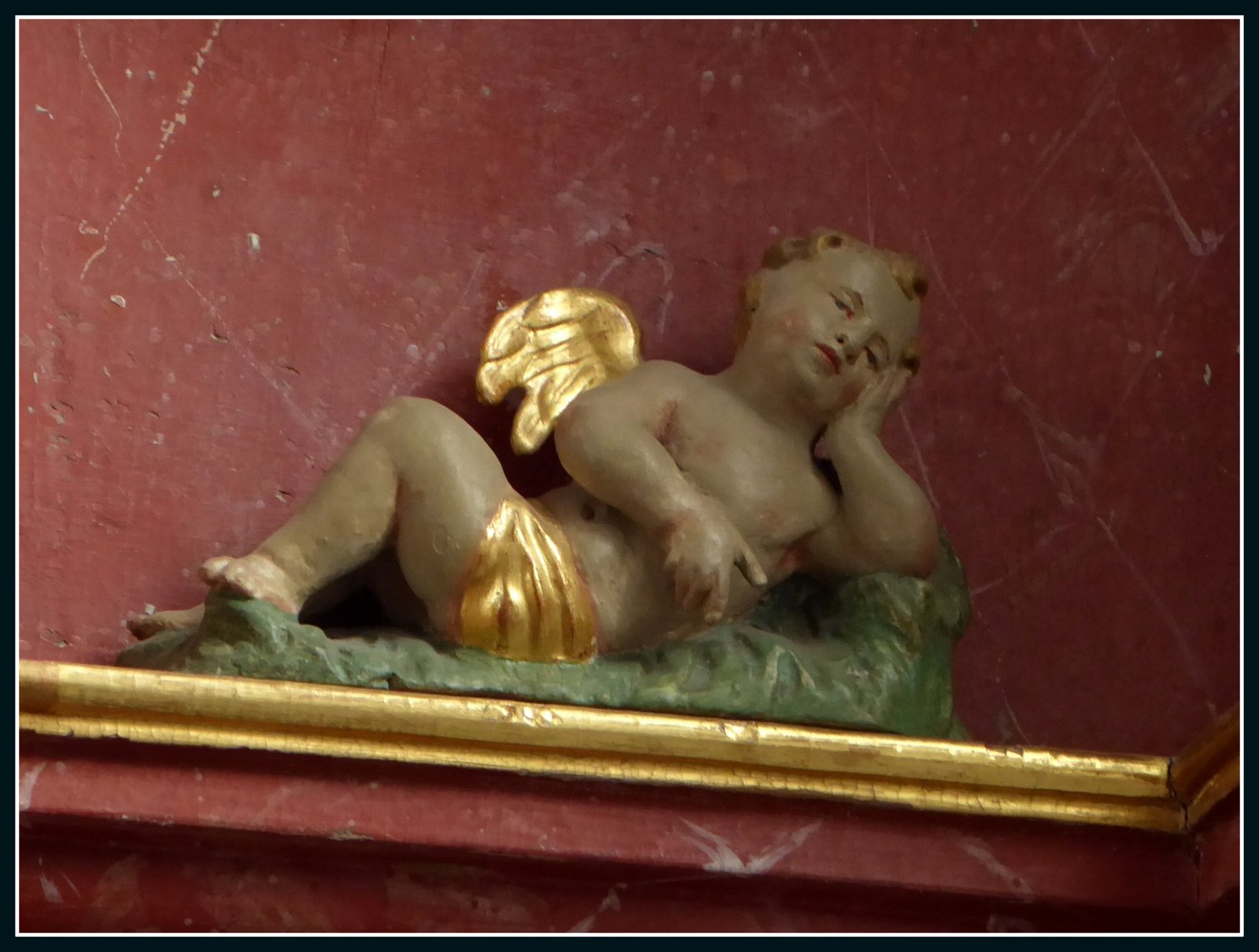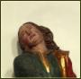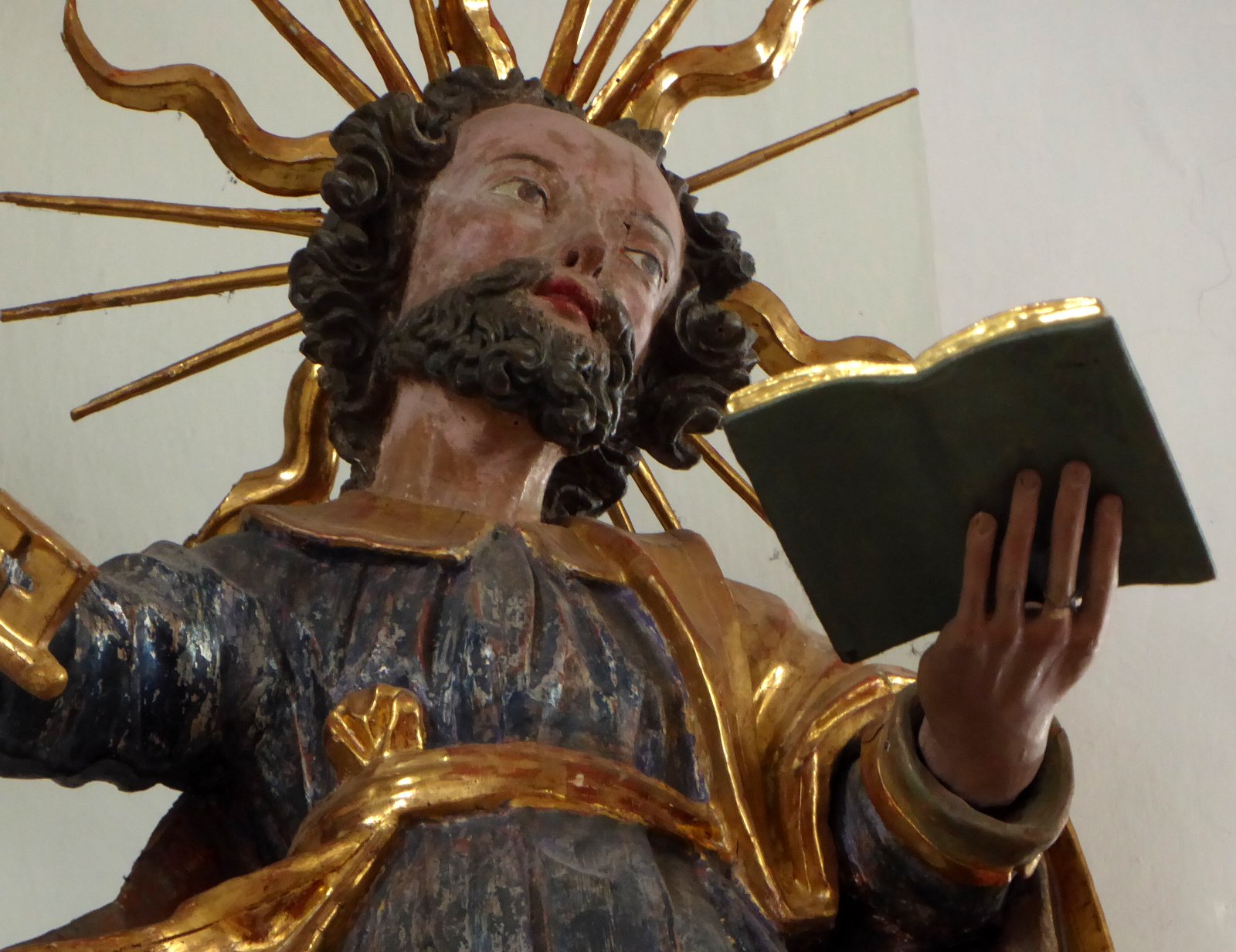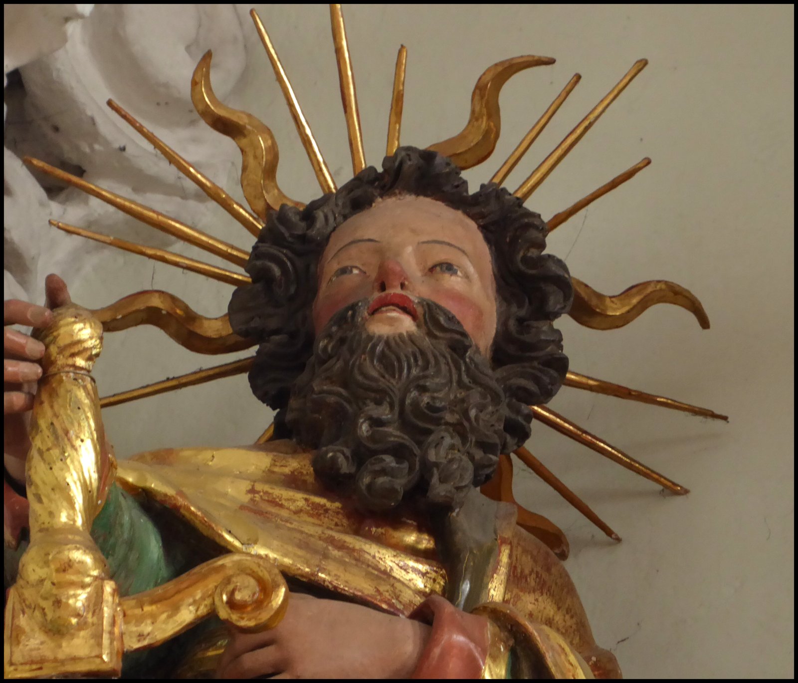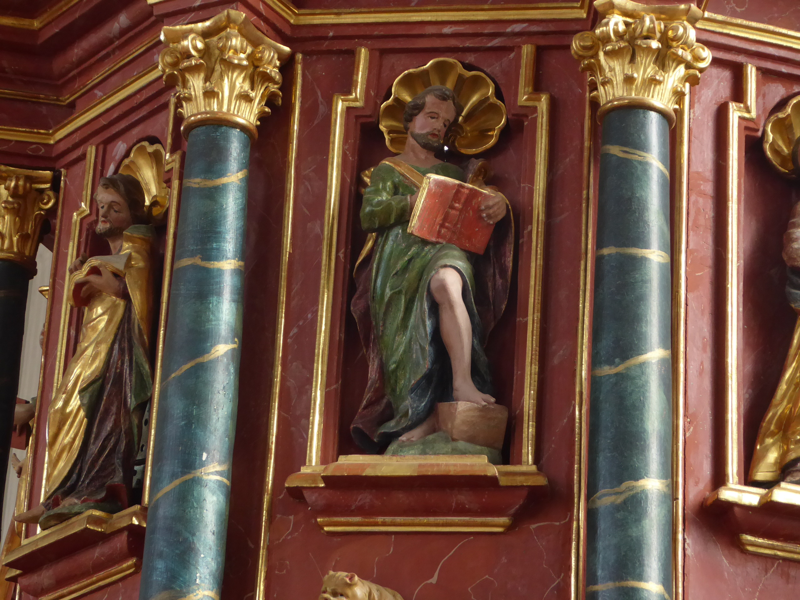 Eine alte Postkarte bestätigt, dass früher im Chorbogen ein Gekreuzigter hing. Zu beiden Seiten standen auf Konsolen Maria und Johannes. Sie befinden sich jetzt an der nördlichen Wand des Kirchenschiffes. Bewegend ist wie Maria das Tränentuch vor die Augen hält.