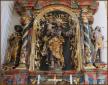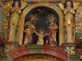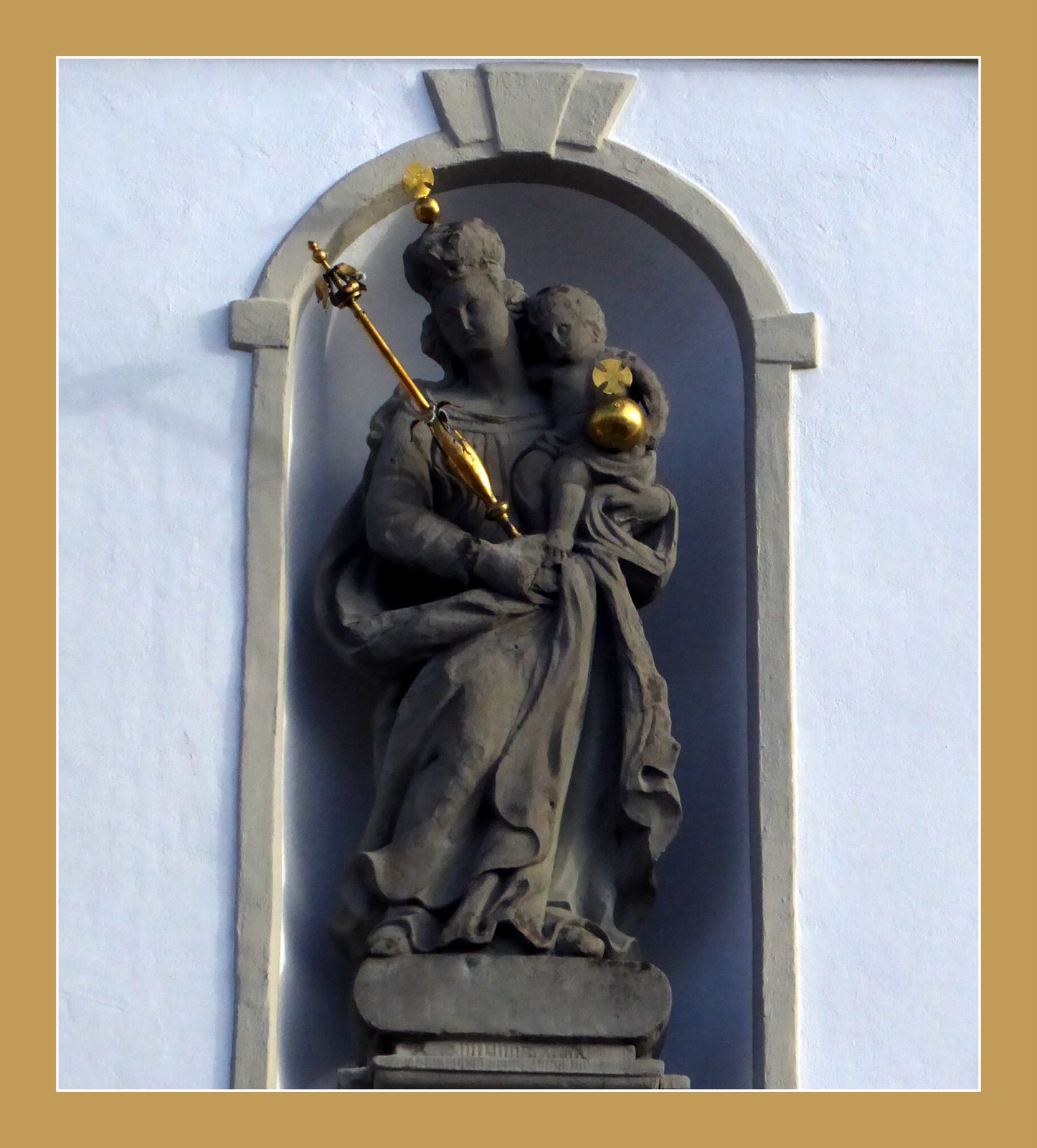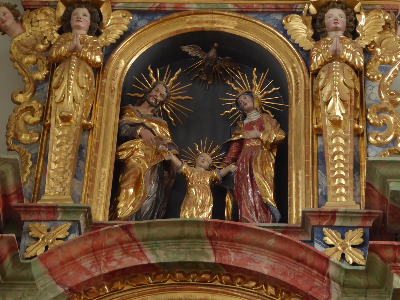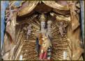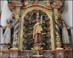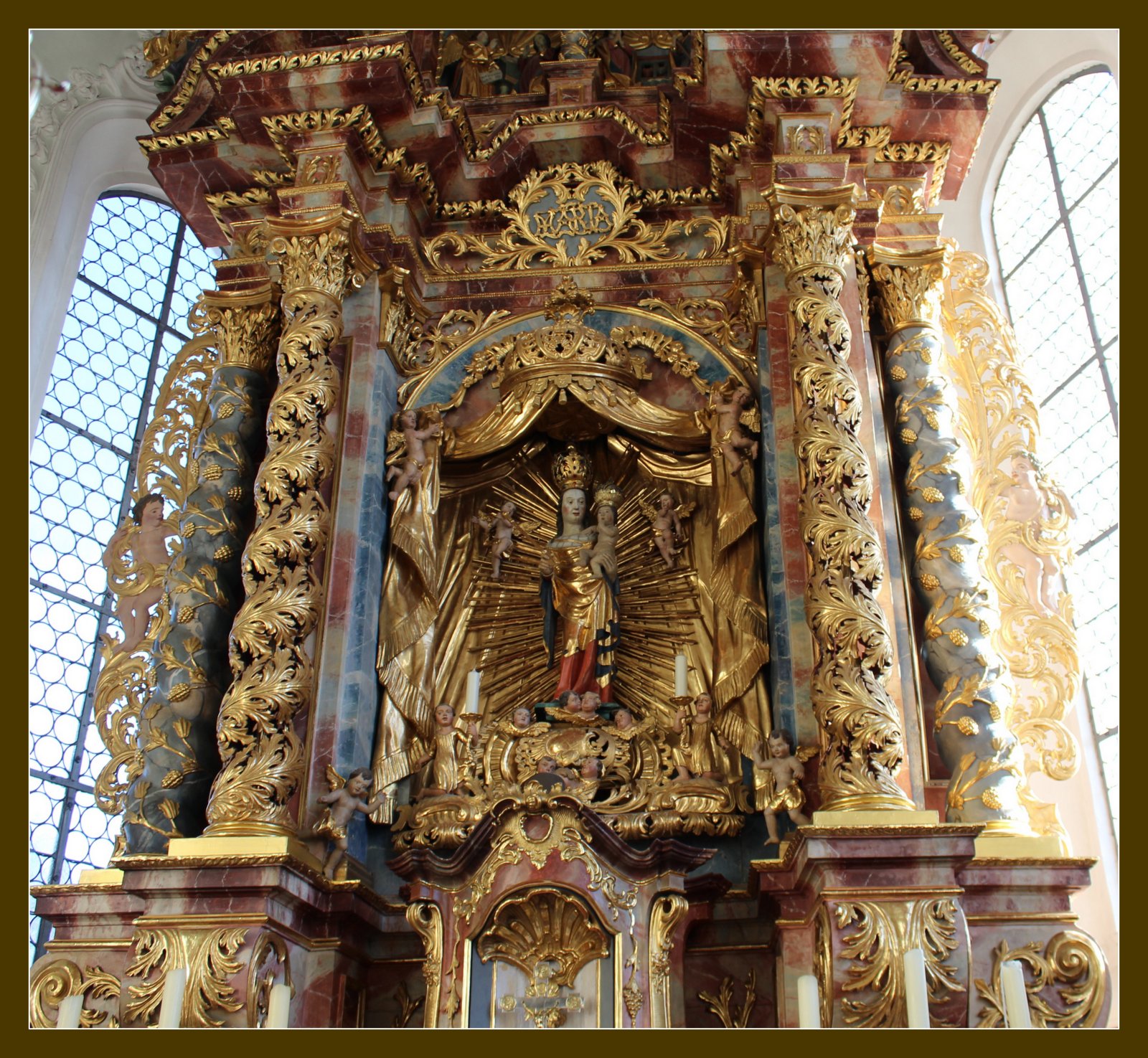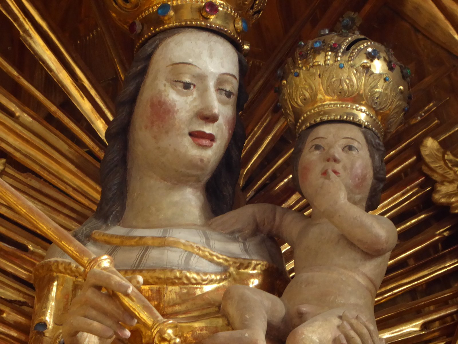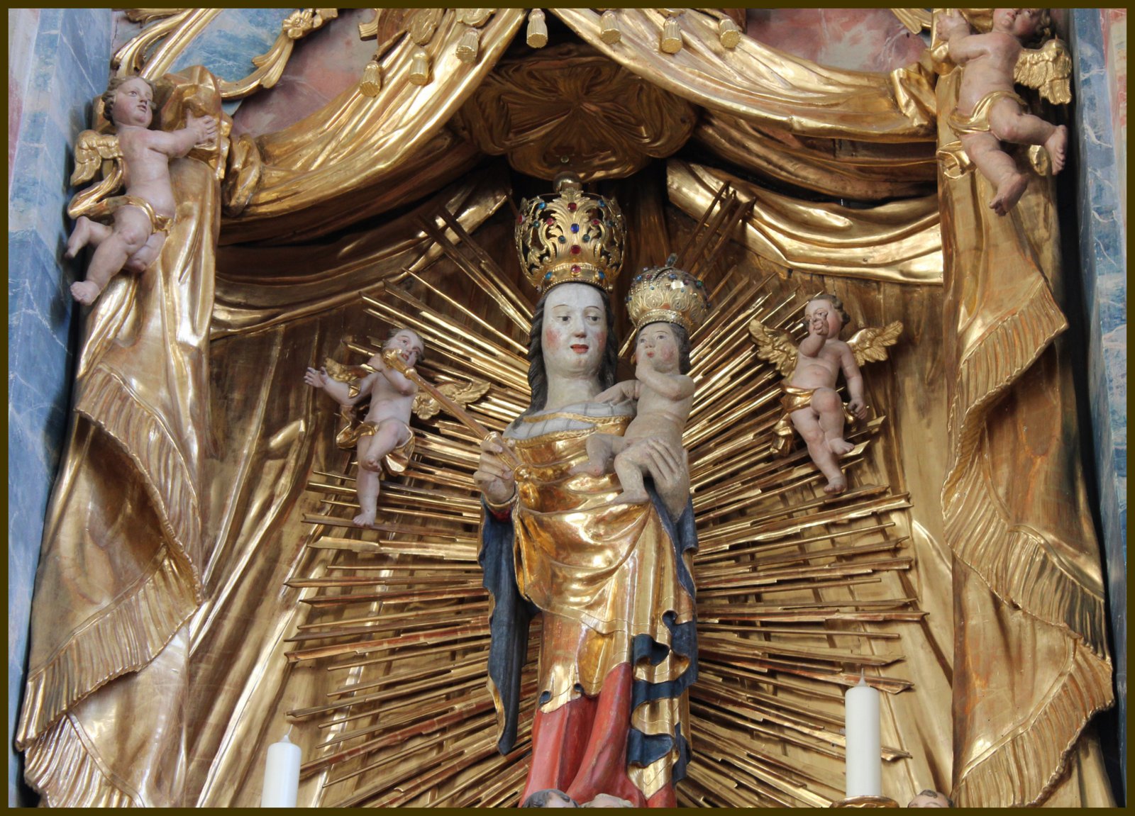 Prächtig und eindrucksvoll ist der Hochaltar. Vier Säulen umrahmen das Gnadenbild. Sie sind spiralig geformt, so wie Bernini die Säulen am Altar des Petersdoms in Rom geschaffen hat. Dazu sind sie reichlich mit goldenem Rankwerk verziert. In der Nische trohnt Maria im Strahlenkranz. Zur Barockzeit bekam sie eine Krone aufgesetzt, wie auch das Jesuskind. Es hält den Zeigefinger zum Mund zum Zeichen: Ich bin das Wort Gottes.