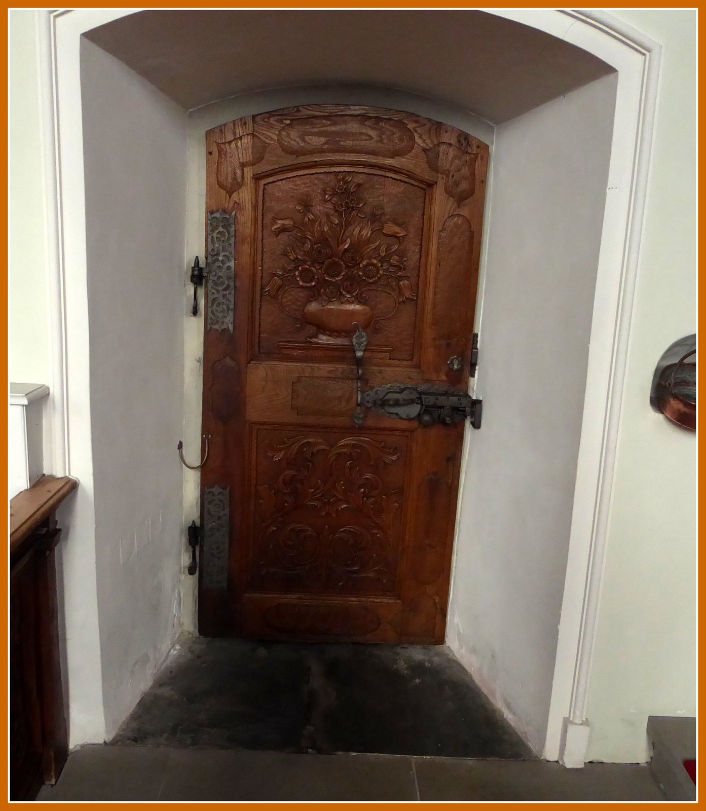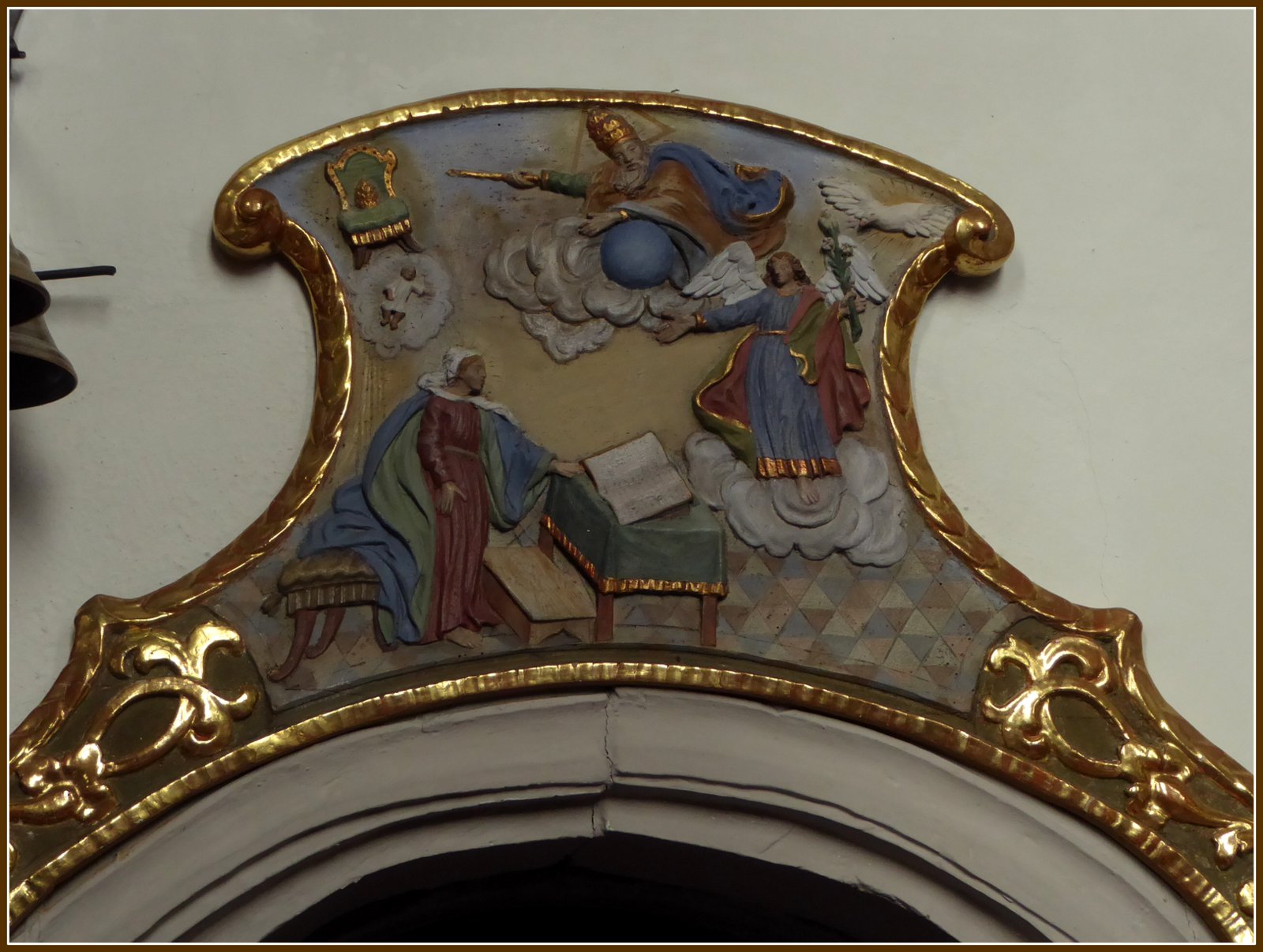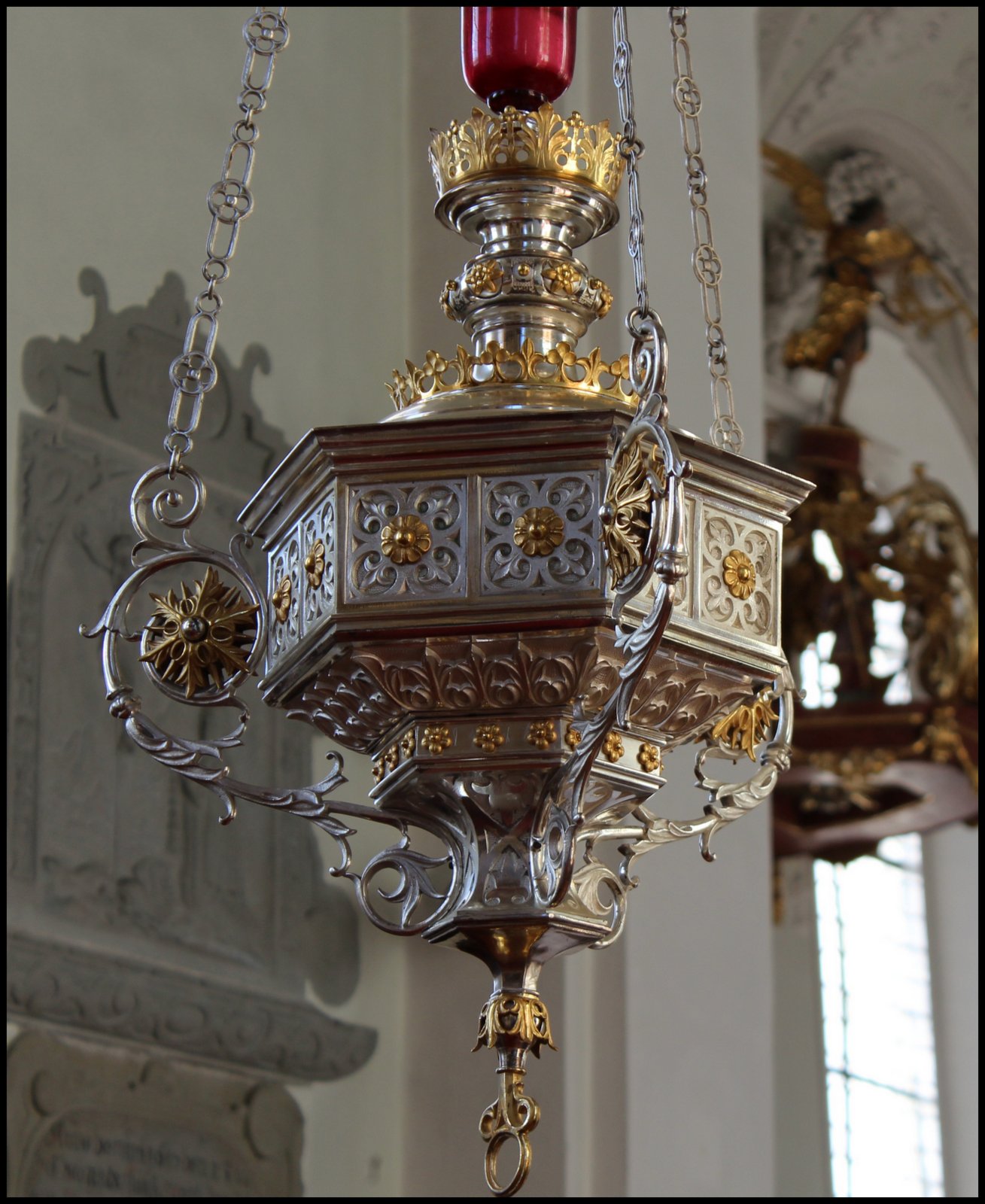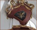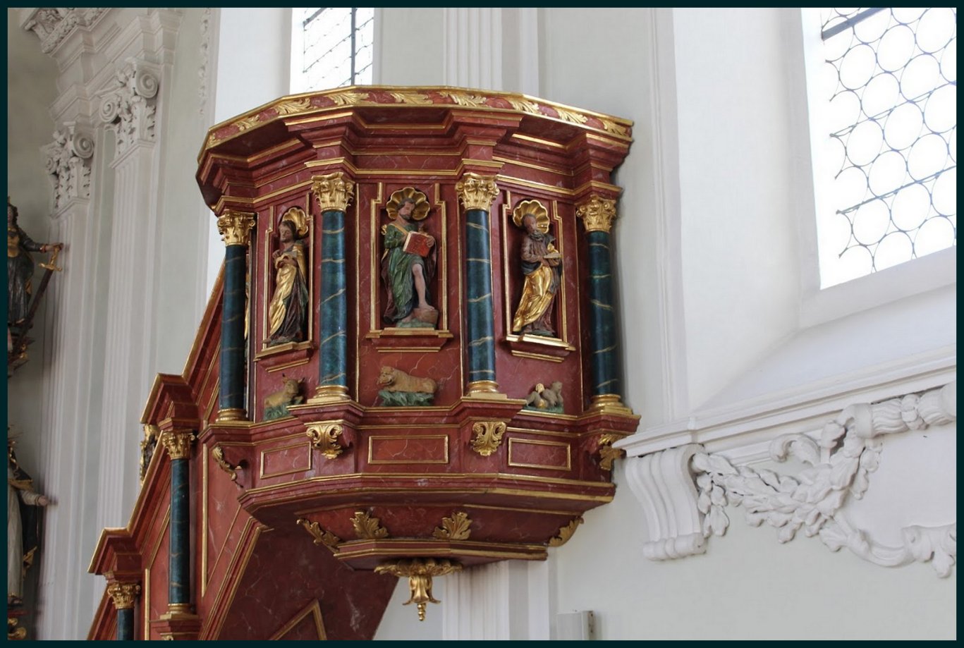 Die marmorierte und goldgefasste Kanzel ist noch im strengen Stil des Frübarocks gehalten. Die vier Evangelisten erkennt man an den geschnitzten Symbolen. Der Stier für Lukas, der Engel für Johannes der Löwe für Markus und der Adler für Matthäus. Über der Kanzel ein mächtiger Schalldeckel, der sich nach oben auflöst zu Streben, Bögen, Girlanden und Figuren im Stil des Hochbarocks.