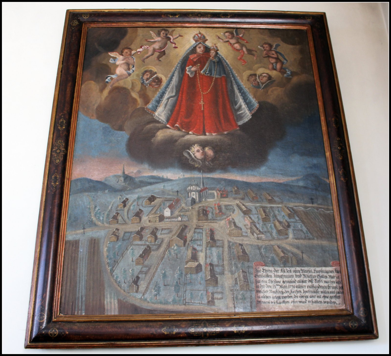 Das Votivbild ist auch eine Darstellung des Ortes. Zum Teil stehen die Häuser noch heute so wie damals. Zwei Häuser in der Nähe der Kirche brannten damals ab. Zum Glück aber sprang das Feuer nicht auf die anderen Häuser über.