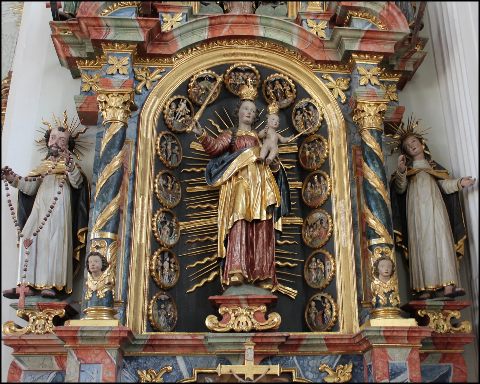 Der rechte Seitenaltar ist der Rosenkranzaltar. In seiner Mitte ist eine Madonna von 1663. Sie wirkt dem Stil der Zei folgend etwas steifer als die gotische Madonna am Hochaltar. Fünfzehn Medaillons der Rosenkranzgeheimnisse mit ihren fünf Gesetzen umrahmen sie. Links und rechts befinden sich die Rosenkranzheiligen Dominikus und Katharina von Siena. Zu Füßen der Gottesmutter das Bild der Predella. Sie zeigt wie es den gläubigen Betern gelingt, sich zu retten durch das Erfassen der Rosenkränze.
