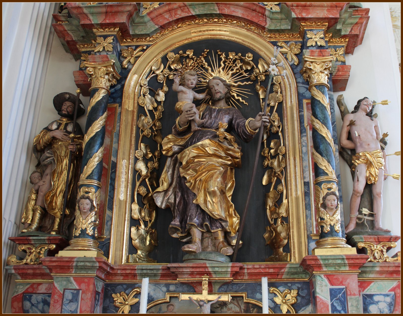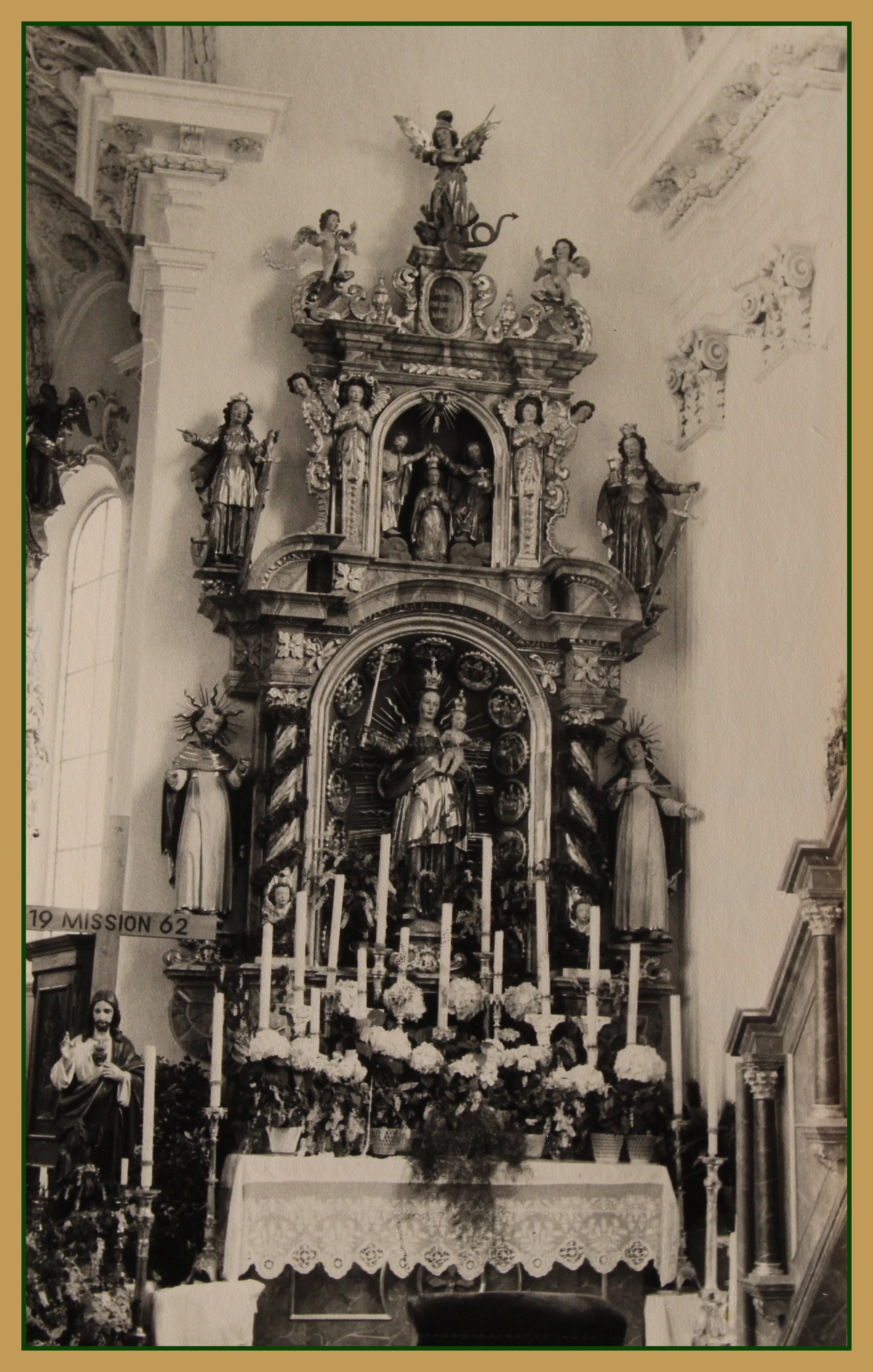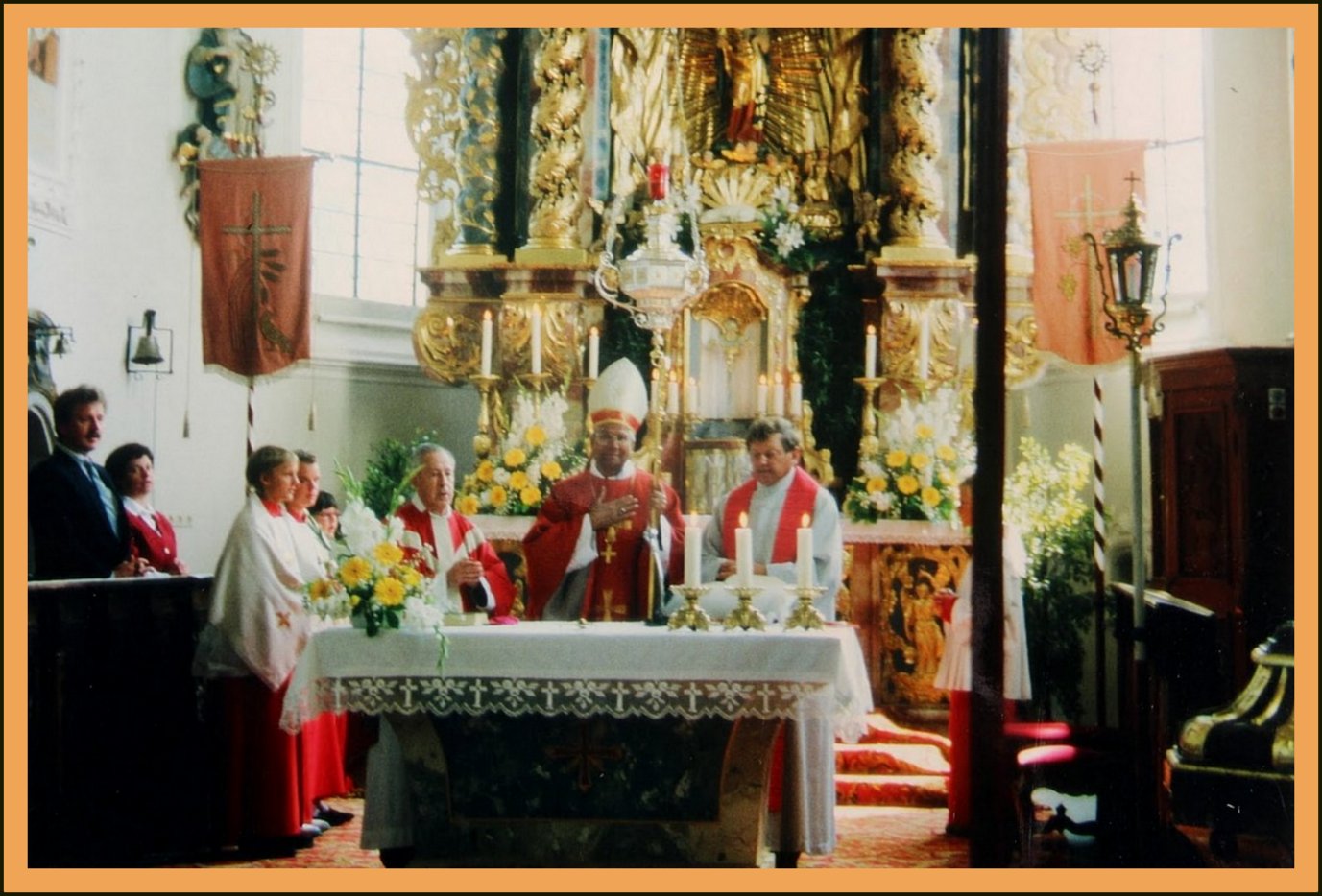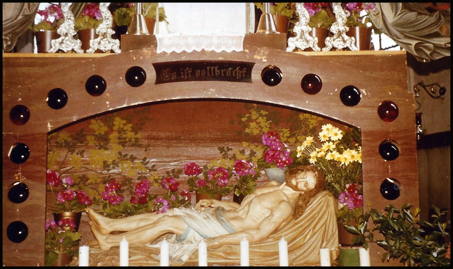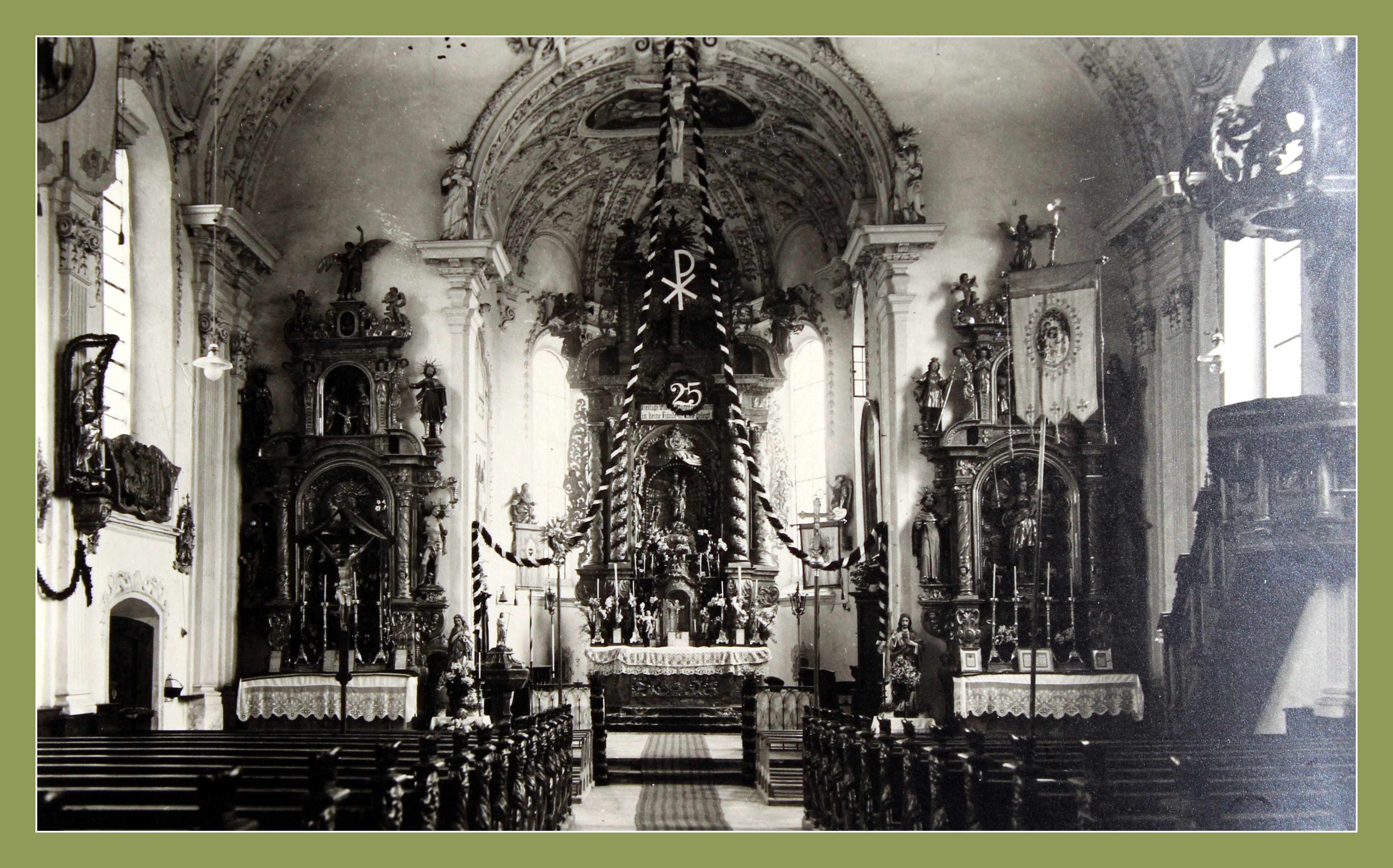 Der Chorraum ist mit Girlanden geschmückt. Gefeiert wird ein 25-jähriges Jubiäum. Über dem Hochaltar das Christuszeichen. Es besteht aus einem P und einem X. Das Zeichen geht zurück auf eine Erscheinung des Kaisers Konstantin vor der Schlacht bei der Milvischen Brücke.