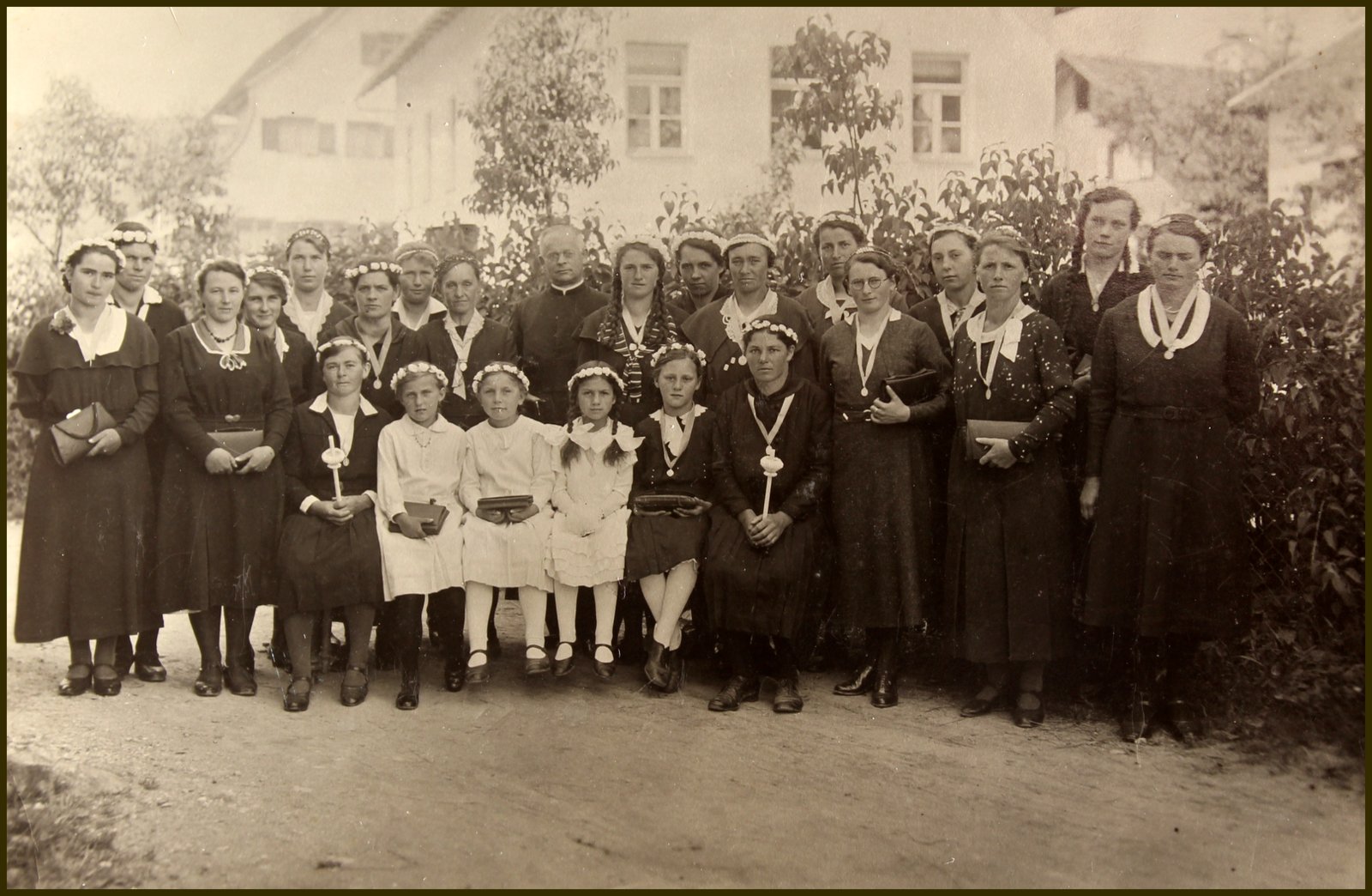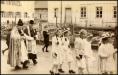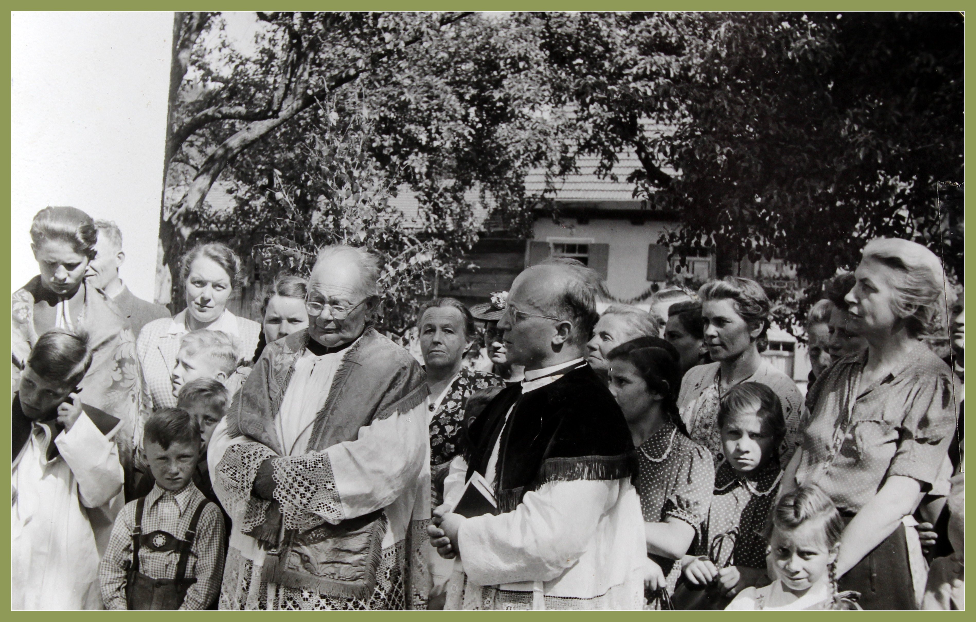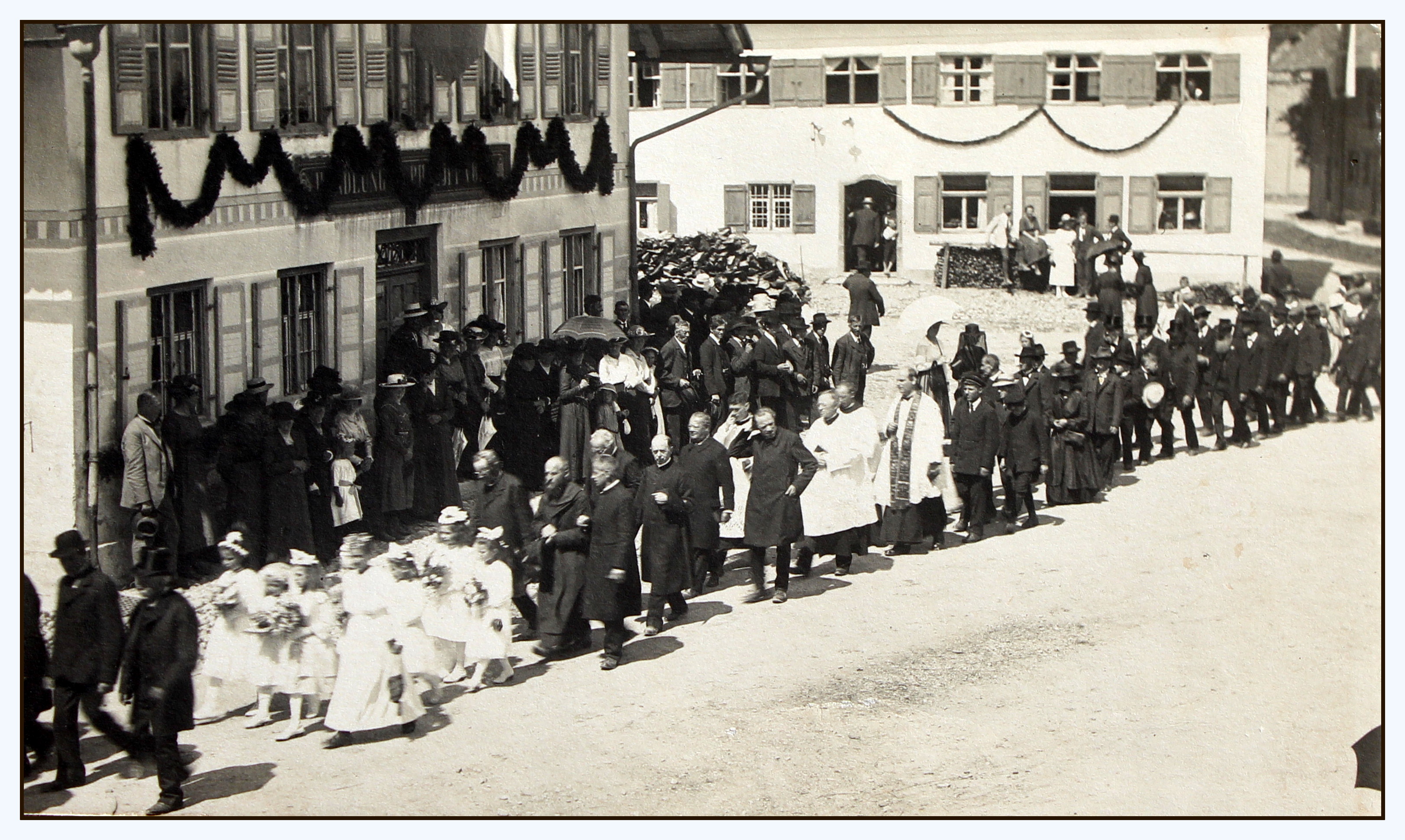 Der Primizzug von Briechle führt vorbei am Gasthaus Ochsenreiter und dem Gemischtwarengeschäft Reisacher. Primiziant Briechle trat in den Benediktinerorden St. Ottilien ein. Er nannte sich dann Pater Urban.