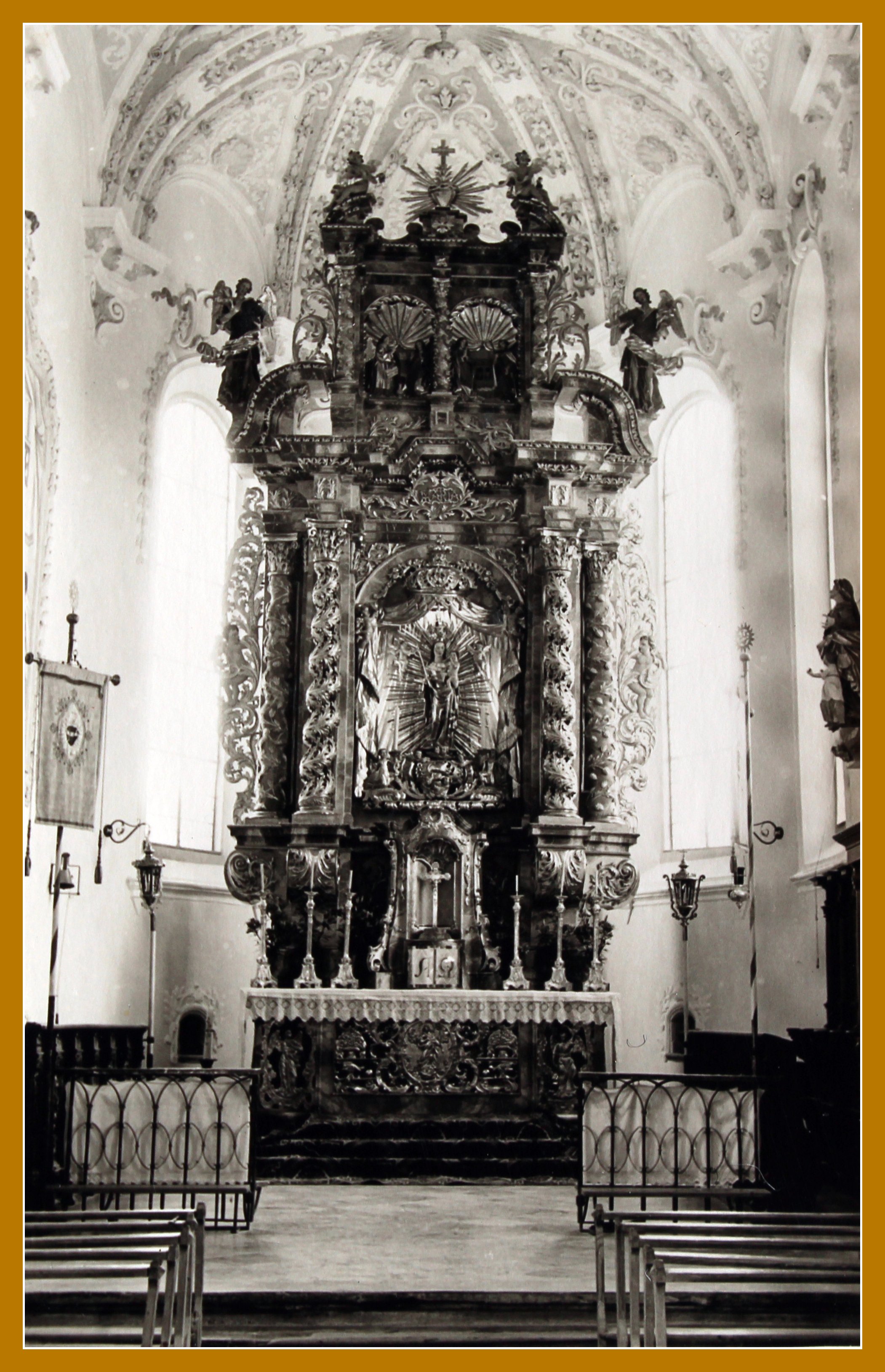 - Ganz vorne nahe dem Hochaltar war früher die Komunionbank. In der Mitte konnte man sie öffnen. Doch nach der Liturgiereform war sie nicht mehr notwendig und wurde entfernt. Außerdem gab es noch zehn kleine Kniebänke für die Kinder. Links die Mädchen, rechts die Buben.