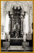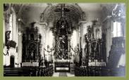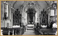 Ein altes Bild von der Kirche. Im Chor eine Uhr. Sie zeigt 8 Uhr 35 . Am Übergang zum Chor hing damals an der Decke noch ein großes Kreuz.