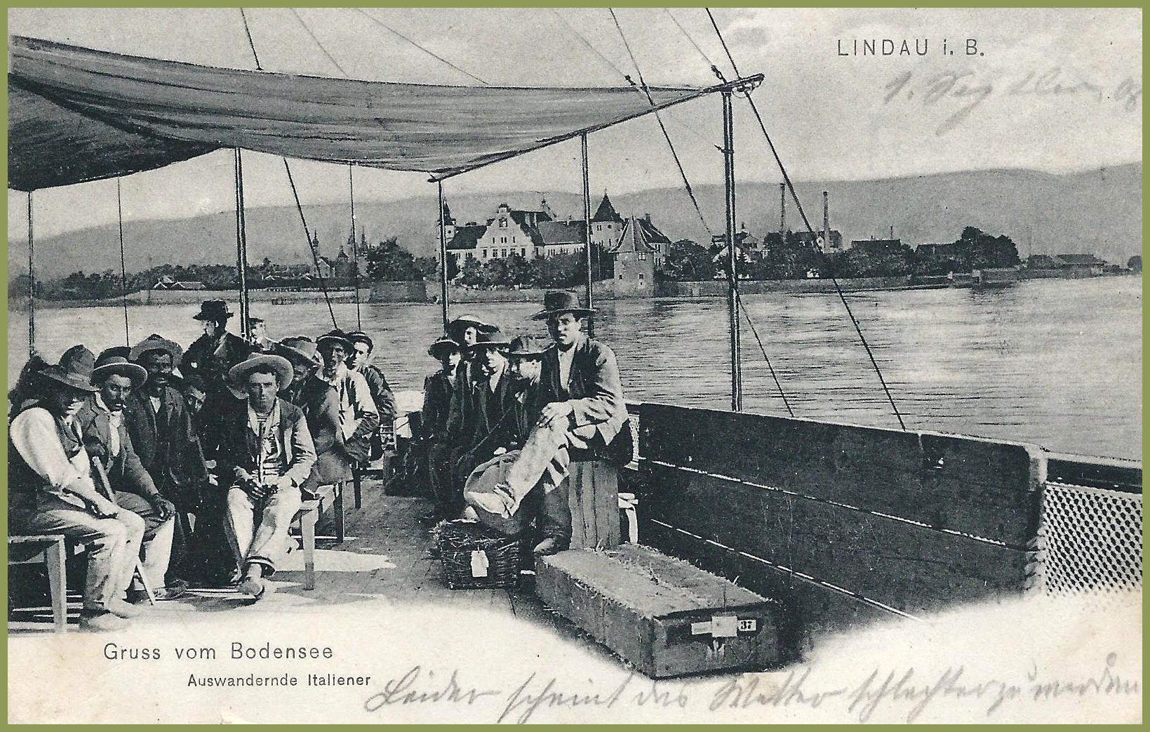 Auf der Bodenseefähre, eine Gruppe auswandernder Italiener 1909 - Boos, nördlich von Memmingen - Gruß aus Boos