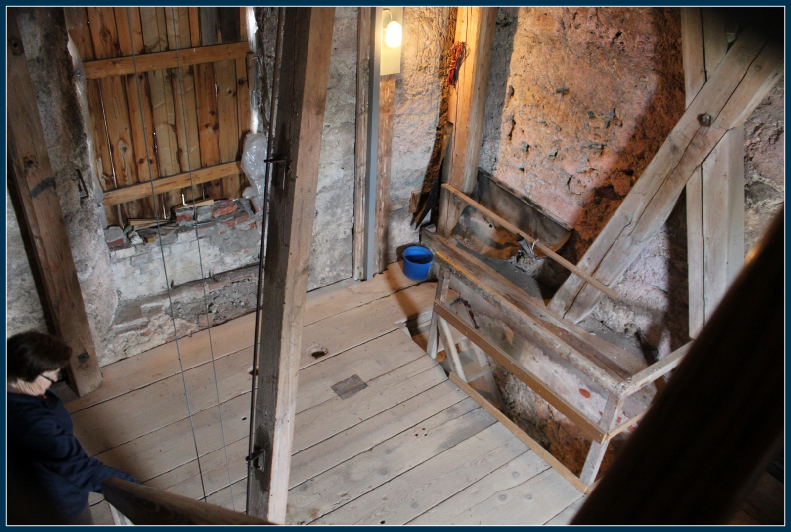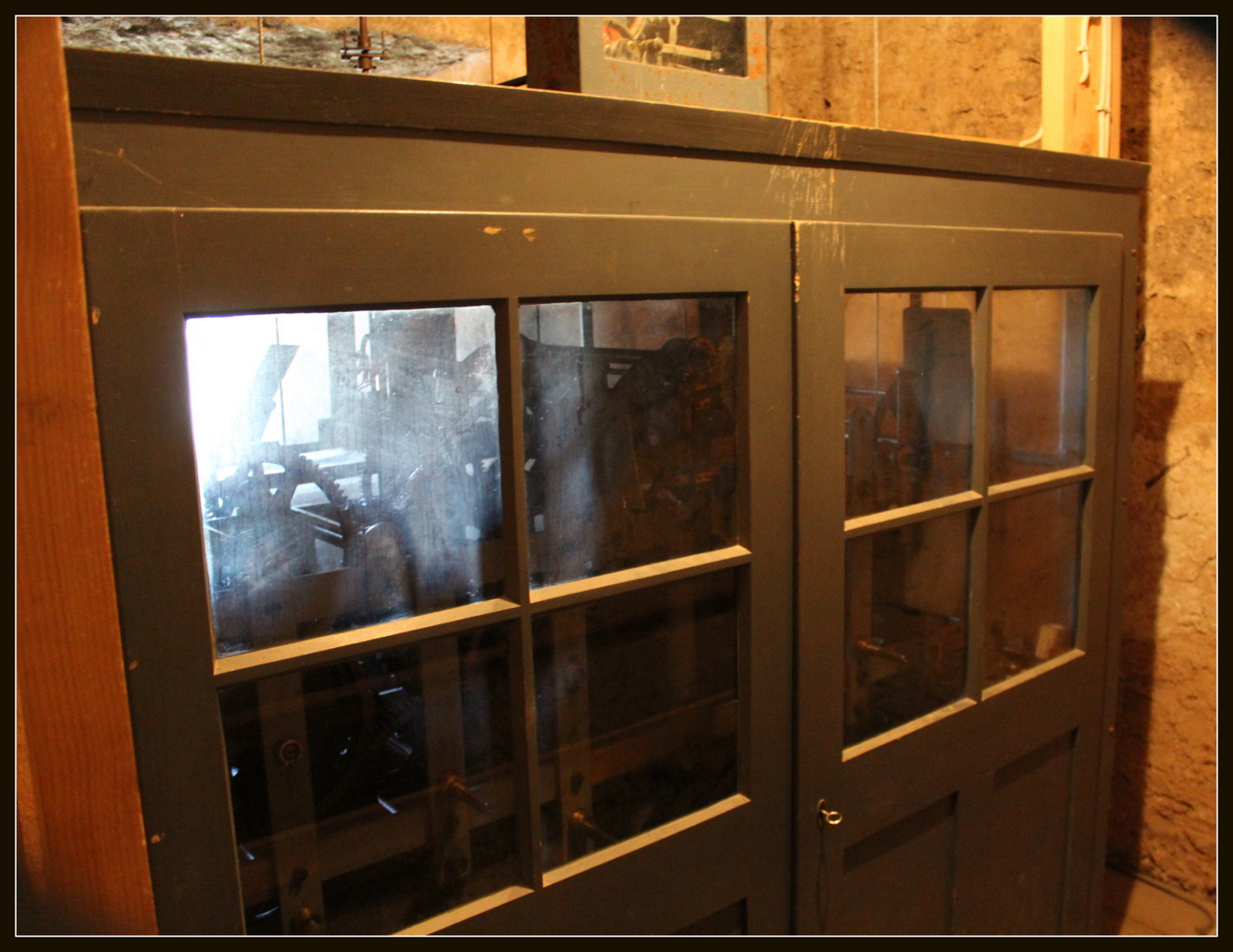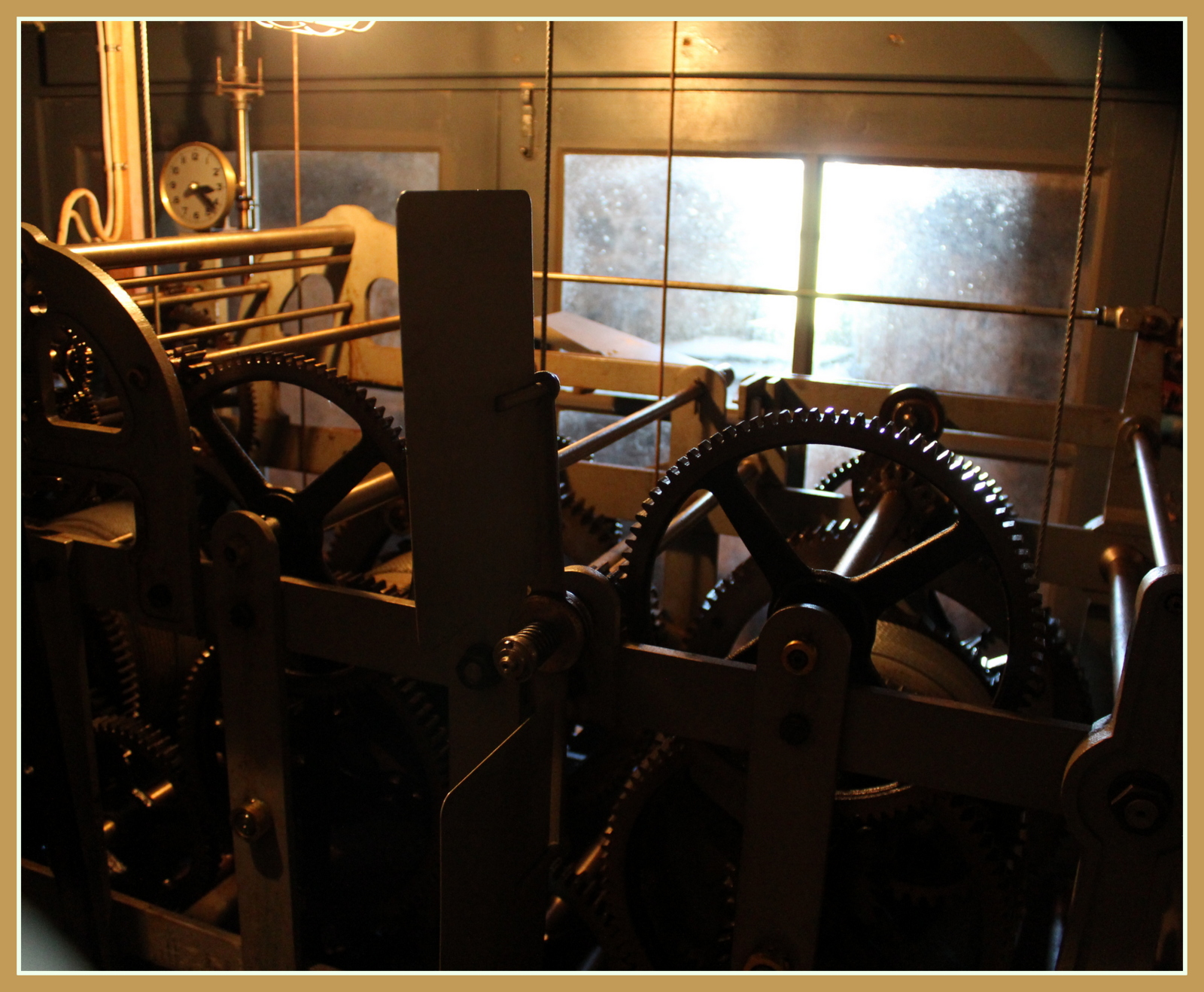 Räderwerk der Turmuhr. Gewichte treiben die Uhr an. Von Zeit zu Zeit zieht ein Elektromotor die Gewichte wieder hoch.