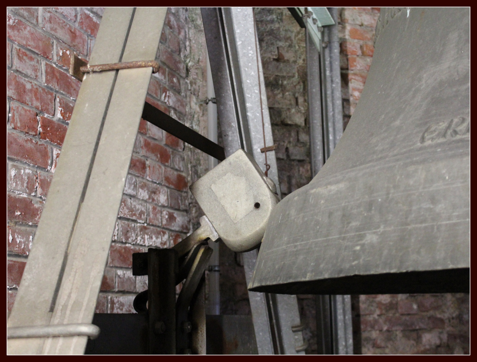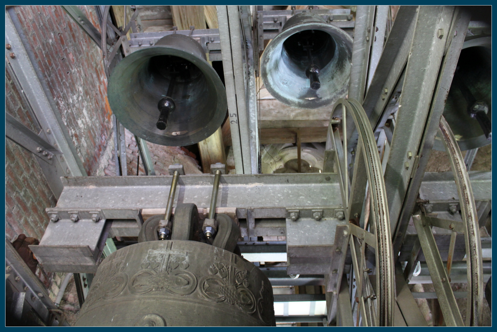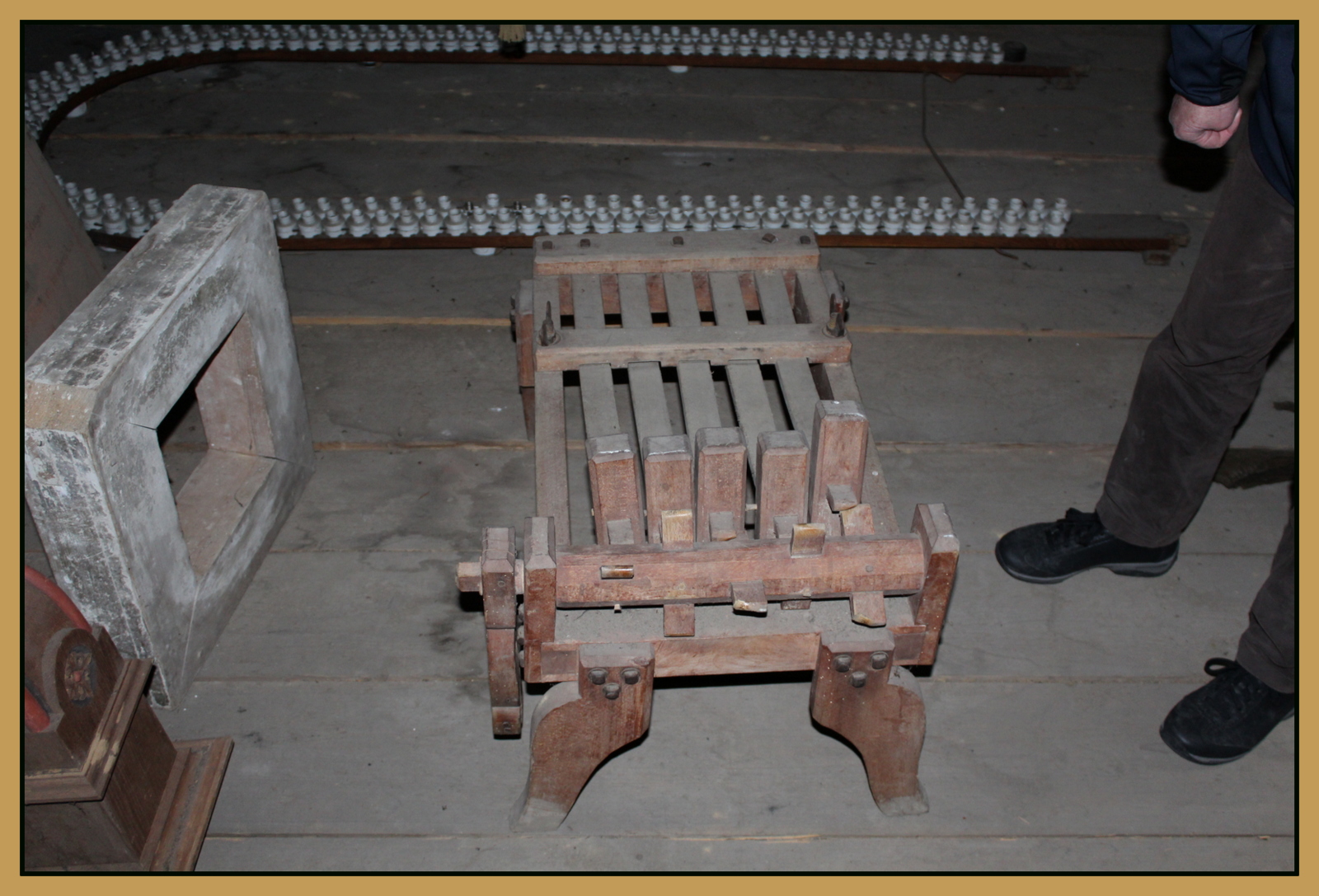Räderwerk der Turmuhr. Gewichte treiben die Uhr an. Von Zeit zu Zeit zieht ein Elektromotor die Gewichte wieder hoch.