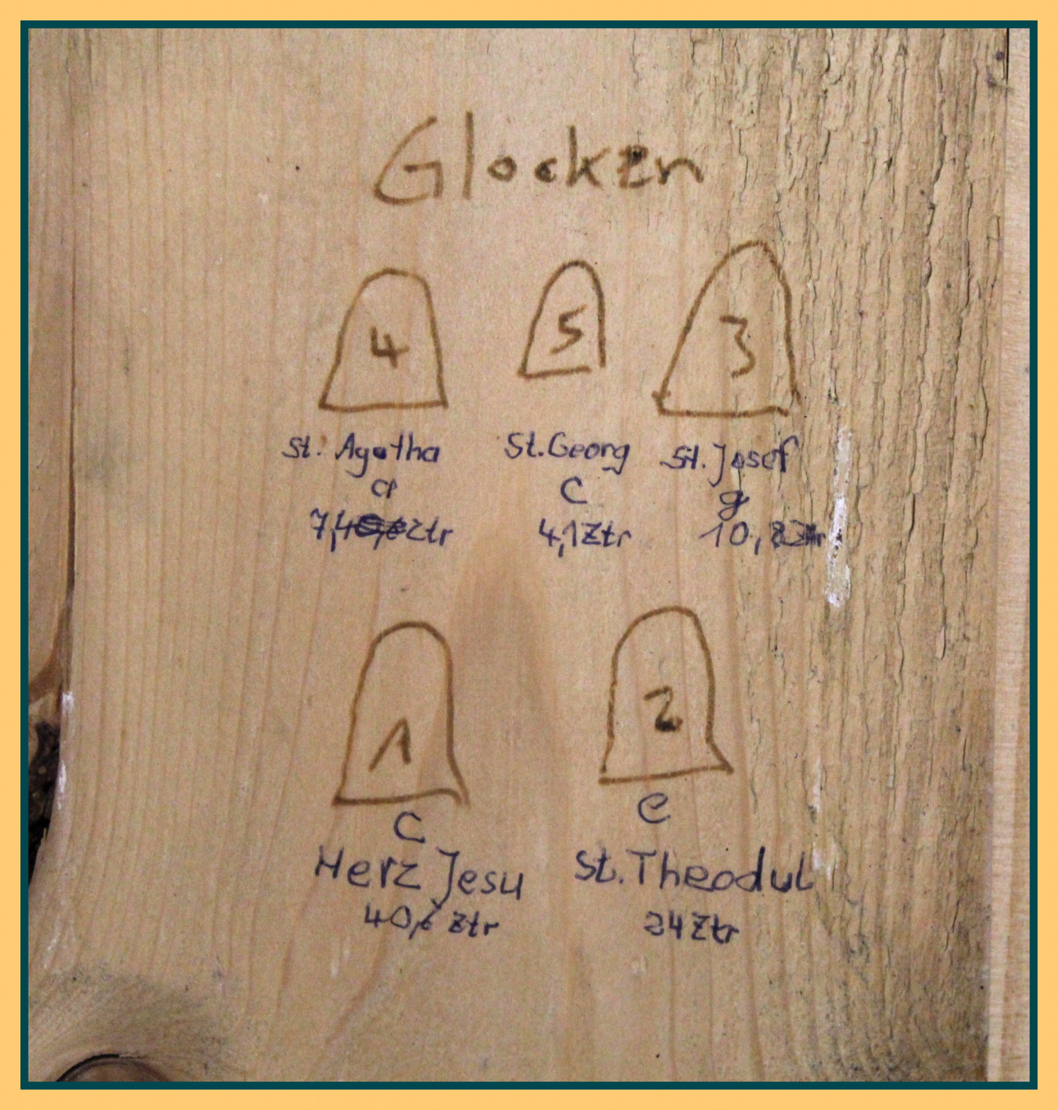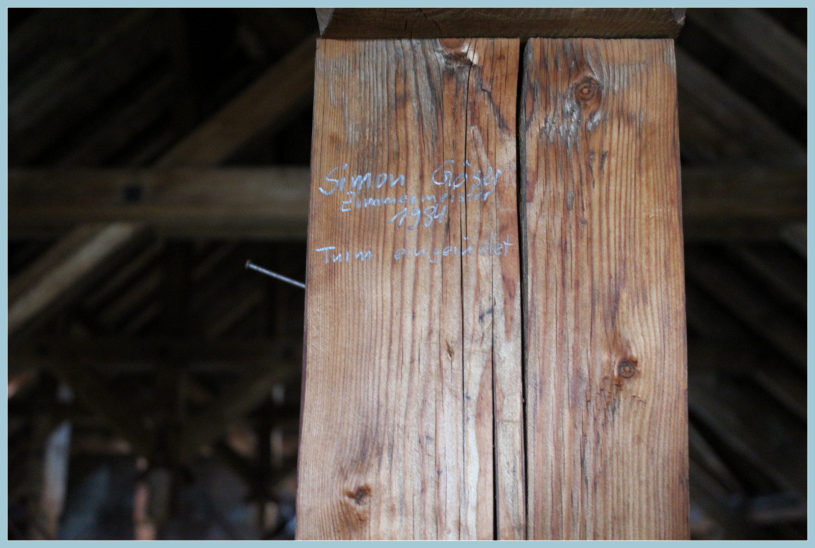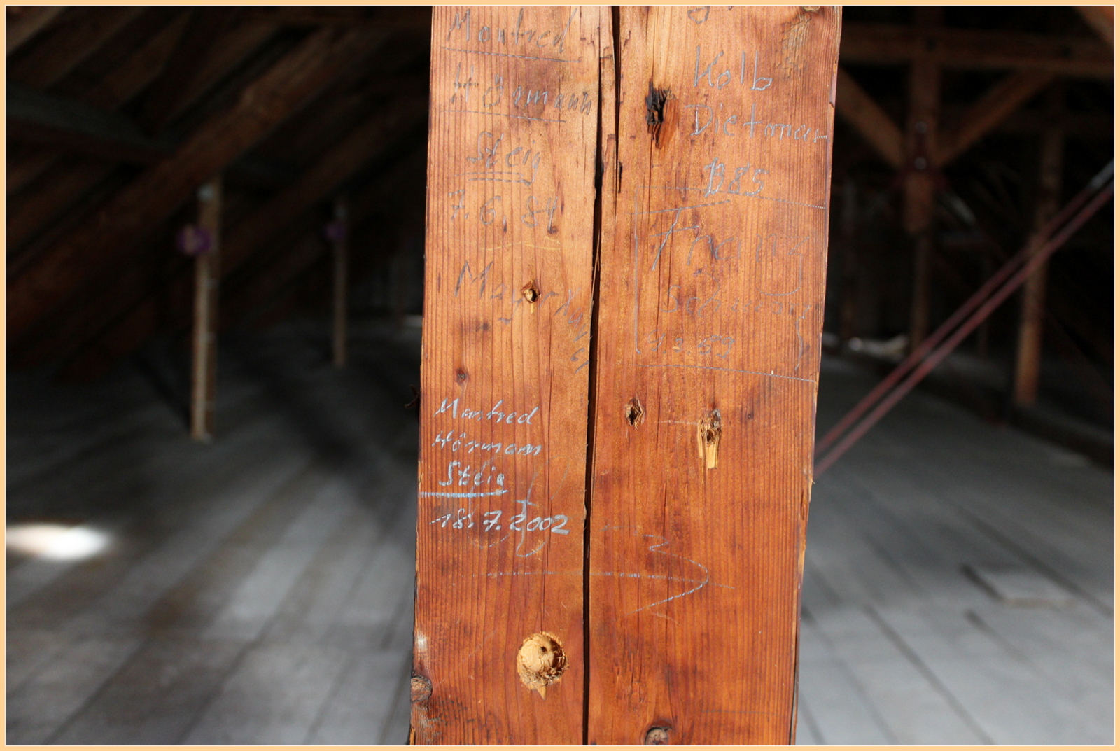Im Dachboden fand sich auch eine alte Ministrantentafel. Sie erleichterte die Organisation. Statt zu schreiben, wer wann und wo ministriert, wurden einfach die Stecker mit den Namen der Ministranten umgesteckt. Unter anderen ministrierten auch: Weixler Franz Xaver, Haug Hermann, Haug Jakob und Munding Karl.