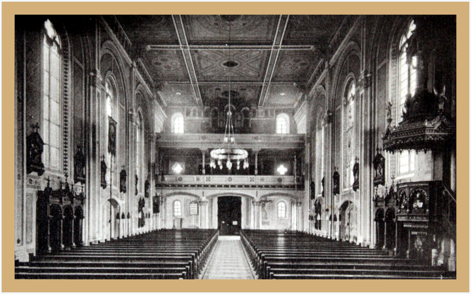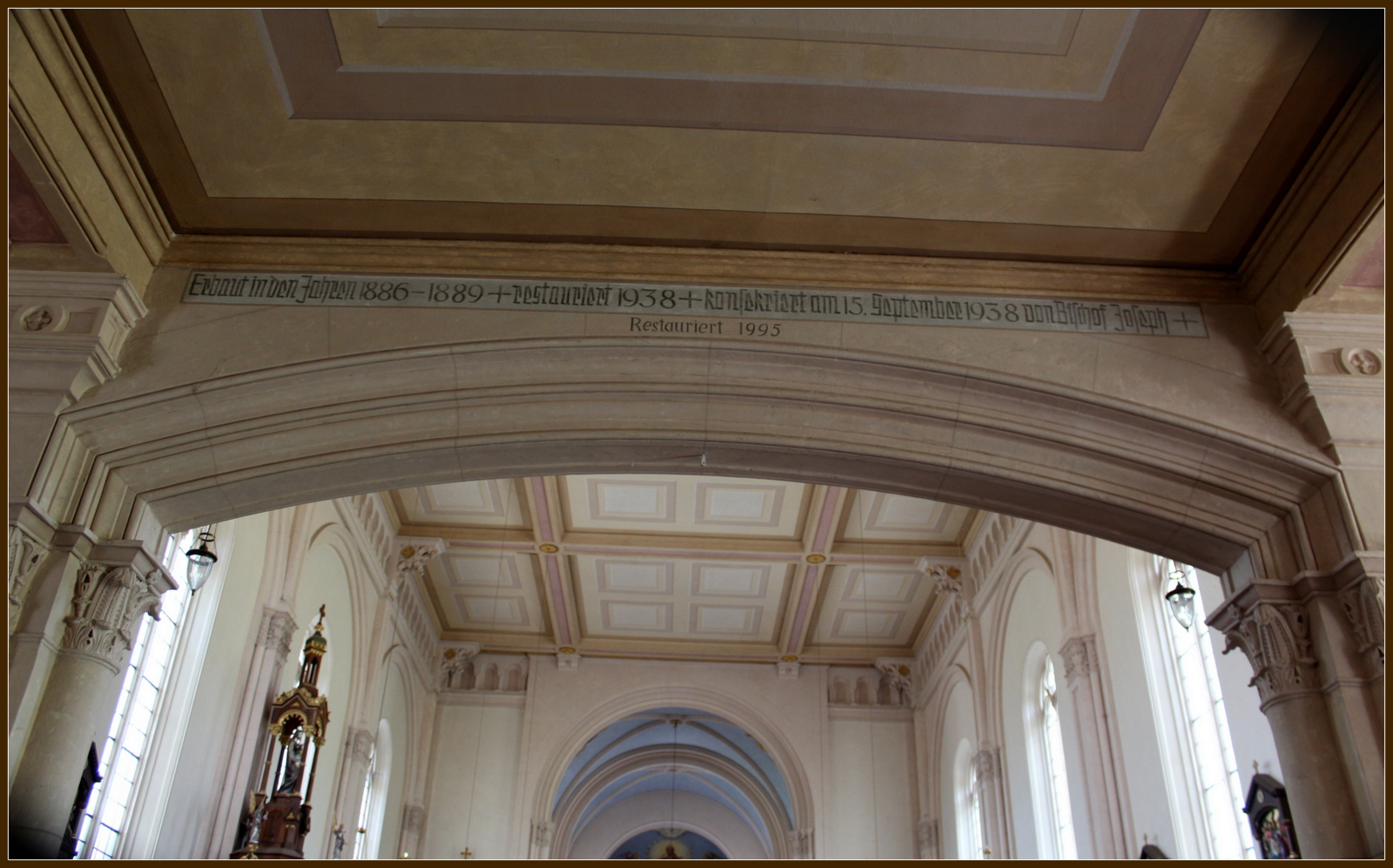 - Neues Foto: Zwei Fenster in der ersten Empore wurden geschlossen, so dass nur noch vier Fenster Licht spenden. Leider verdeckt die Orgel die große prächtige Rosette.