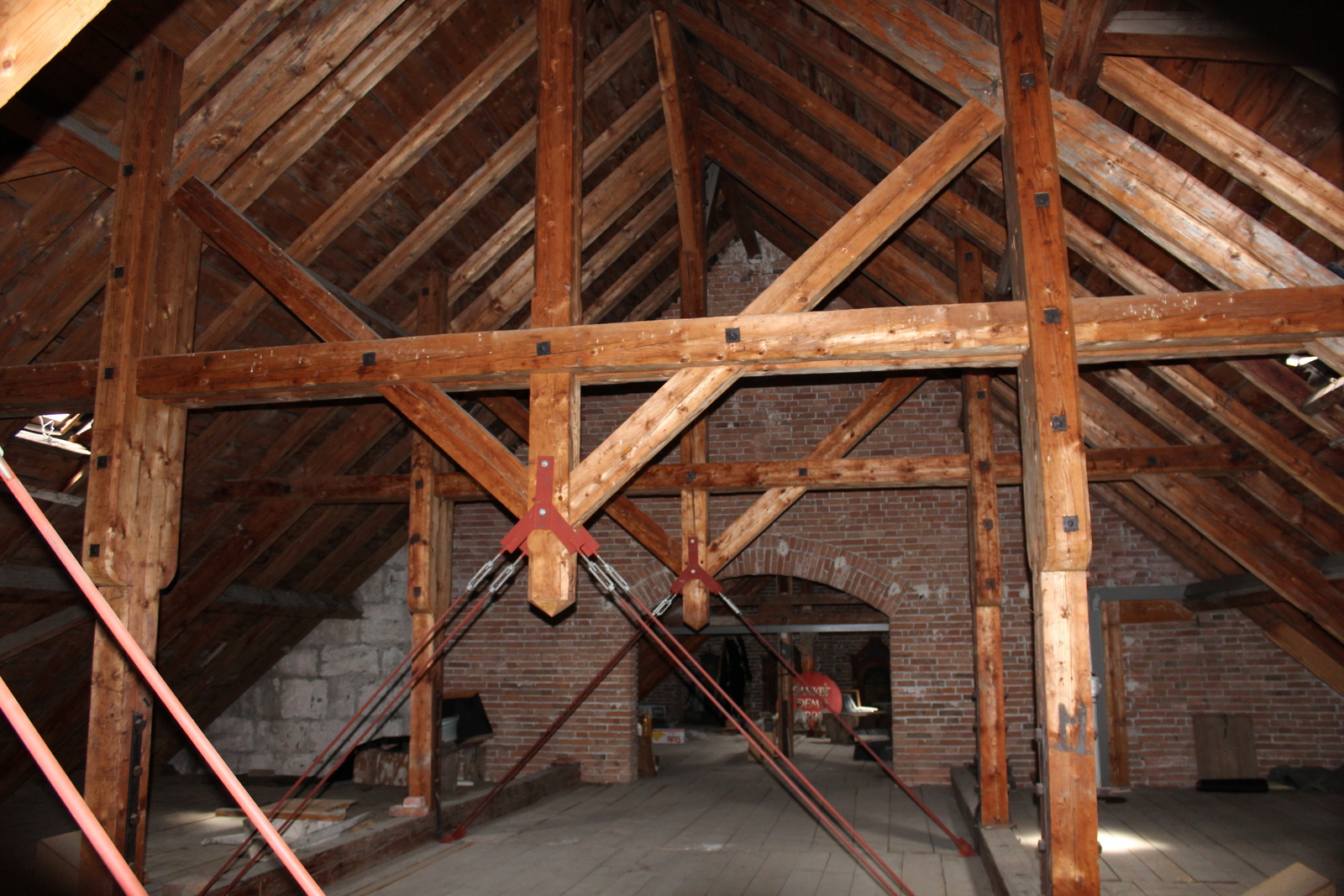 Das besonders große und breite Kirchenschiff besitzt keine Säulen, Pfeiler oder Zwischenwände. Deshalb waren im Dachstuhl lange starke Balken in der richtigen Anordnung notwendig. Später wurden noch Drahtseile gespannt, um den Dachstuhl dauerhaft zu stabilisieren.