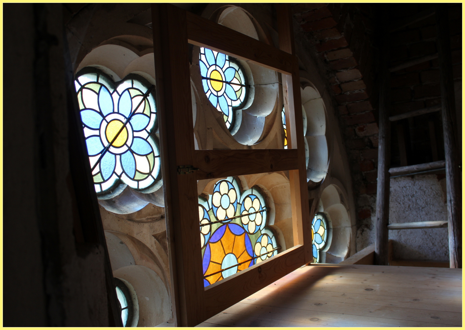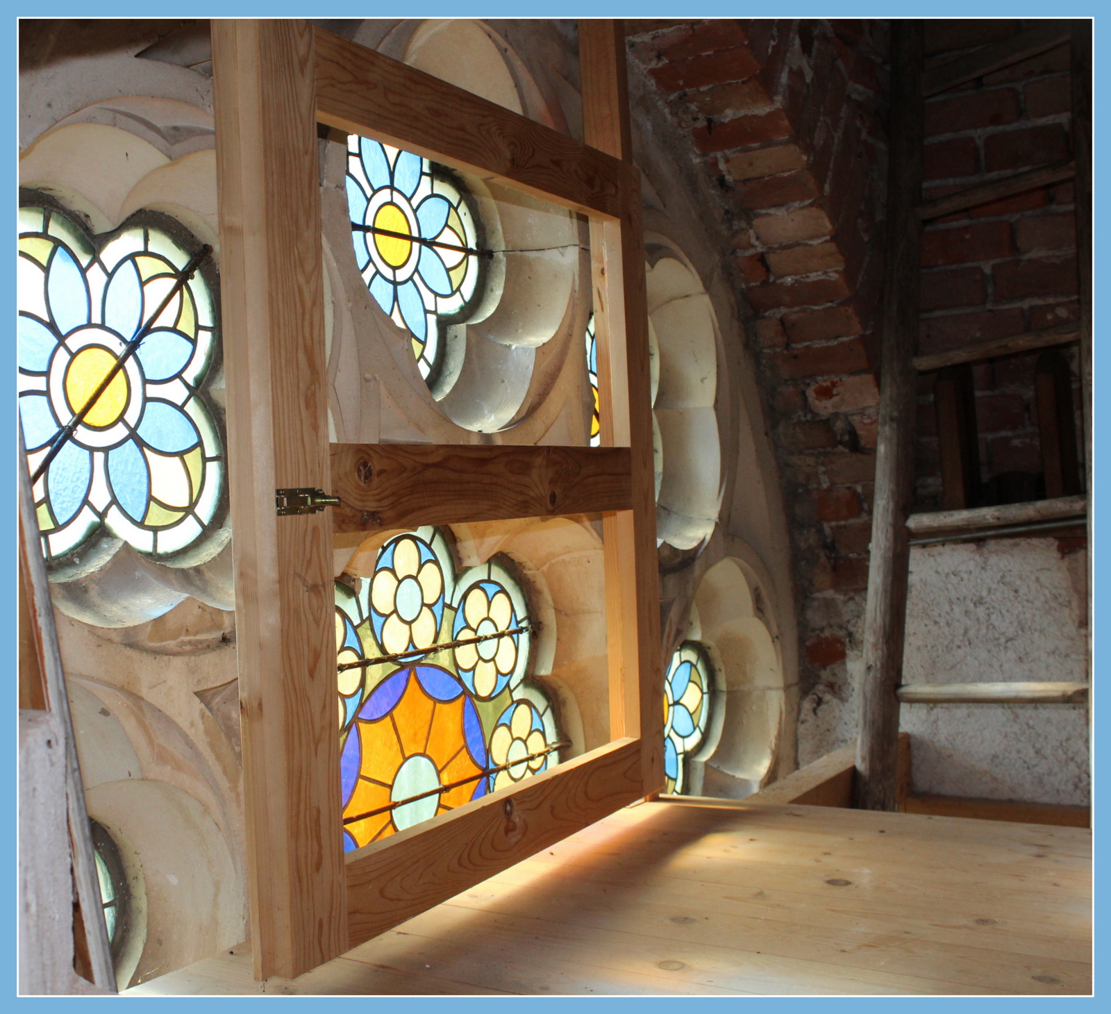 Steigt man im Innern der Kirche die steile Treppe von der ersten Empore zur zweiten Empore hoch , kommt man zu einem Punkt, von dem man einen Blick auf die Rosette werfen kann. Allerdings ist nur die halbe Rosette sichtbar. Offensichlich wurde die Orgel erst später gebaut. Seitdem versperrt sie den Blick auf die Rosette.