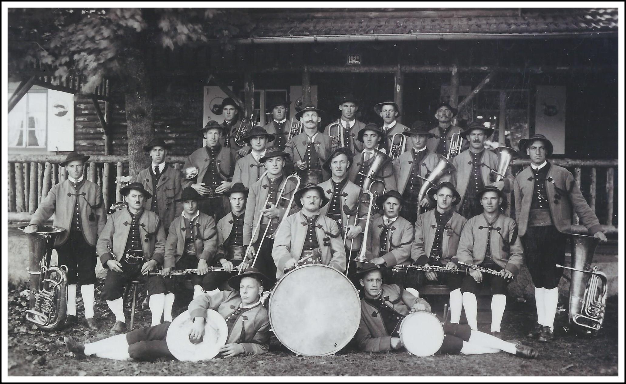 - Spielerhütte mit Musikanten auf den Höllwiesen. Dritte Reihe von unten, erster von links, August Reffler.