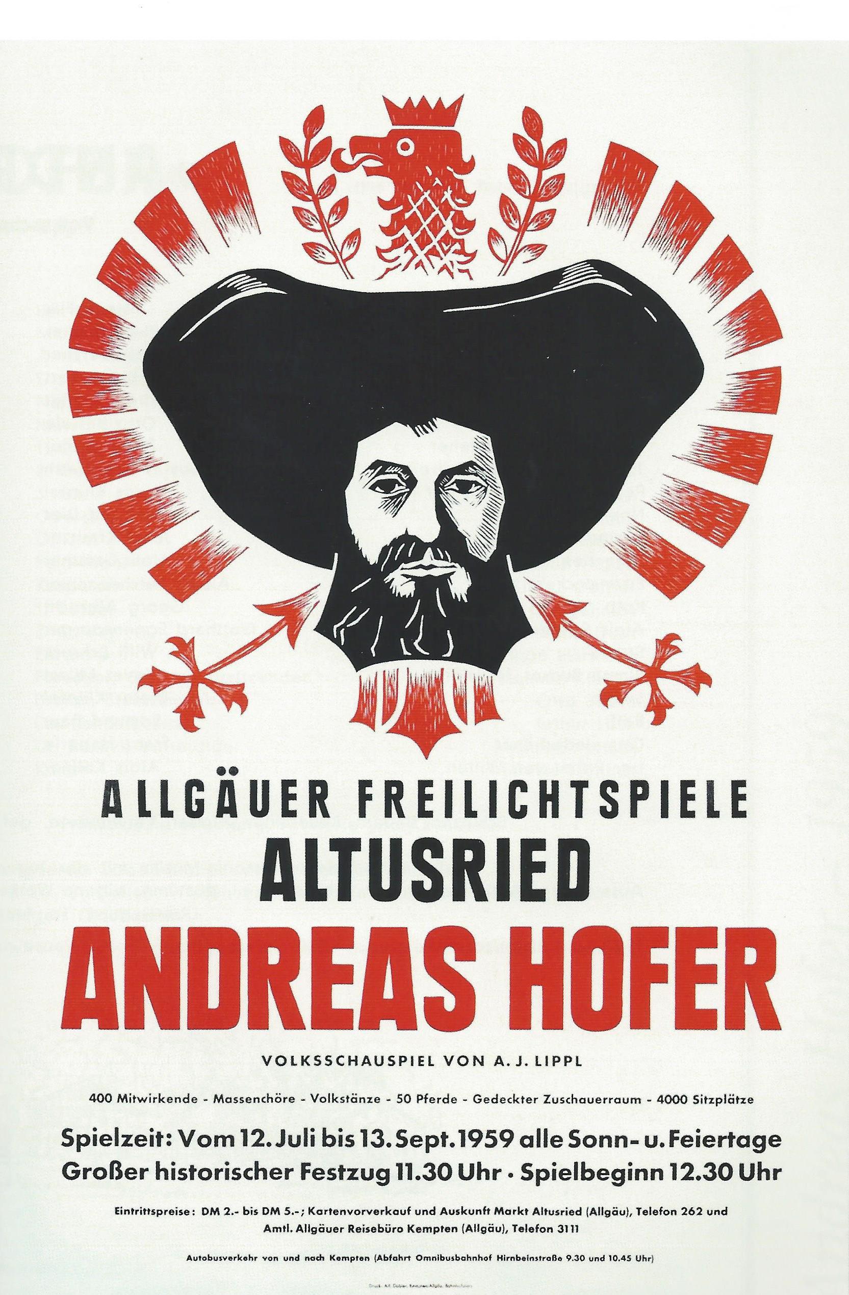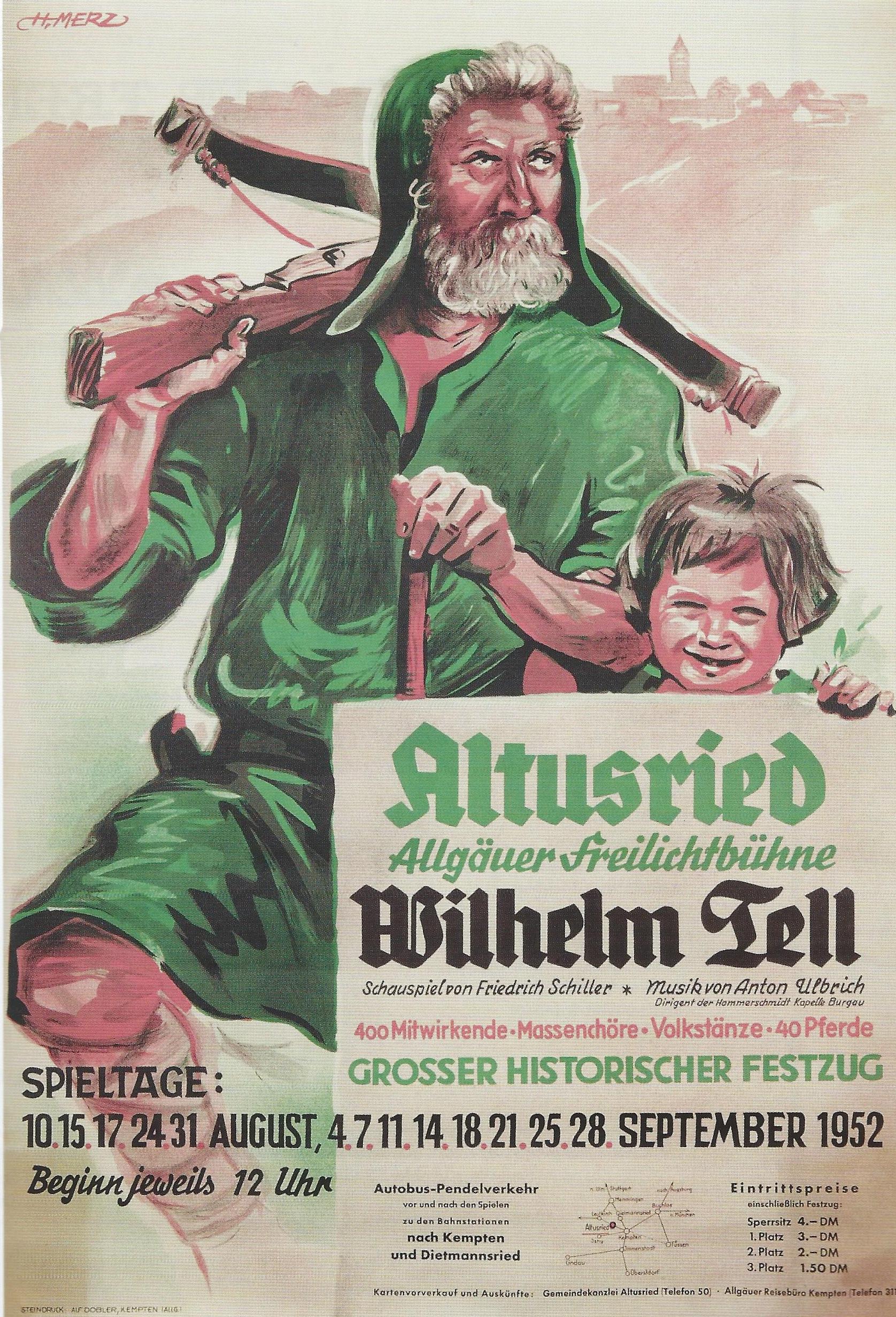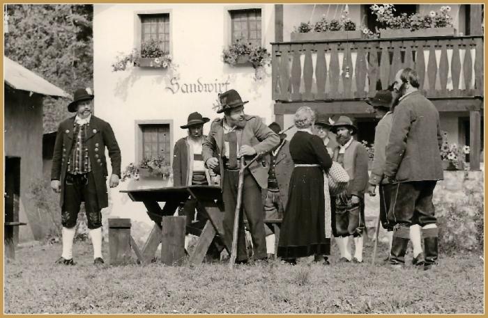 Unter den Altusrieder Freilichtspielen ist das Stück von Andreas Hofer am beliebtesten. Es hat Spannung und Tragik und ist ideal für eine Aufführung unter freiem Himmel. Damals spielte man nicht im Riedbachtobel sondern auf den Höllwiesen. Im Hintergrund das Rauhanwesen. Es steht weit und breit allein.