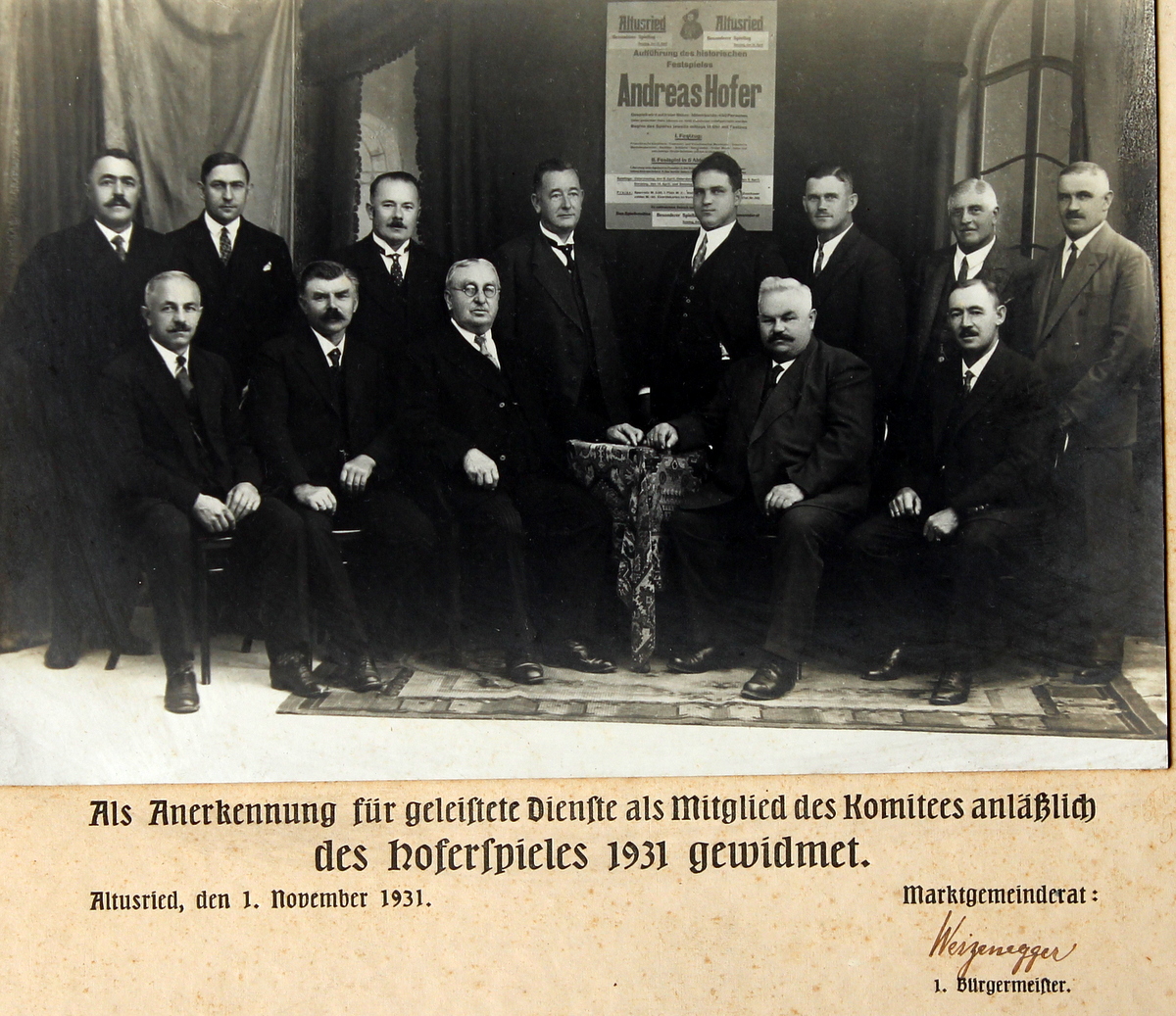Als Anerkennung für geleistete Dienste als Mitglied des Komitees anlässlich des Hoferspieles 1931 gewidmet.