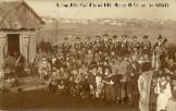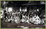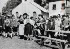 1911 Andreas Hofer - Spiel Gruppe Marcketenderinnen, links das alte Pfarrhaus, rechts die alte Schule, bzw. Pfarrheim