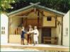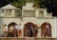 Links das schön gestaltete Lagerhaus, rechts ein hölzerner Leiterwagen