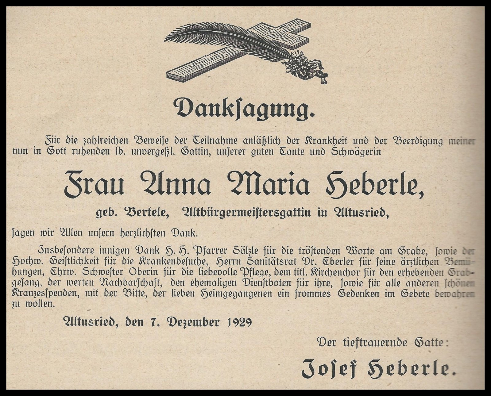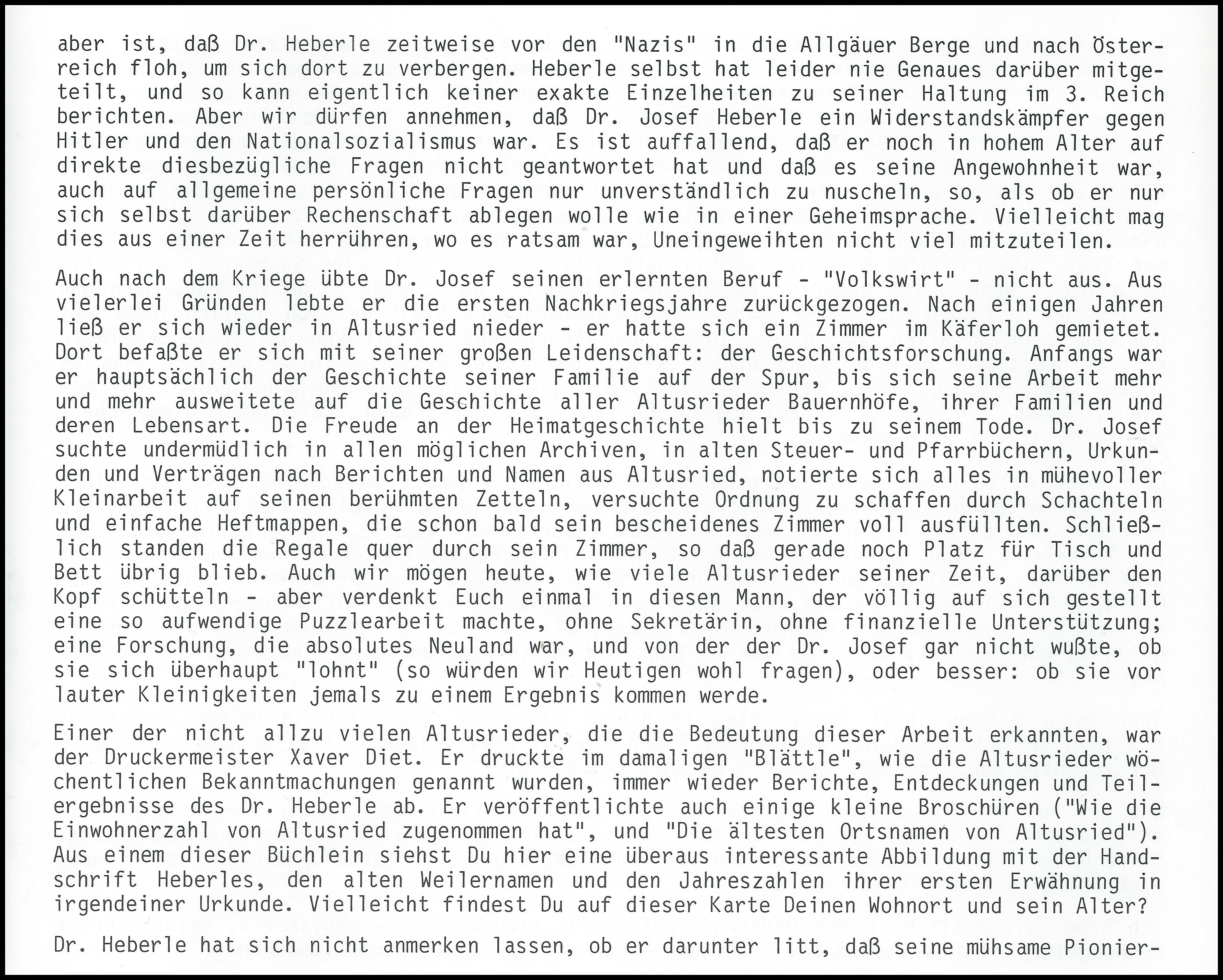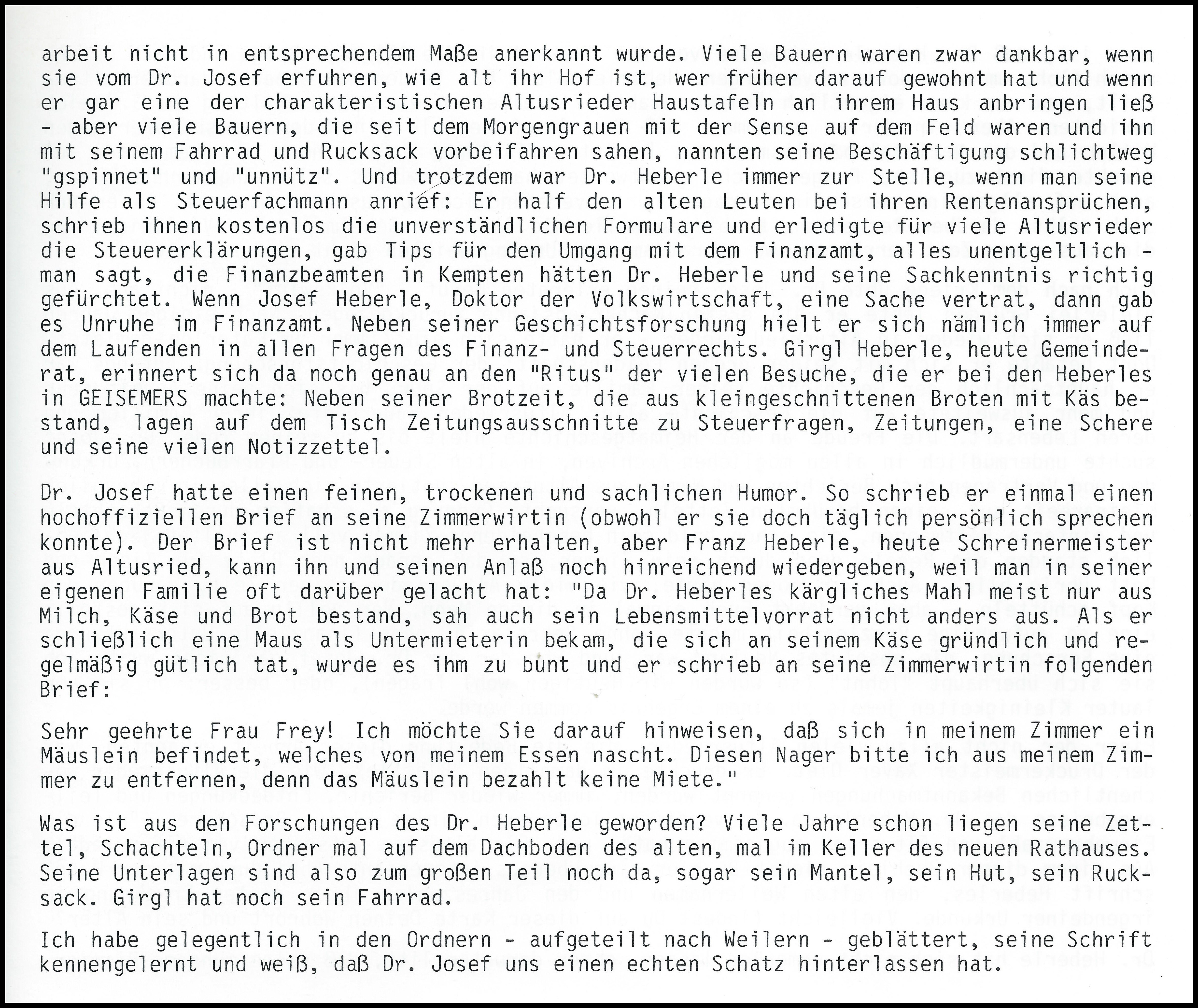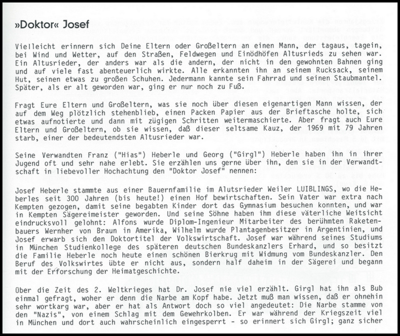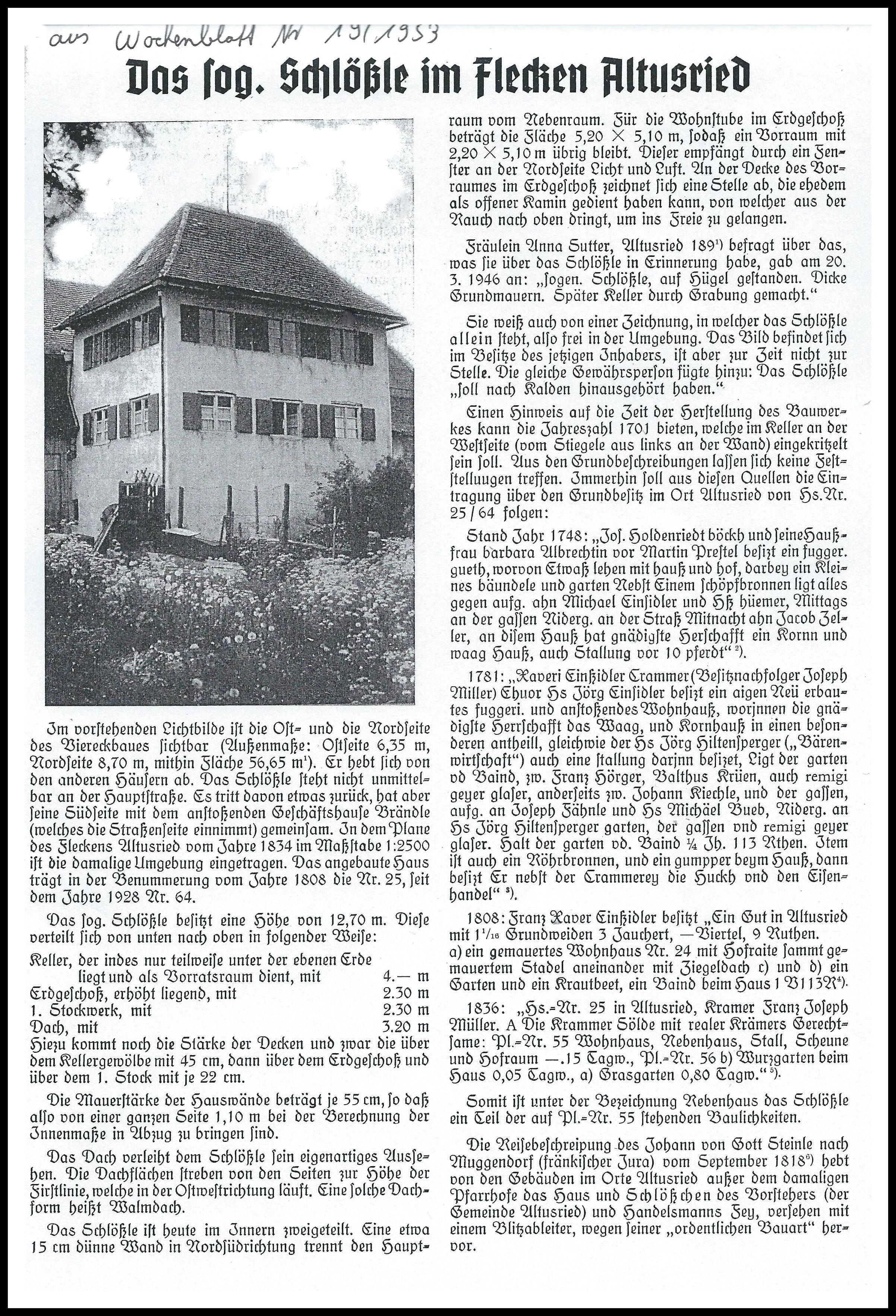 Ein Haus von dem nichts übrig blieb, ist das Schlössle von Altusried. Anno 1953 besteht es noch. Dr. Joseph Heberle beschreibt es und erzählt seine Geschichte im Wochenblatt Nr.19 von 1953. Es stand neben dem Kaufhaus Brändle, etwas zurückgesetzt. Beide Gebäude wurden beseitigt zugunsten eines Neubaus. So ist der Heberleartikel nur noch ein Nachgesang von dem, was einst war. Was noch von Dr. Joseph Heberle blieb, sind die im Blättle abgedruckten Forschungen, die Erinnerungen an ihn und sein Fahrrad. Georg Heberle hat es aufgehoben.