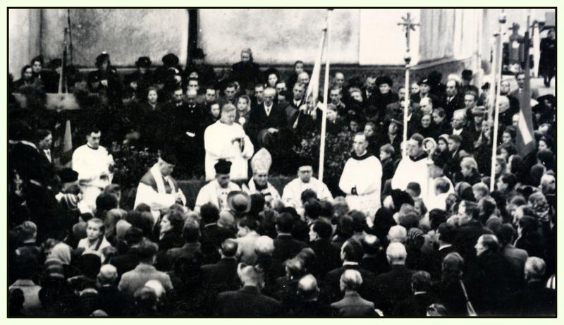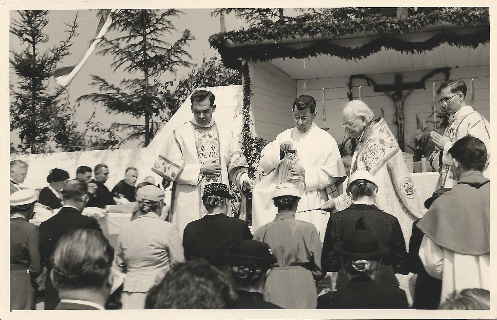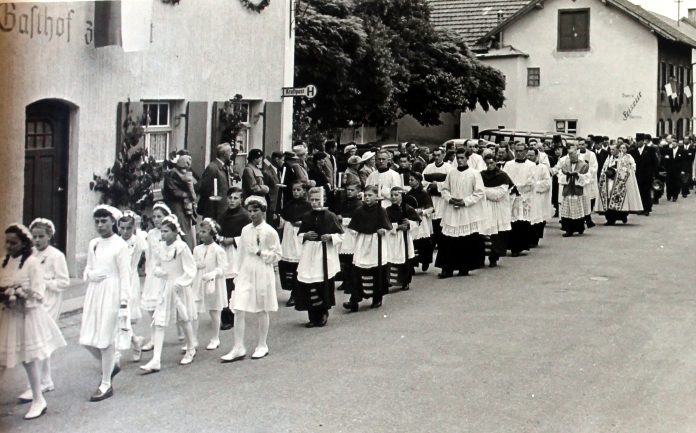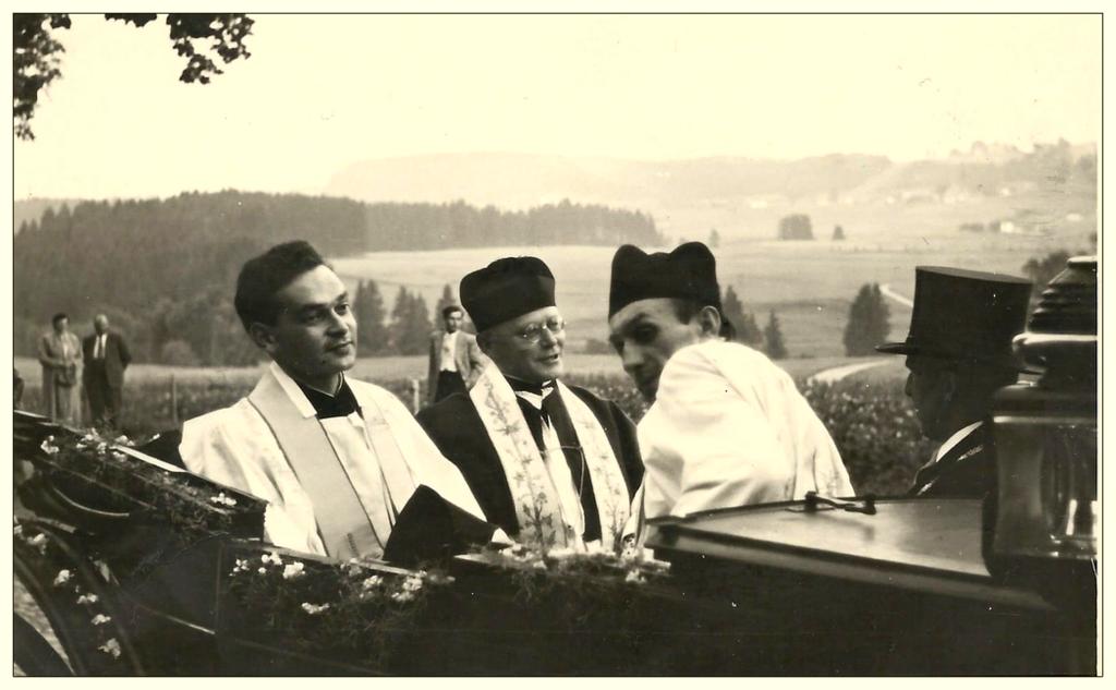 1. Pater Karl Albrecht mit Hostie, links von ihm Pfarrer Heribert Steiner , links außen Pfarrer Miller und Pater Leo vom Kloster Ottobeuren