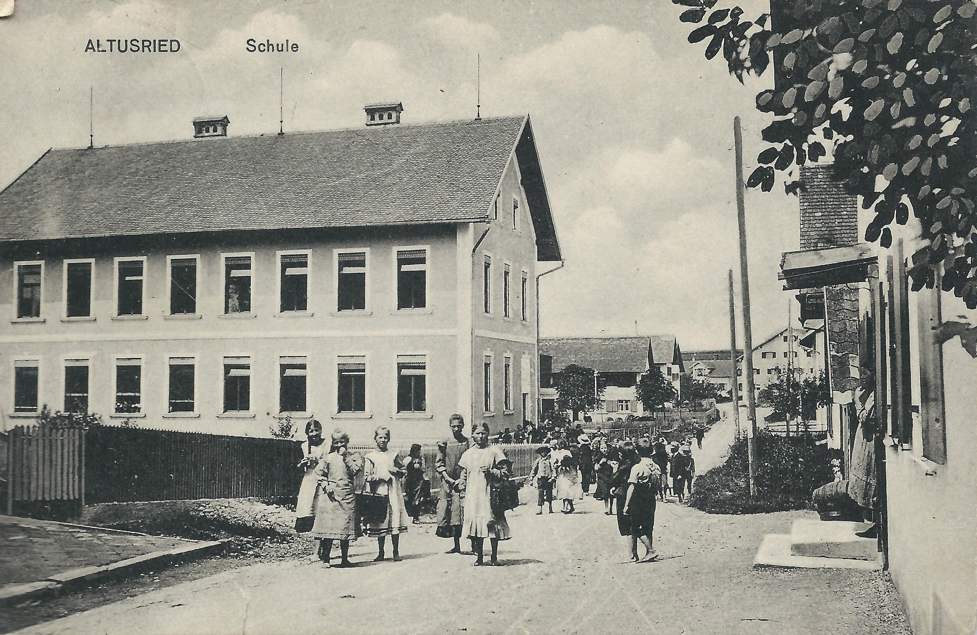 Bekannt ist, das Foto entstand im Photo Atelier Clemens Berger Kempten-Altusried. Die Kleidung von Lehrer und Schüler hat einen etwas militärischen Schnitt, es ist wohl die Zeit des 1. Weltkrieges. Vermutung: Eine Altusrieder Klasse hat sich vor dem Rössle Gasthaus aufgestellt. Rechts ein landwirtschaftliches Gebäude vom Rössle.