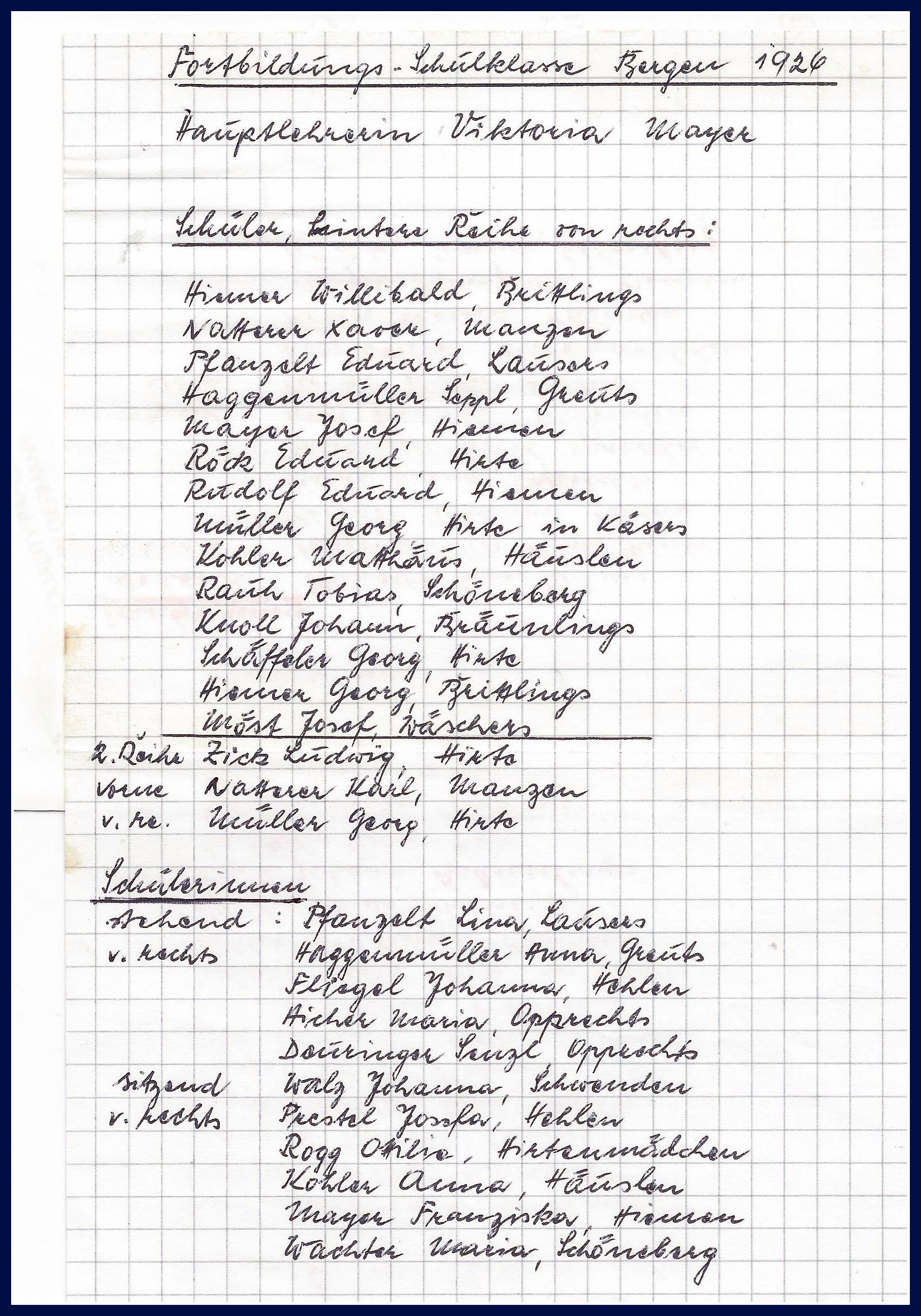Fortbildungs-Schulklasse Bergen 1925 mit Hauptlehrerin Viktoria Mayer: Die Lehrerin und drei Schüler tragen Bücher als Zeichen der Gelehrsamkeit. Zwei ältere Schüler haben stolz ihre Uhrketten umgehängt. Noch gab es keine Kindermode, die Kleinen tragen für diesen Anlass dasselbe, was Große tragen. Aus dem Fenster schaut halb verdeckt eine Frau heraus. Vermutlich ist es die Mutter von Viktoria Mayer.