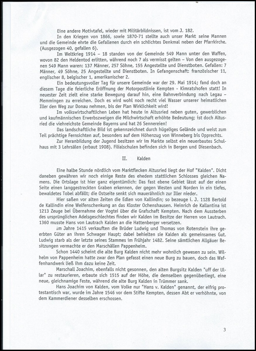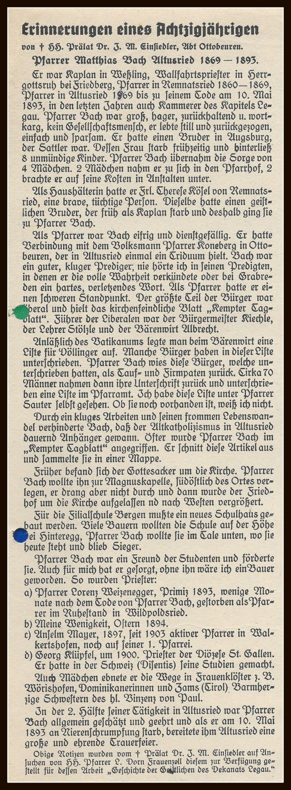 - Im Wochenblatt veröffentlichte Joseph Maria Einsiedler seine Erinnerungen an den Altusrieder Pfarrer Matthias Bach 1869- 1893. Sie geben einen interessanten Einblick in das Zeitgeschehen.