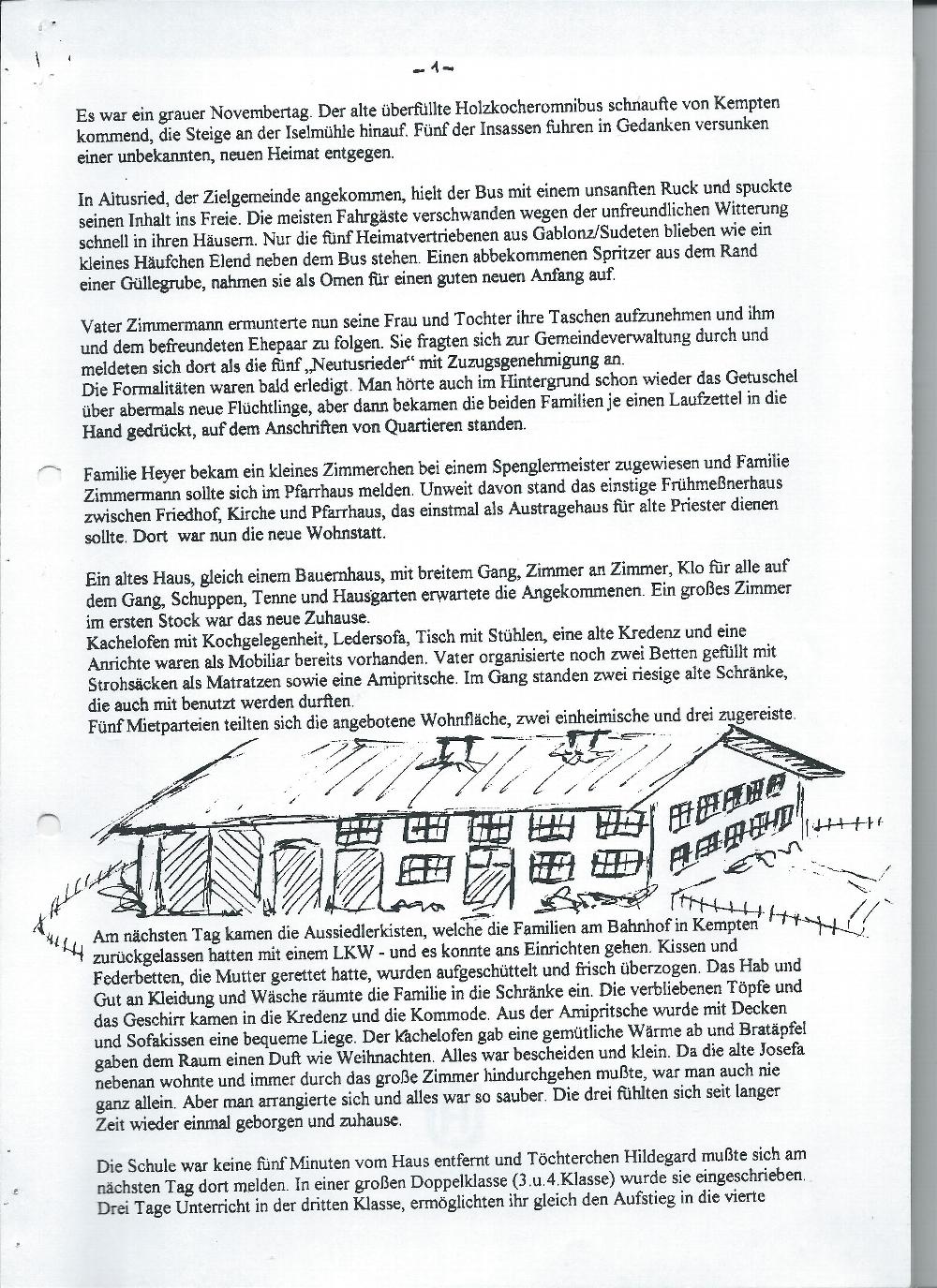 1945 und 1946 wurden drei Millionen Sudetendeutsche aus ihrer Heimat vertrieben. Eine Million davon fanden Zuflucht in Bayern. Mit Recht werden sie heute neben Altbayern, Schwaben und Franken als der vierte Stamm bezeichnet. Ohne die Schaffenskraft der Zuwanderer wäre der wirtschaftliche Aufschwung nach dem Krieg nicht möglich gewesen. Der folgende Bericht handelt über die Ankunft und das Sicheinleben der Familie Zimmermann in Altusried. Joseph Zimmermann spielte in den Fünziger und Sechziger Jahren noch eine wichtige Rolle in Altusried. Er war Theatermann, Regisseur für die Freilichtspiele, Reiseleiter, Bücherwart und zuständig für den Fremdenverkehr.