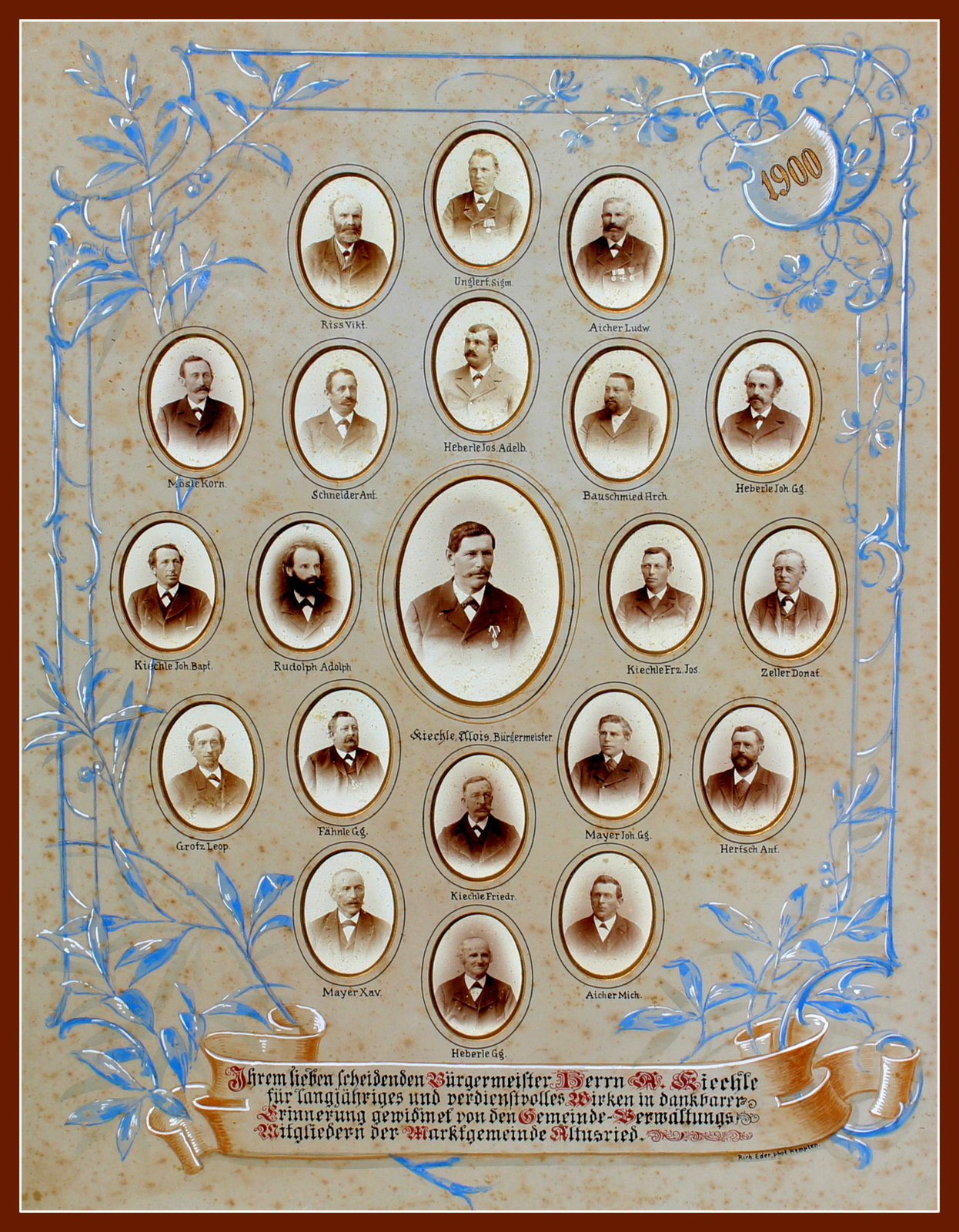 Ihrem lieben, scheidenen Bürgermeister A. Kiechle für langjähriges und verdienstvolles Wirken in dankbarer Erinnerung gewidmet von den Gemeinde - Verwaltungs Mitgliedern der Marktgemeinde Altusried.
