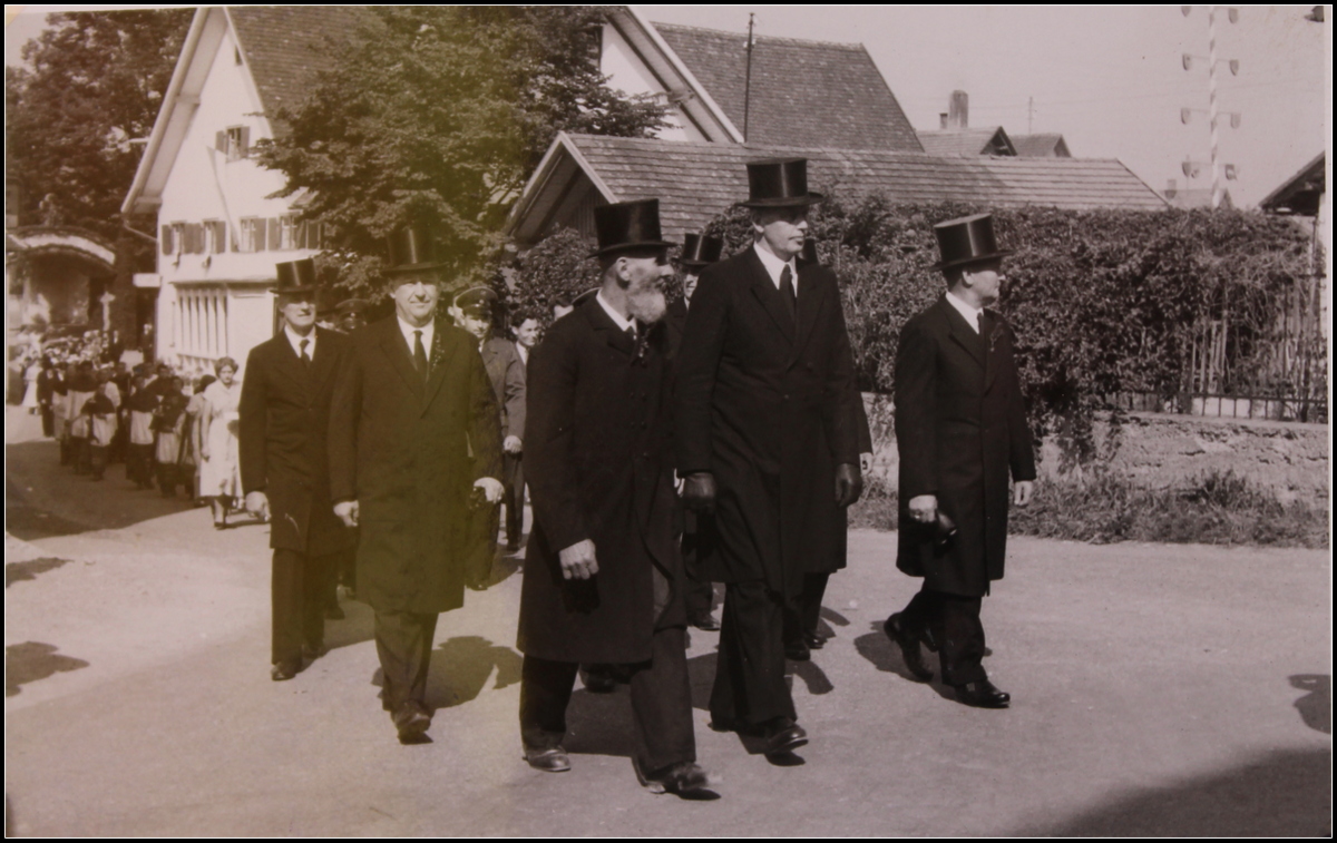 Das letzte Bild zeigt das alte Rathaus, ein Festzug geht vorbei. Der VW Käfer mit dem ovalen Heckfenster zeigt, dass wir die Mitte der Fünfzigerjahre haben. Zwischen Rathaus und Kaufhaus Brändle erkennen wir das Schlössle.