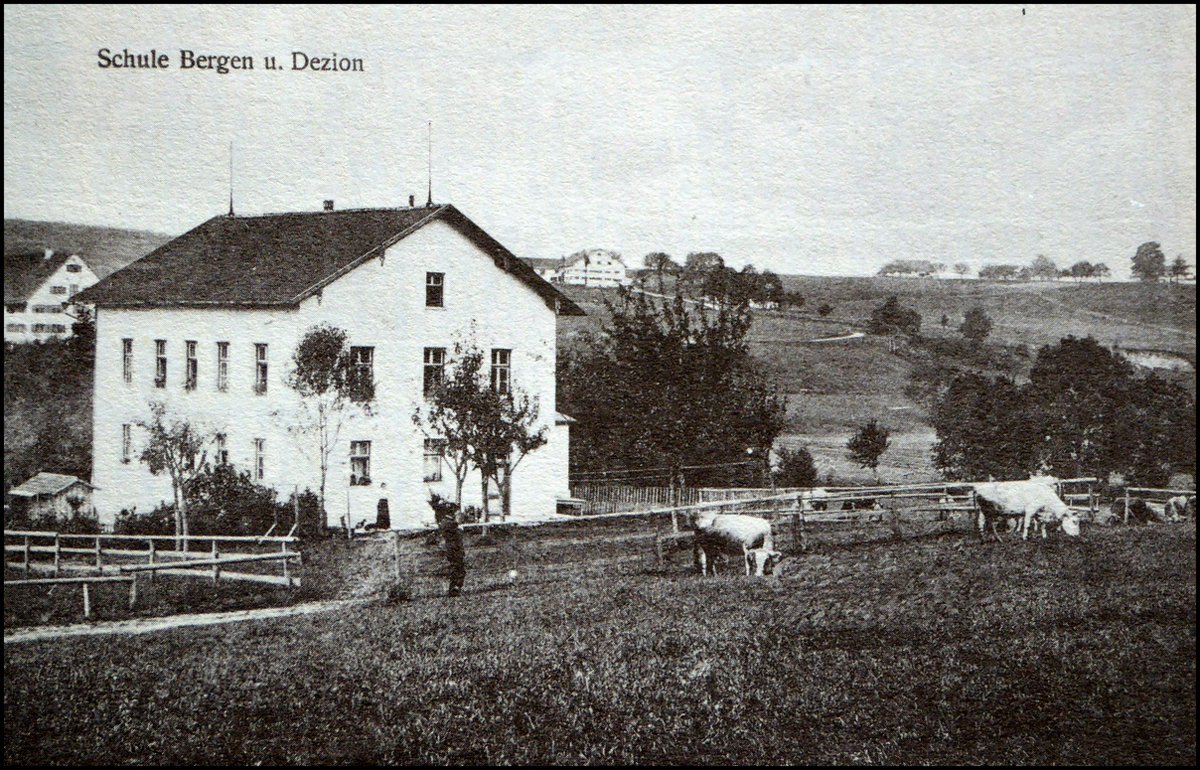 Die Oberklasse der Schule Bergen mit dem 5., 6. und 7. Jahrgang ist hier abgebildet. Damals dauerte die Schulpflicht nur sieben Jahre. Zwischen Pfarrer und Lehrer steht die Schülerschar still. Der Lehrer ist Hauptlehrer L. Mayer, der Vater von Viktoria Mayer.