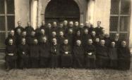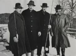 Pfarrer Sälzle zweiter von links, auf der unteren Treppenstufe zwei Kapuzinerpater, die als Volksmissionare die Volksmission durchführten. Unter Volksmission verstand man Aktivitäten zur Glaubenserneuerung.